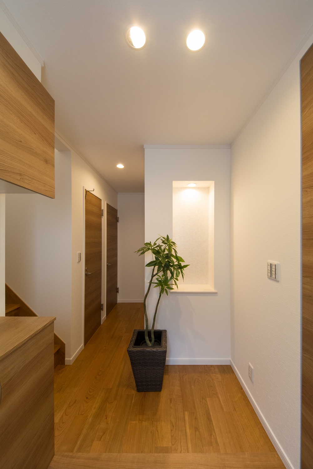 玄関にはニッチカウンターを設置。ご家族の写真や絵画などをディスプレイしてお気に入りの場所に。