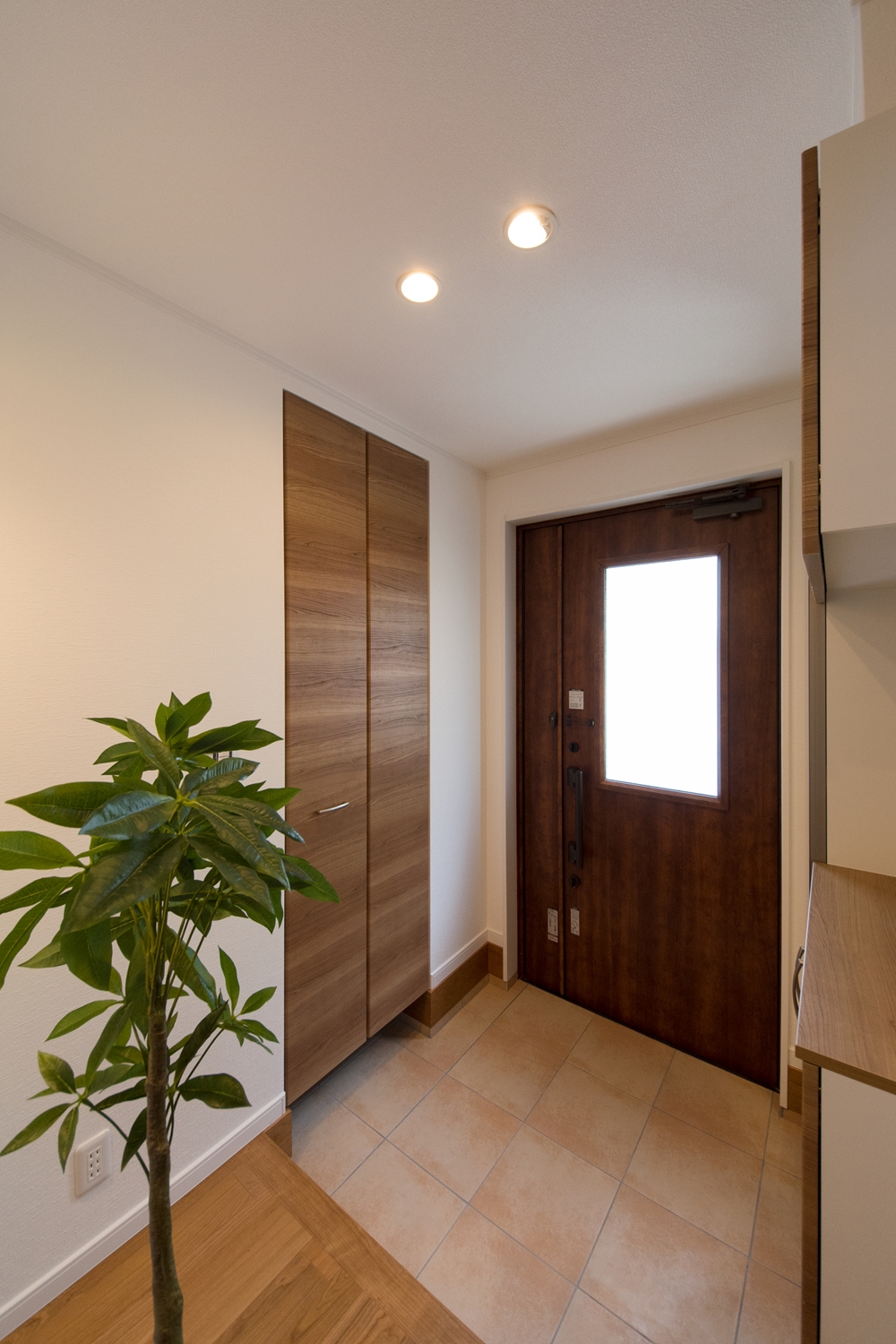 シューズクロークのある便利な玄関。木の温もり感じる暖かみのある空間に。