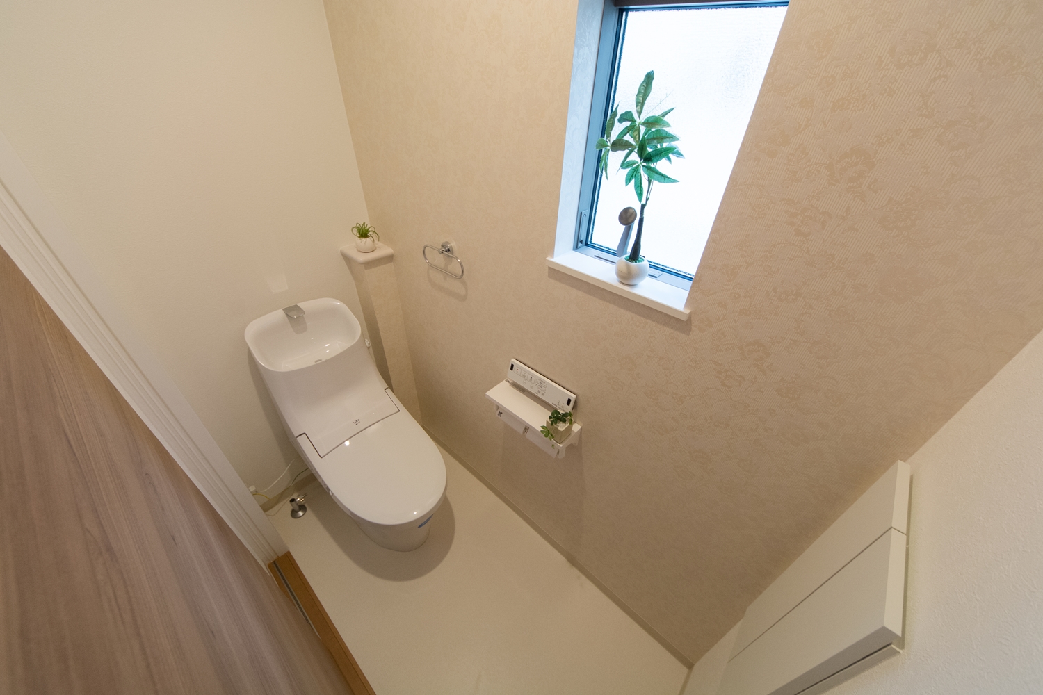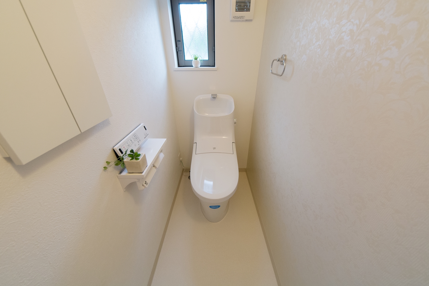 1Fトイレ/パステルトーンの花柄アクセントクロスが、エレガントな空間を演出。