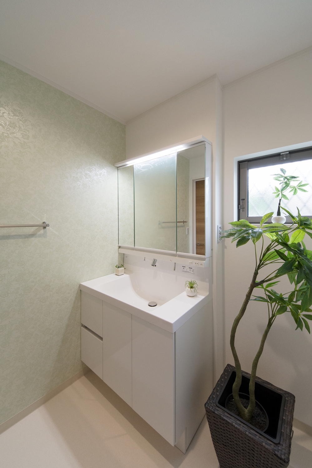 サニタリールーム/パステルトーンの花柄アクセントクロスが、エレガントな空間を演出。