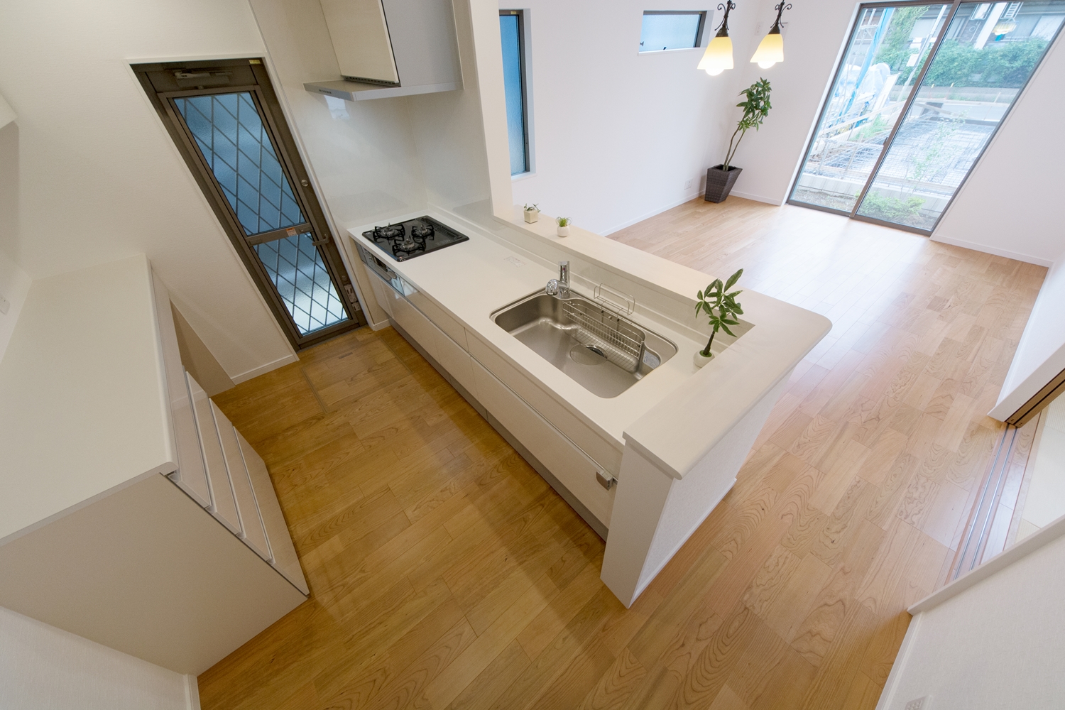 爽やかな白い木目調のキッチン扉。清潔感溢れるキッチンスペース。