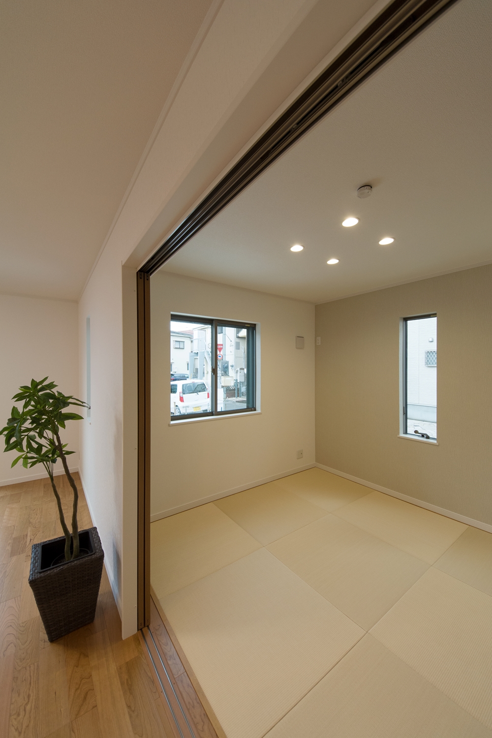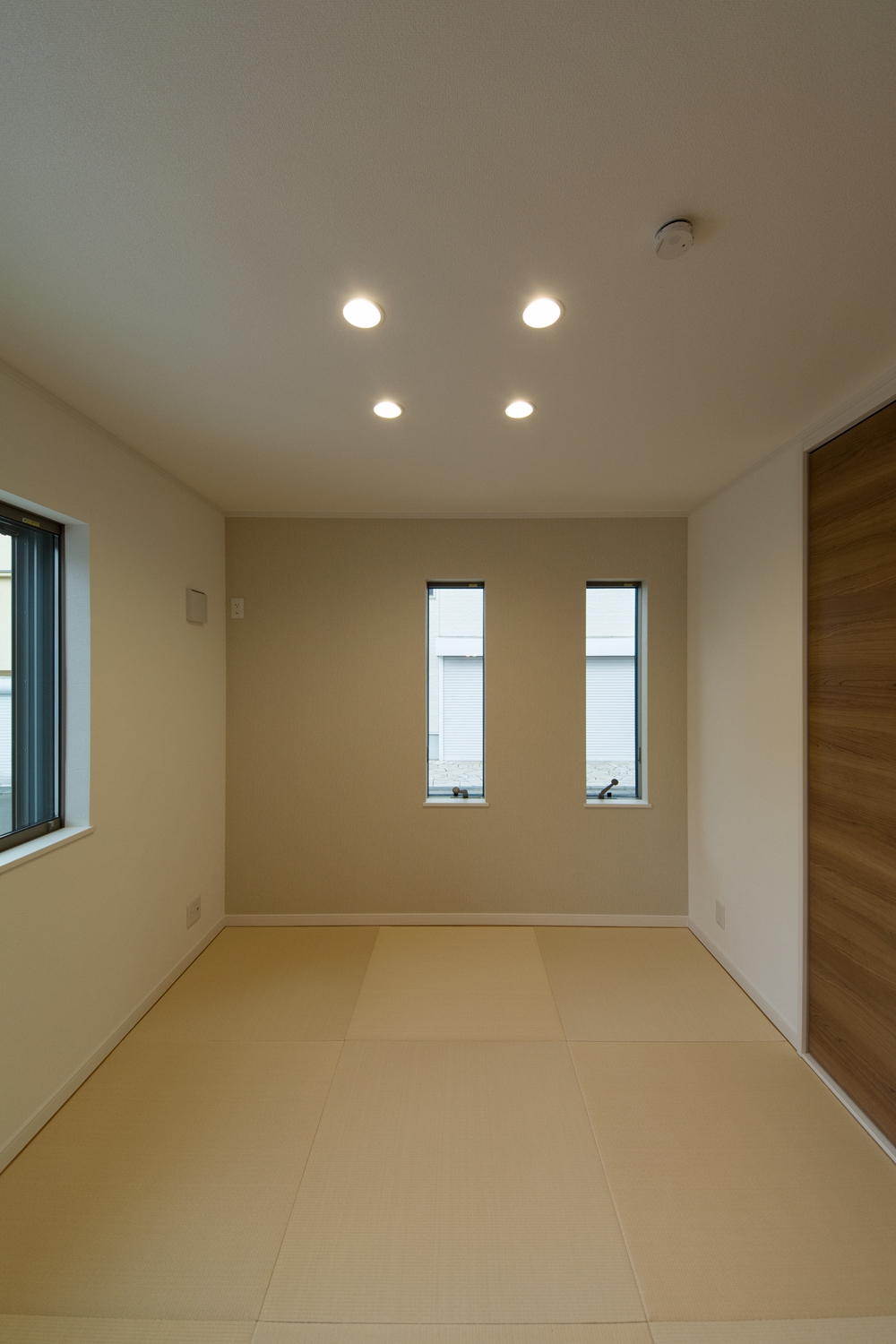 アイボリーのアクセントクロスと縁なし畳の優しい色使い。モダンな空間の1F畳敷き洋室。