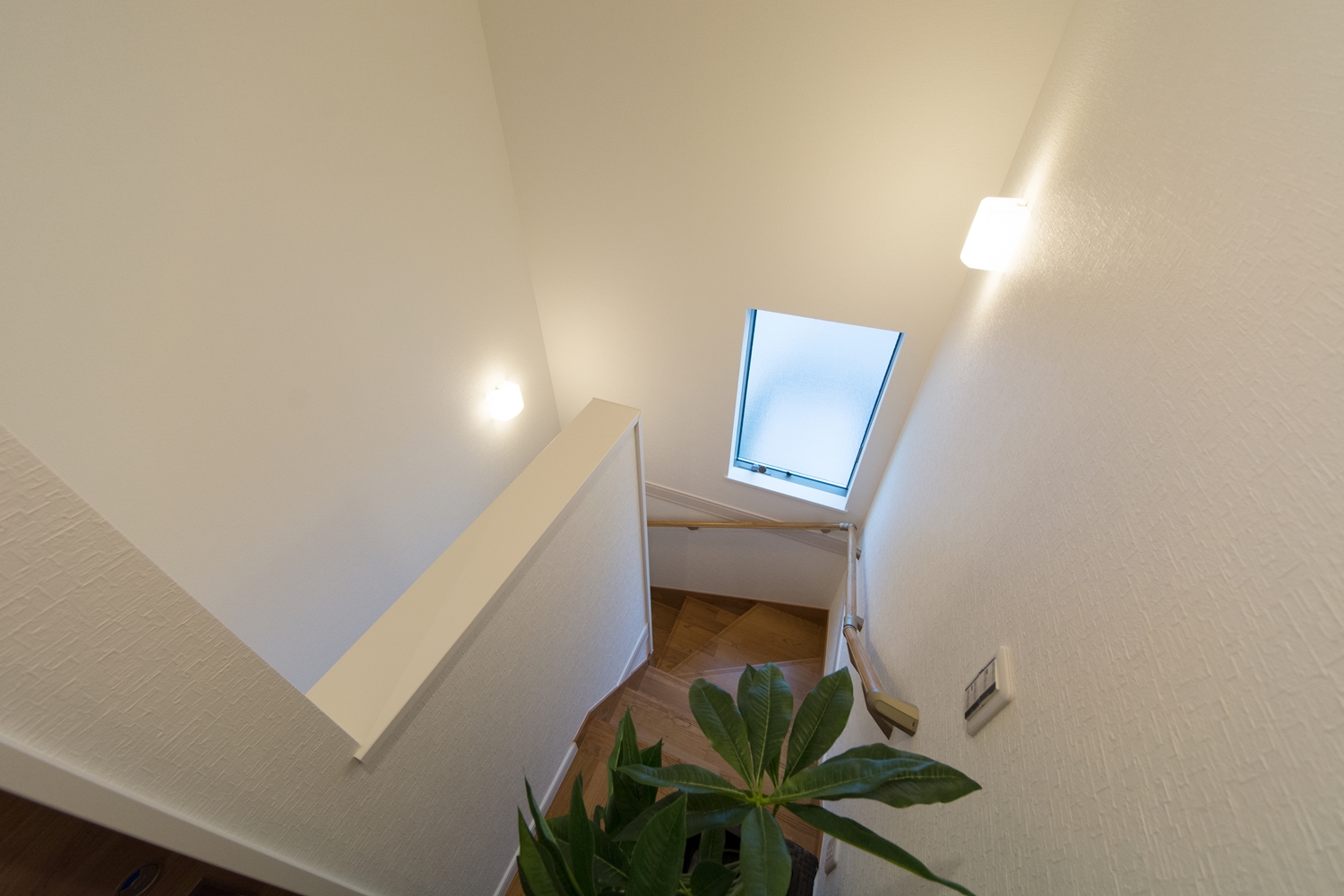 窓からの自然光とブラケットライトのやわらかい光が階段を照らします。