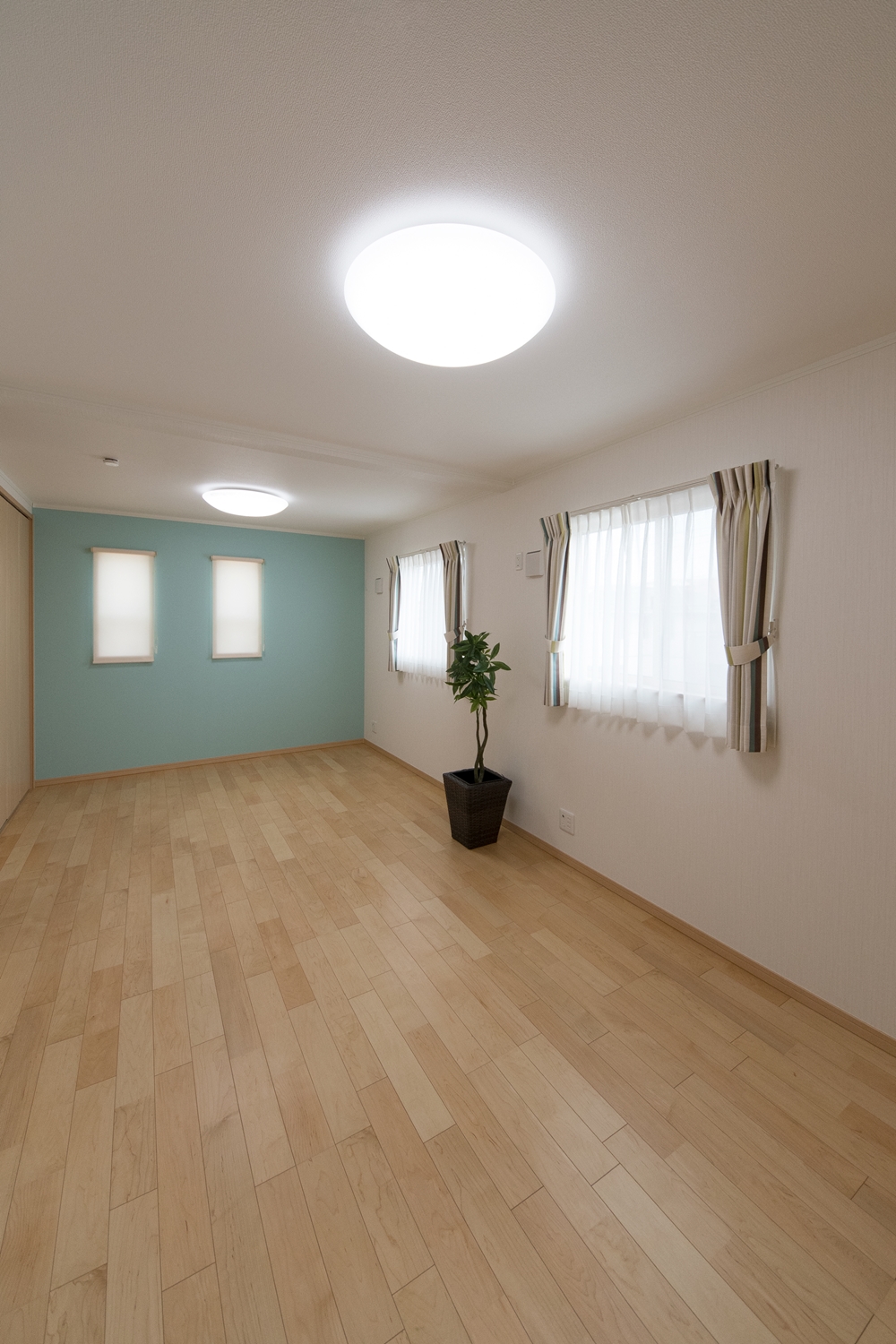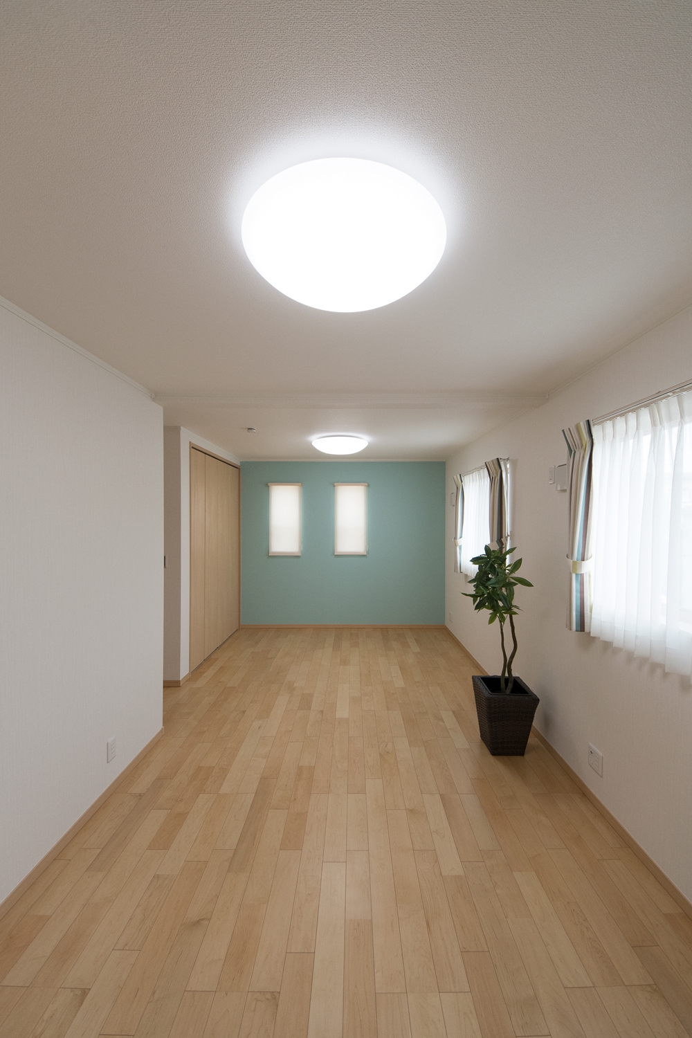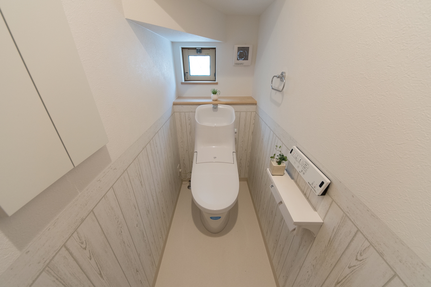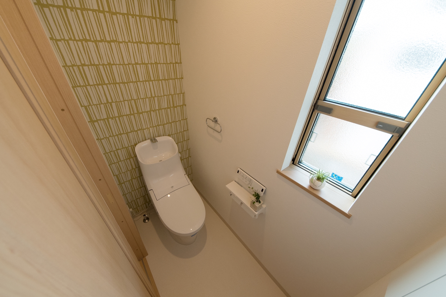 ブラックの木目調サイディングに、白のサッシでアクセントをつけたナチュラル&モダンな外観に仕上がりました。2階洋室やトイレには空間を彩るアクセントクロスを施し、インテリアコーディネートを楽しみます。