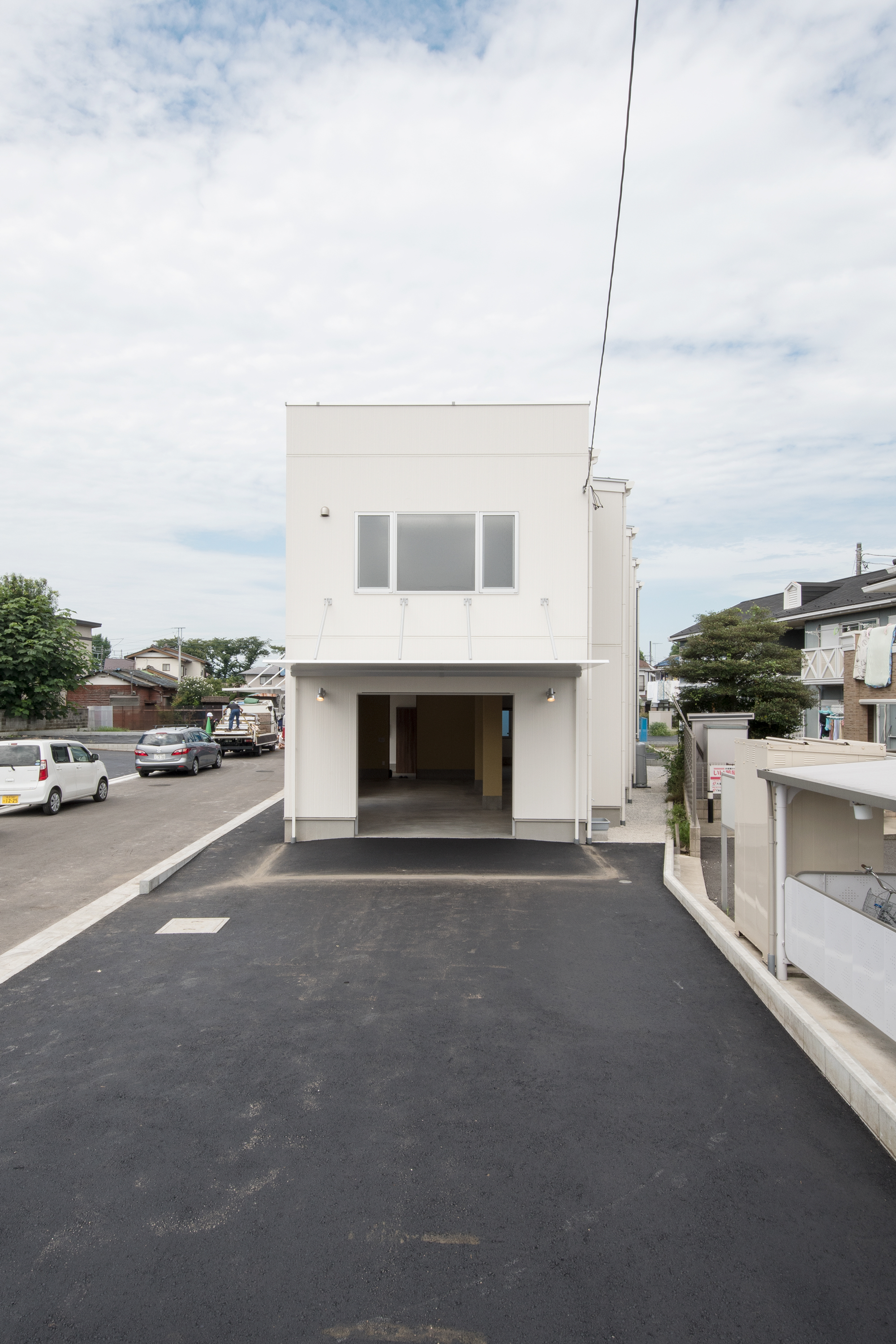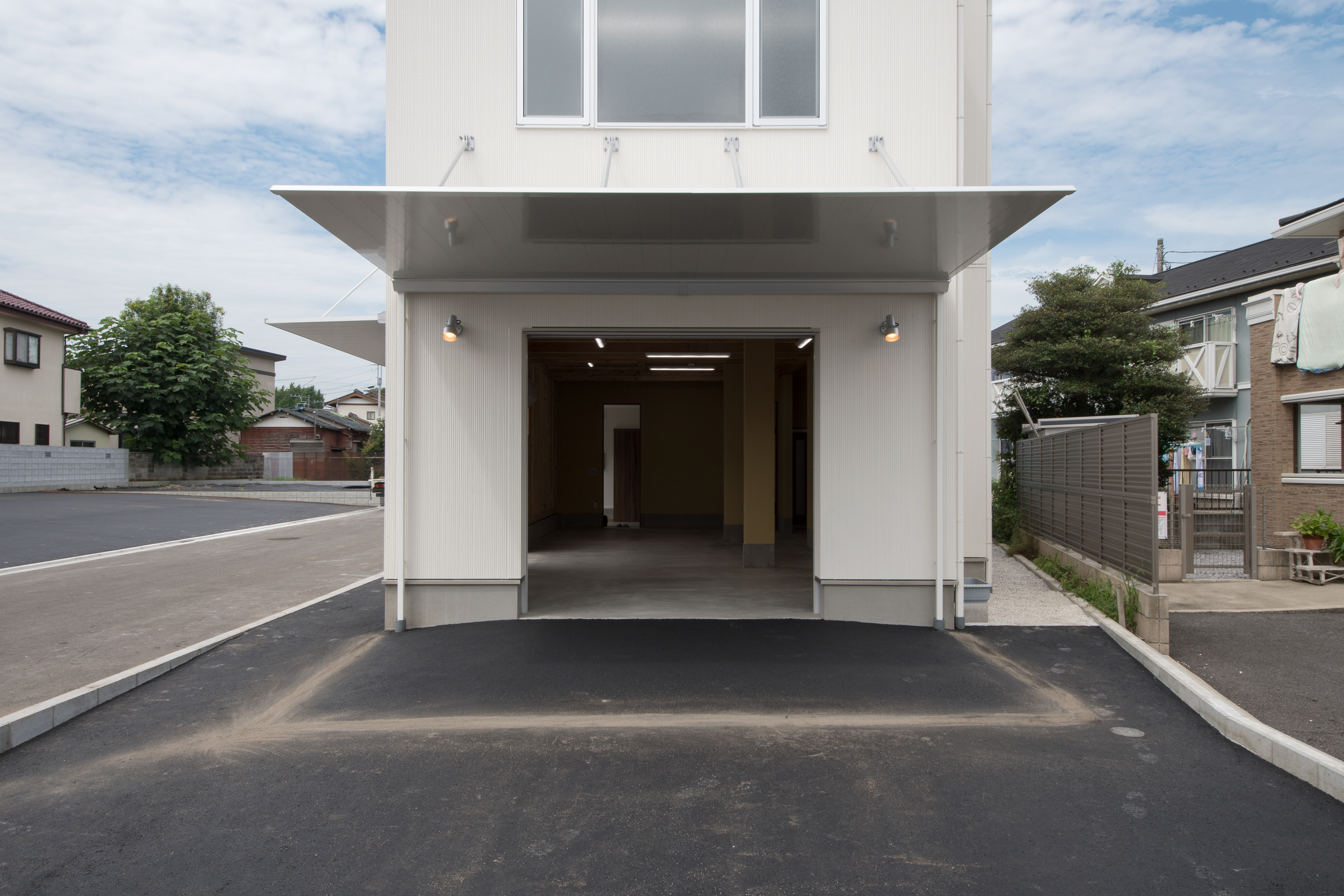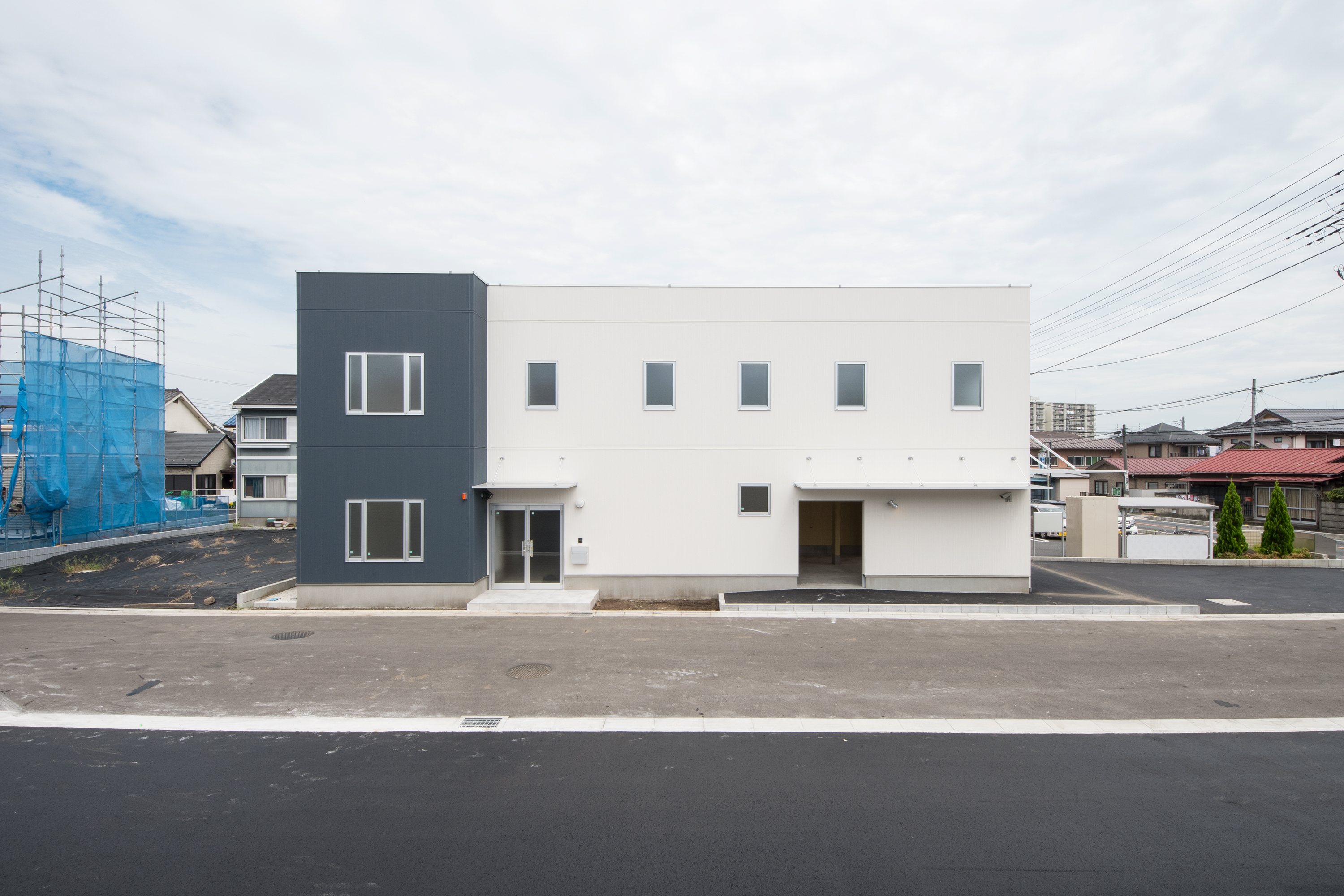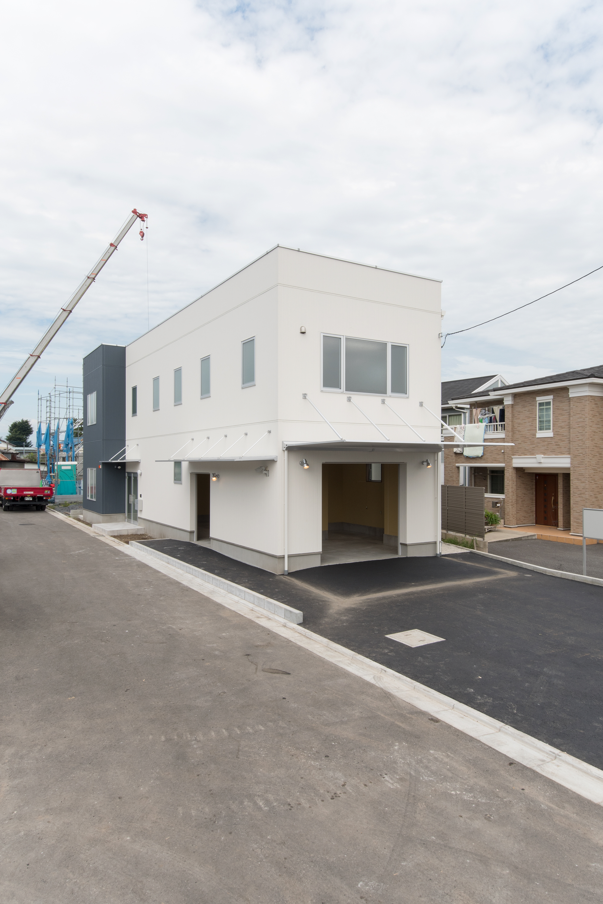 白にモノトーン系のブルーをアクセントにした、シンプル&モダンな箱型の外観。快適で実用的な「オフィス兼倉庫」が完成しました。