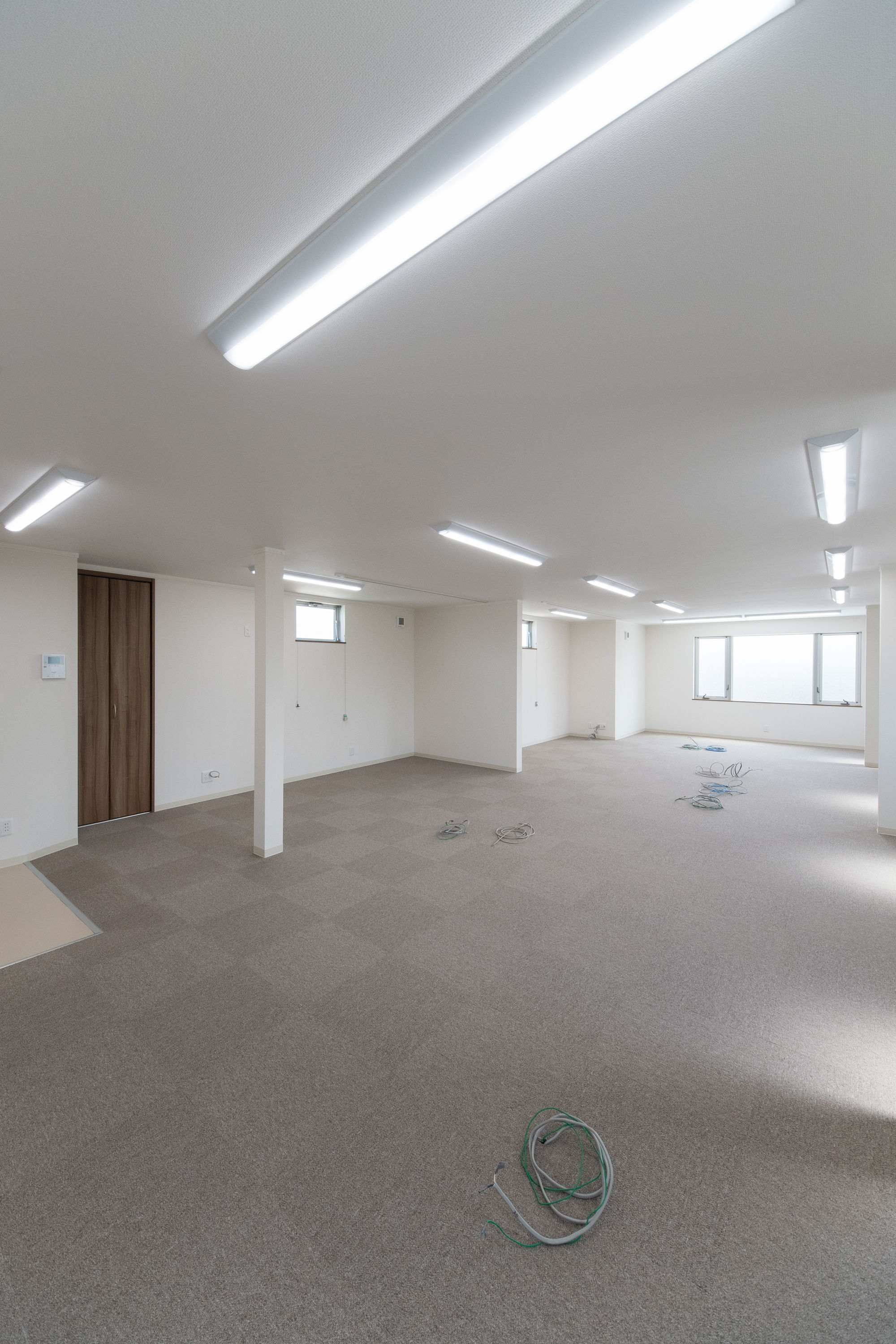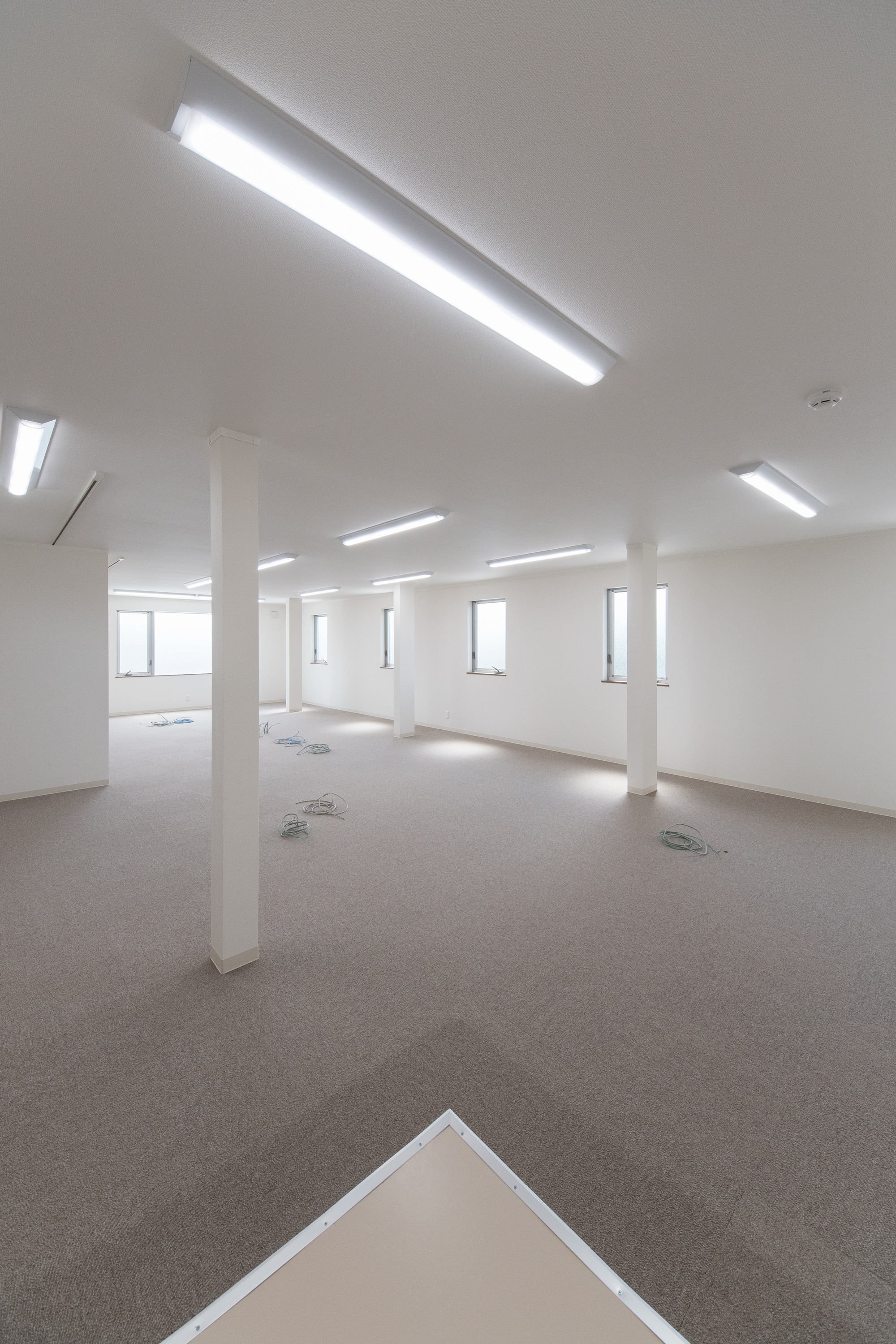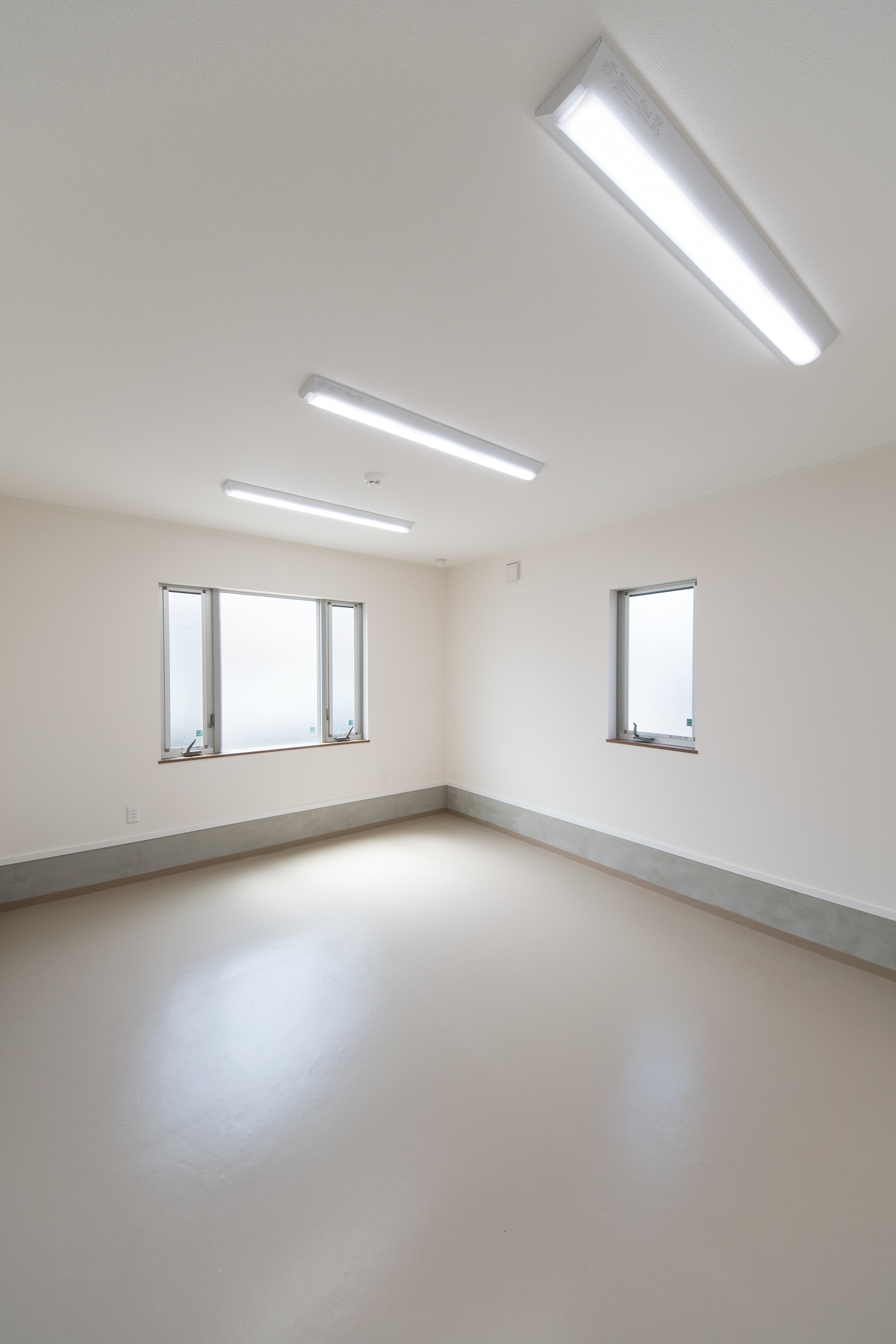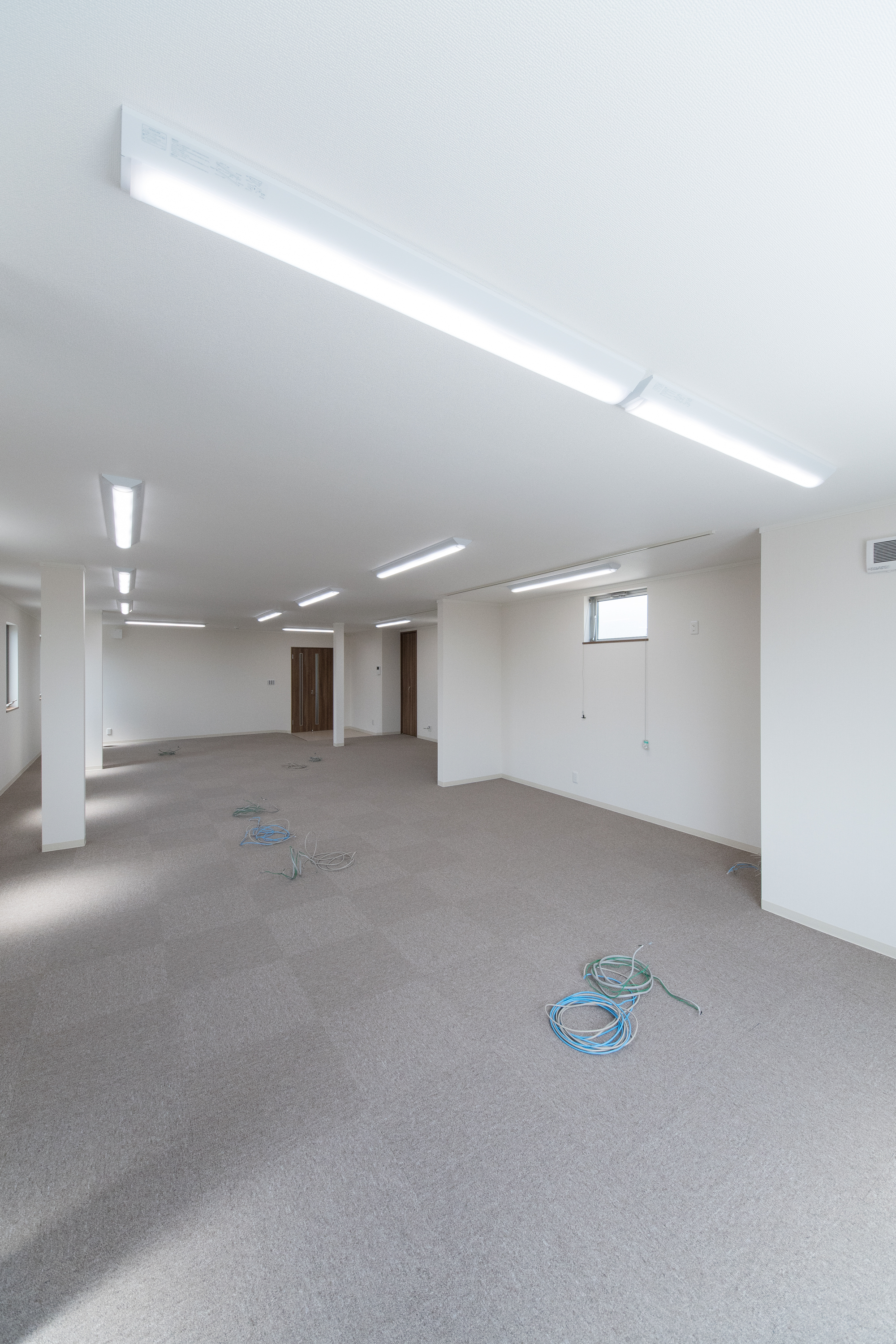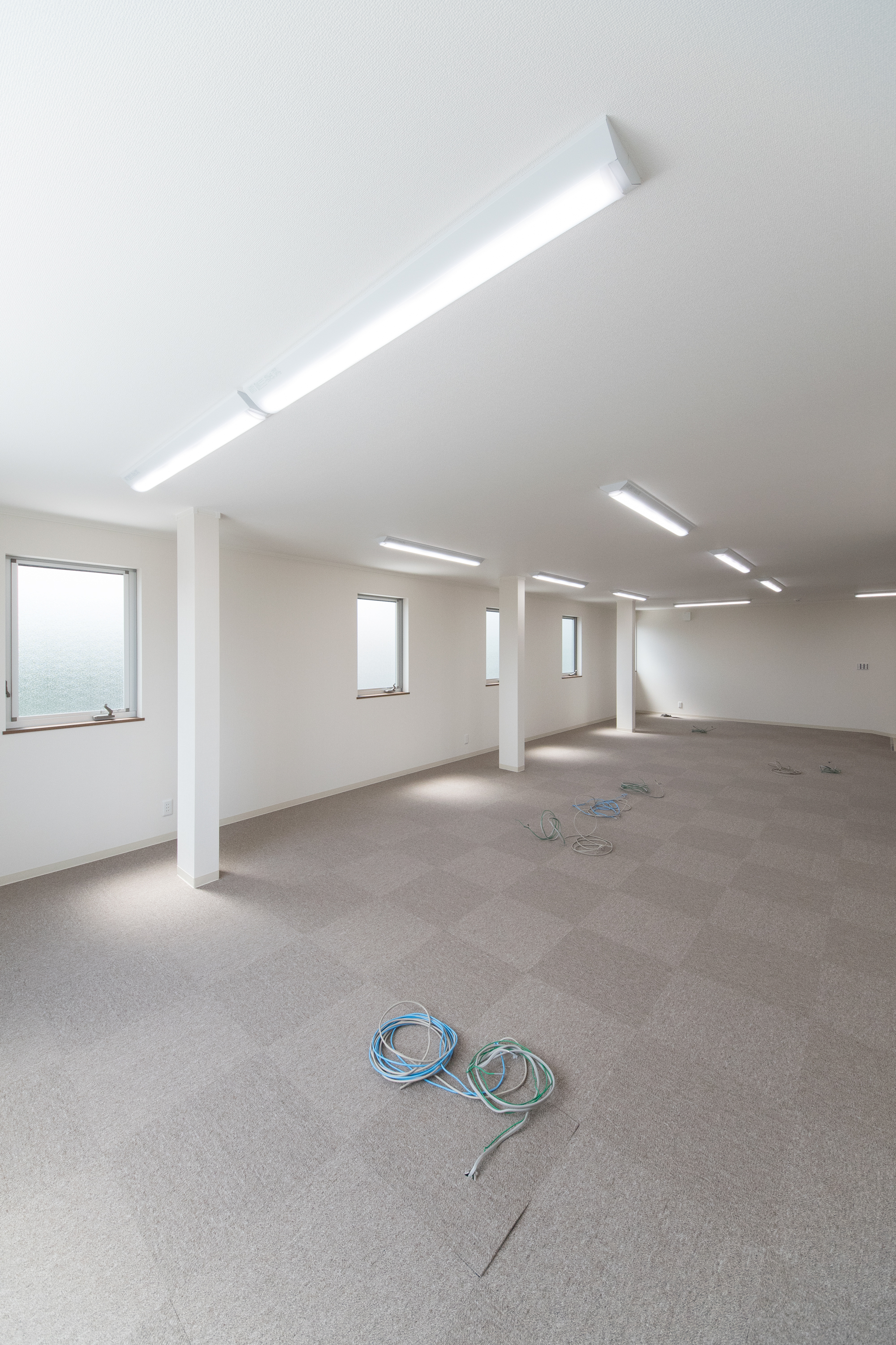 白にモノトーン系のブルーをアクセントにした、シンプル&モダンな箱型の外観。快適で実用的な「オフィス兼倉庫」が完成しました。