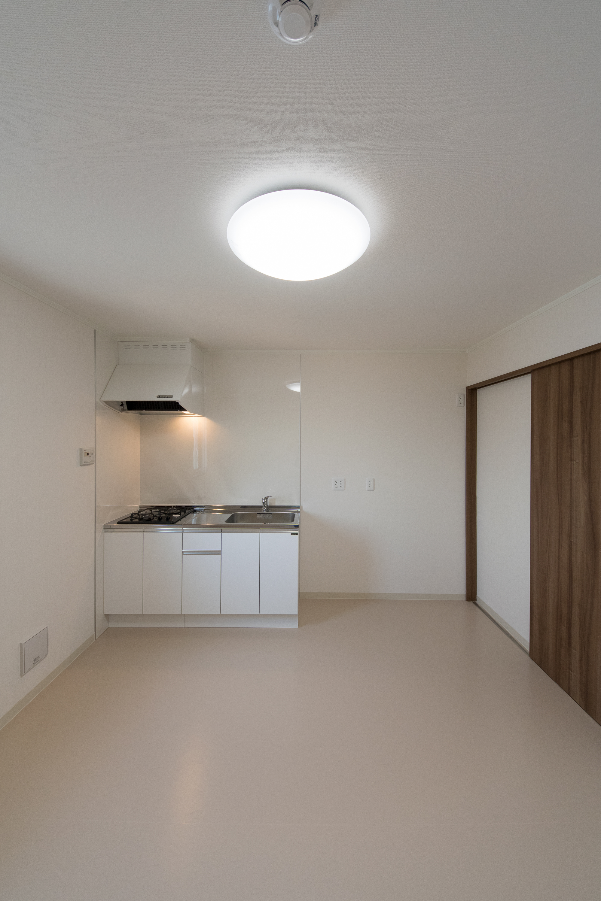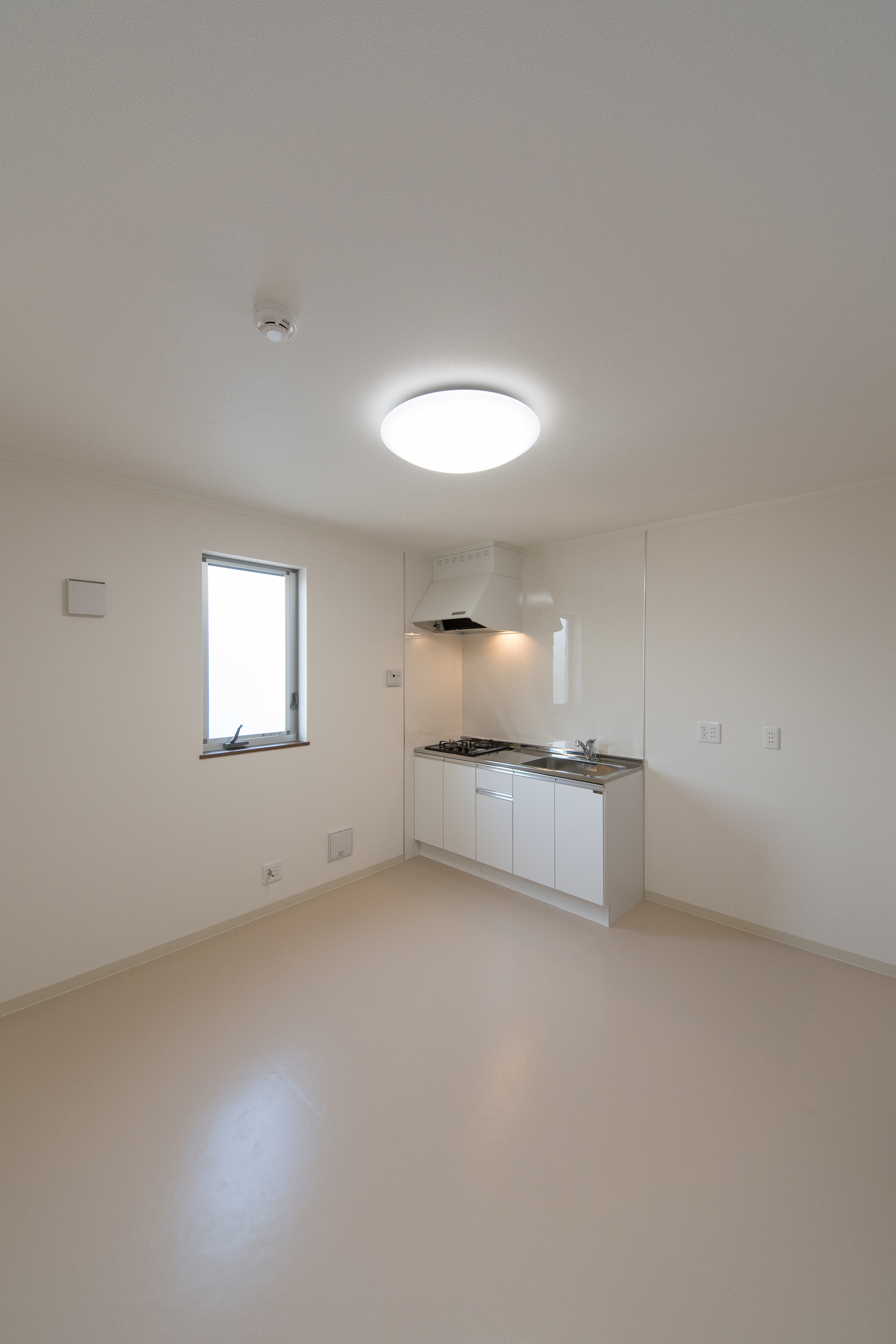 2Fスタッフ休憩室/白を基調とした清潔感のあるキッチンを設えました。
