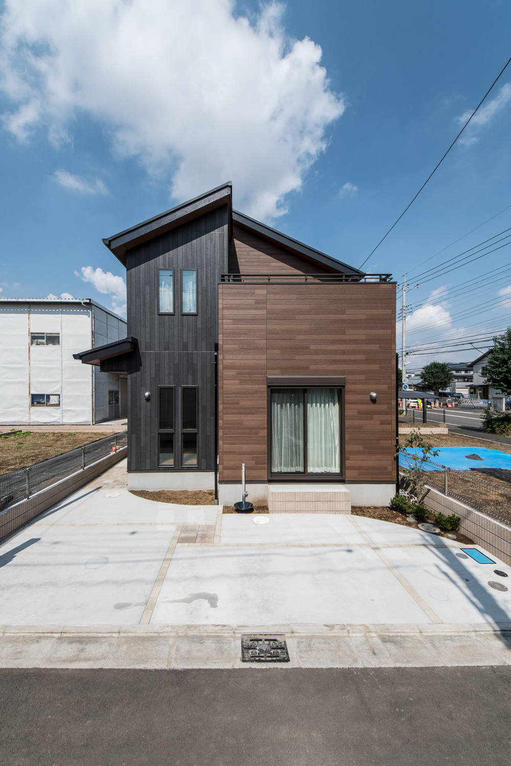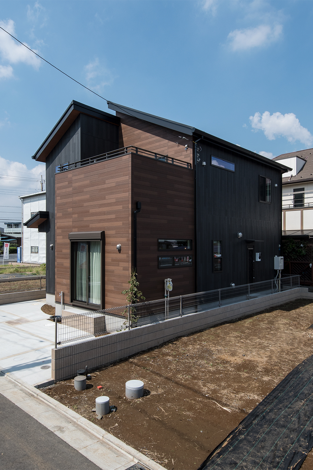 ウッディな質感の縦ブラック×横ブラウンのスタイリッシュでカッコイイ感じの外観。