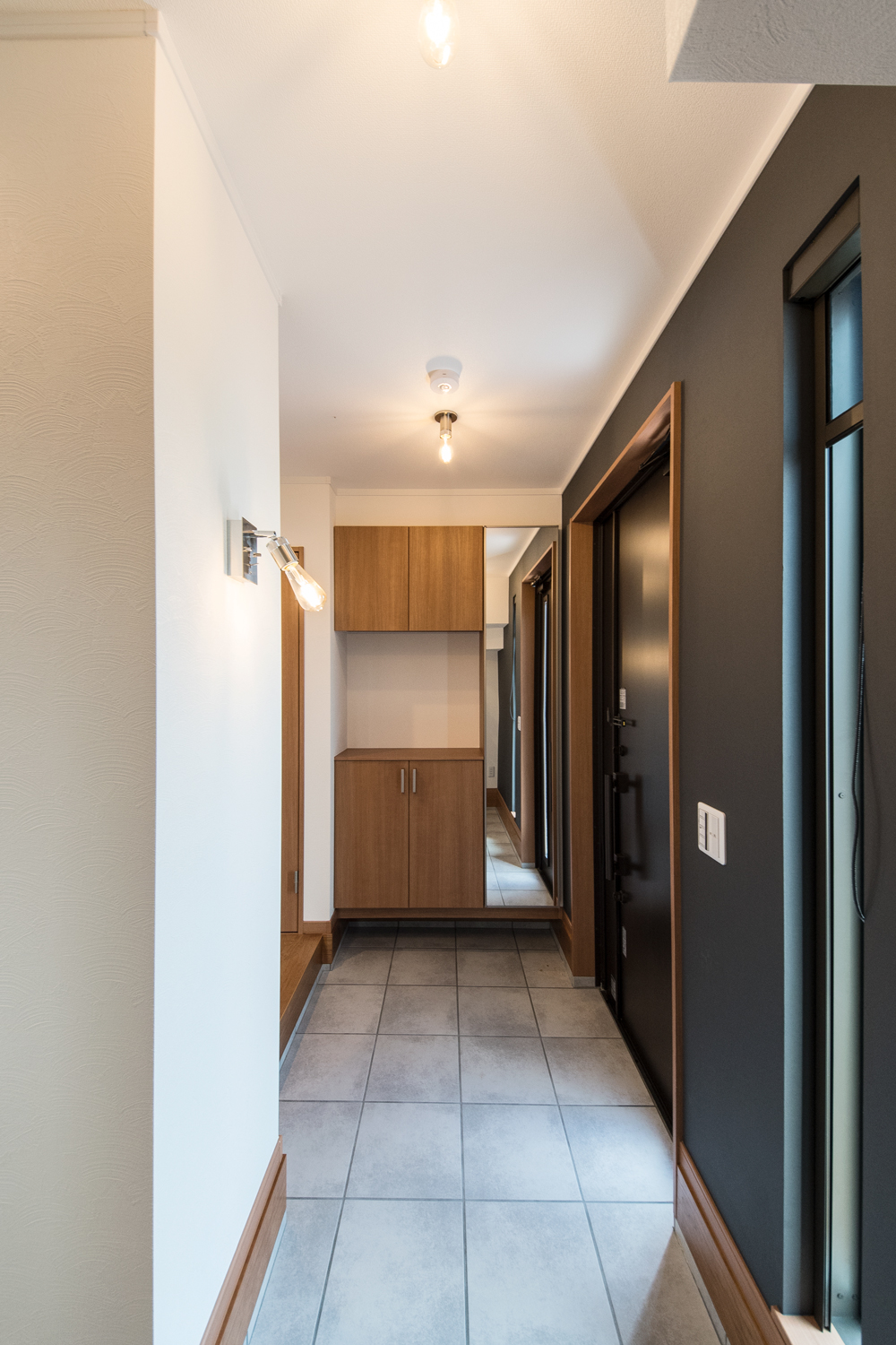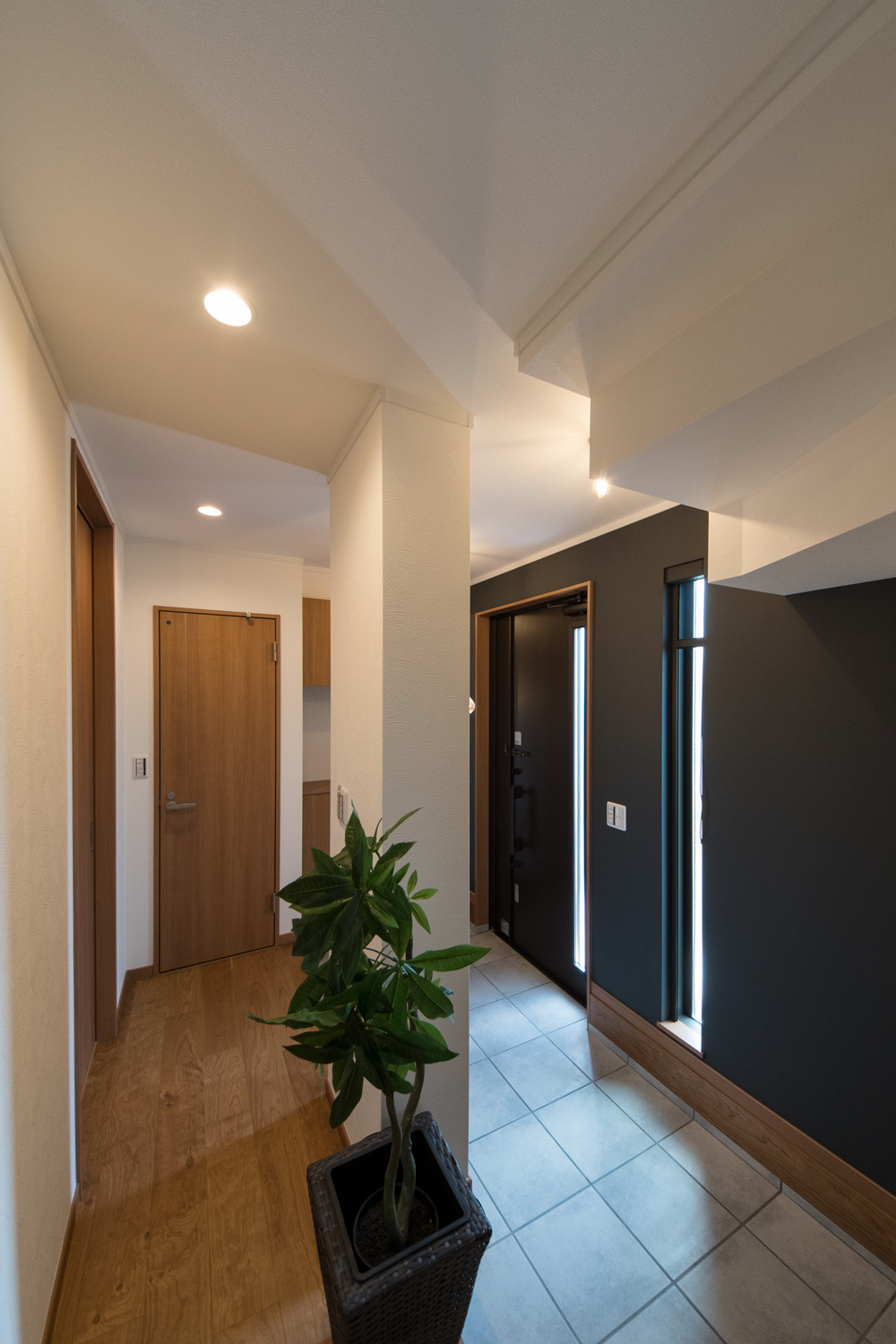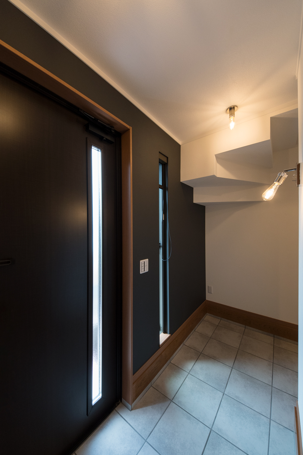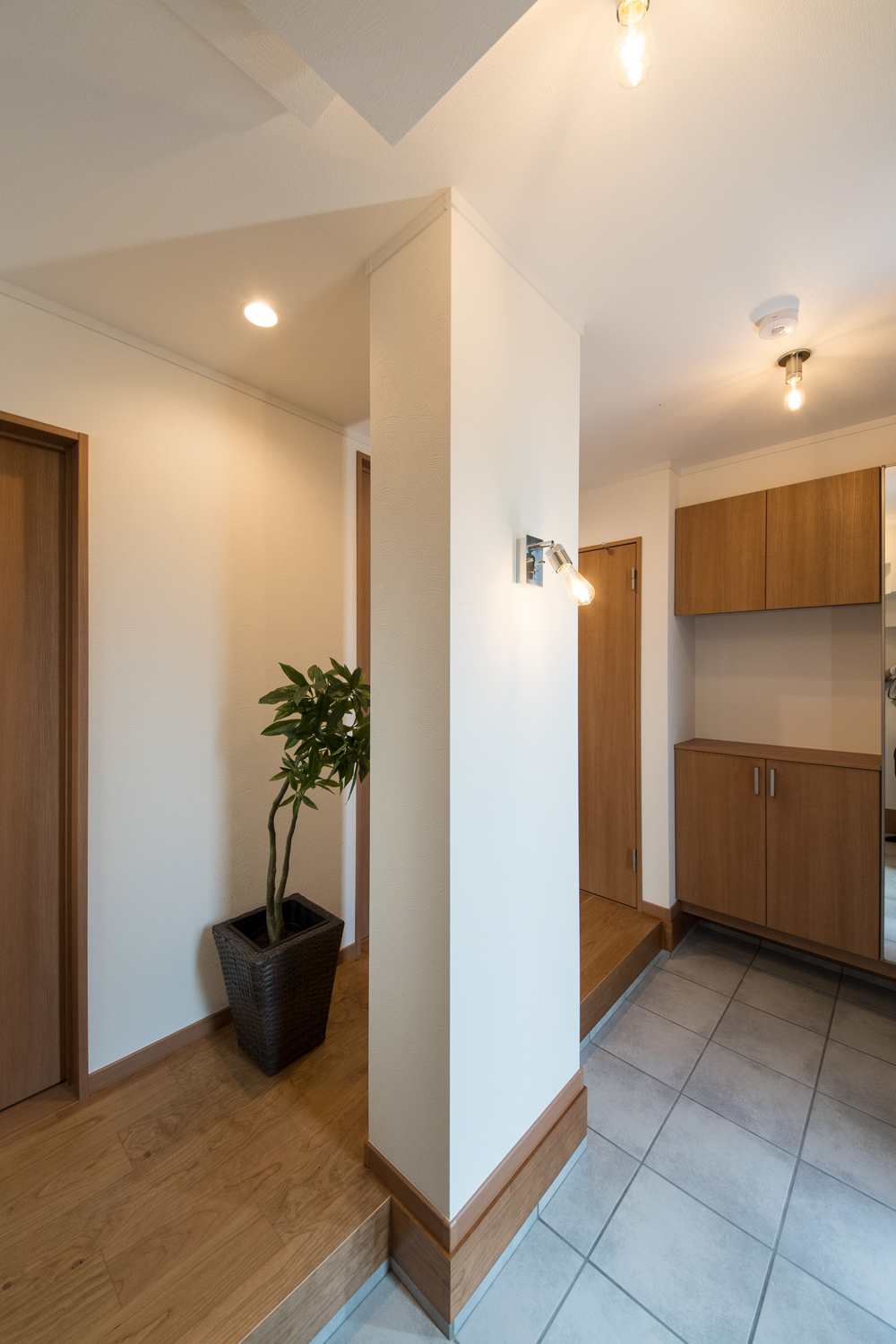 ゆとりのある玄関スペース。照明の柔らかな光が空間を彩ります。