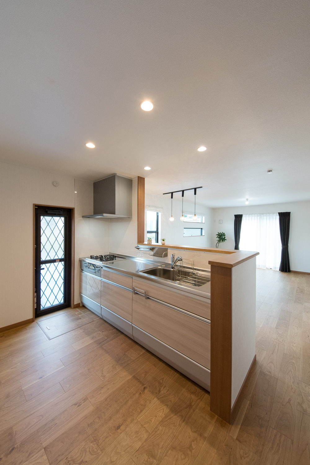 キッチンの扉カラーは、木目調のベージュ色。ナチュラルな印象になりました。