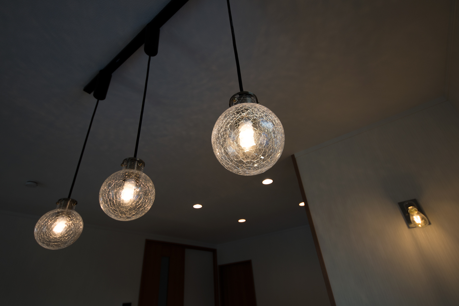 透明吹きガラスのペンダントライト。柔らかな光が、ダイニングをやさしく照らします。