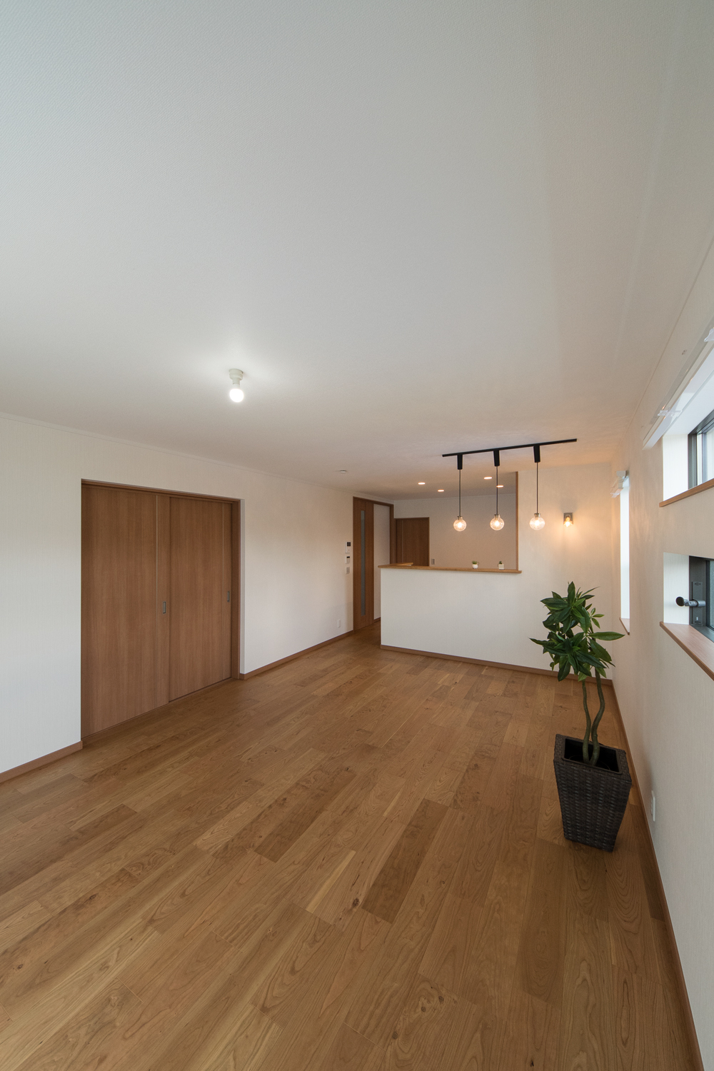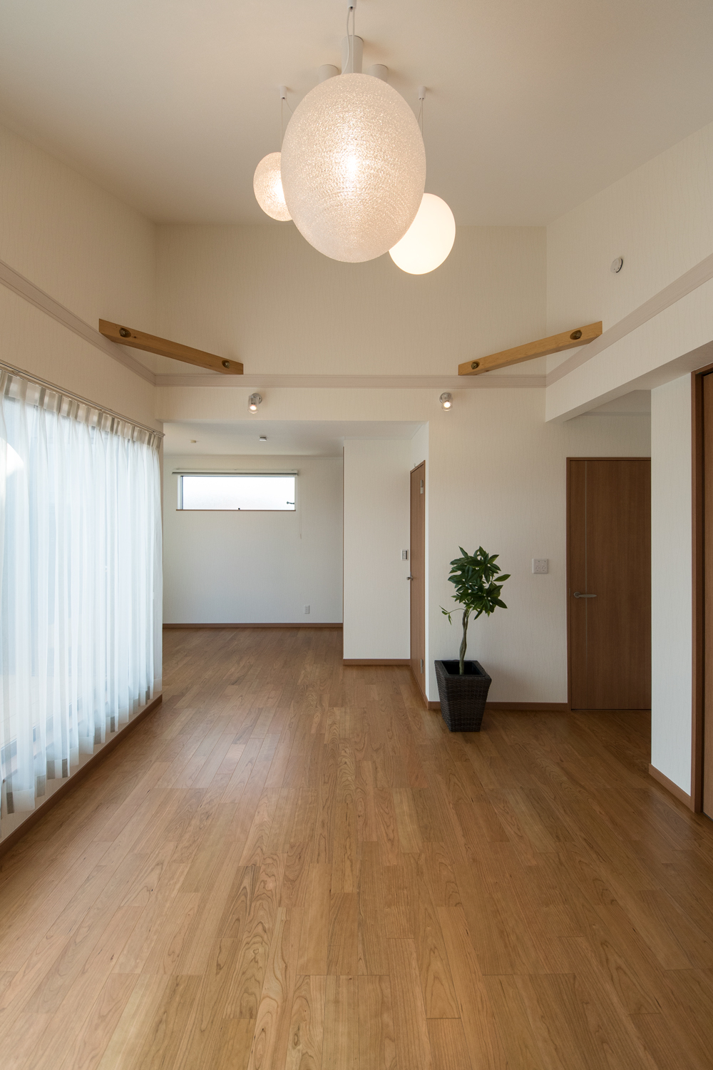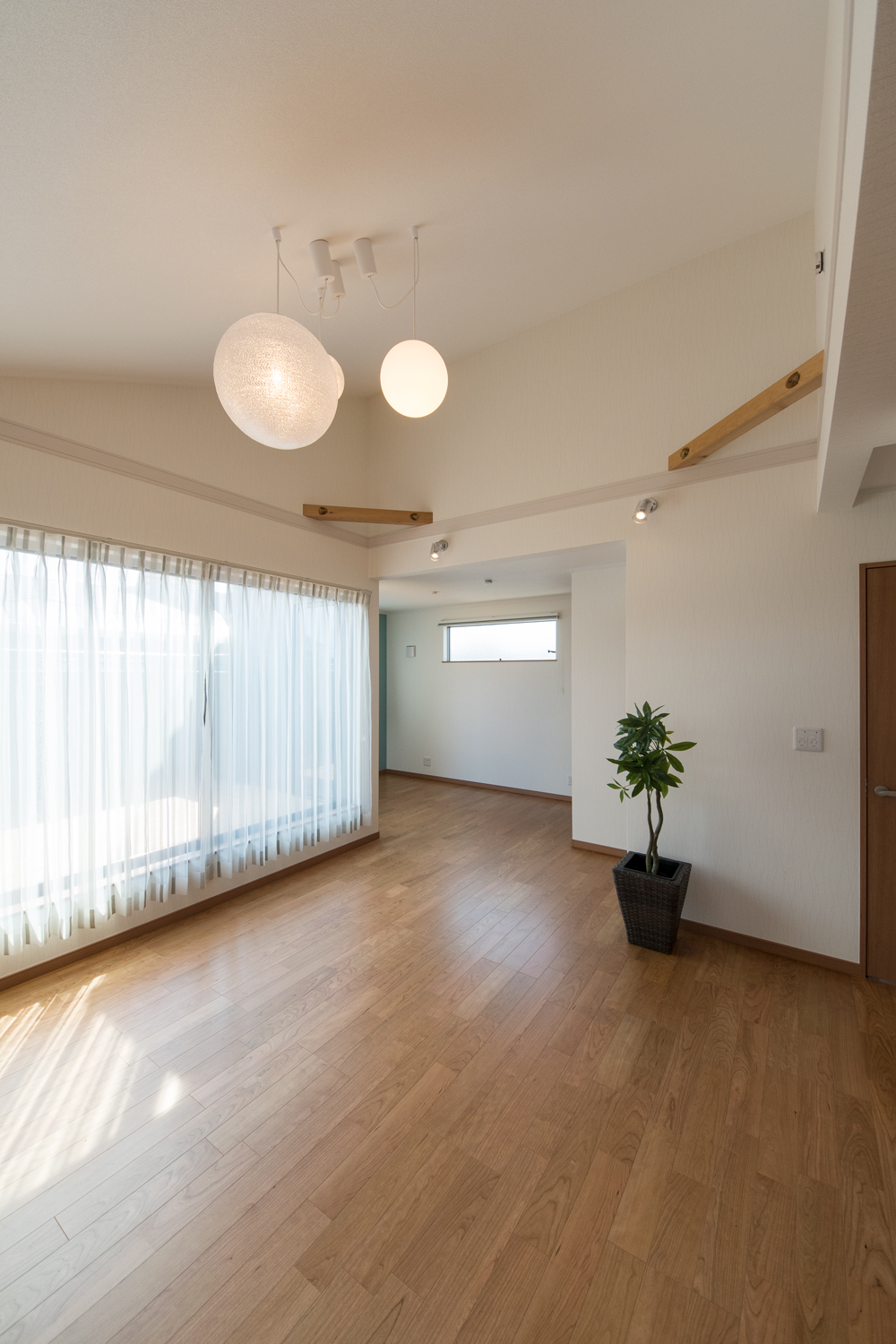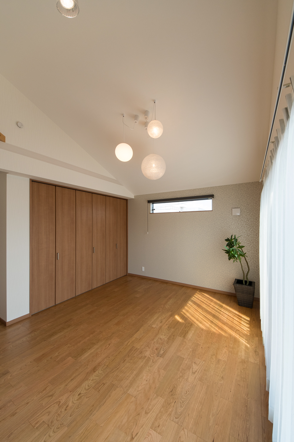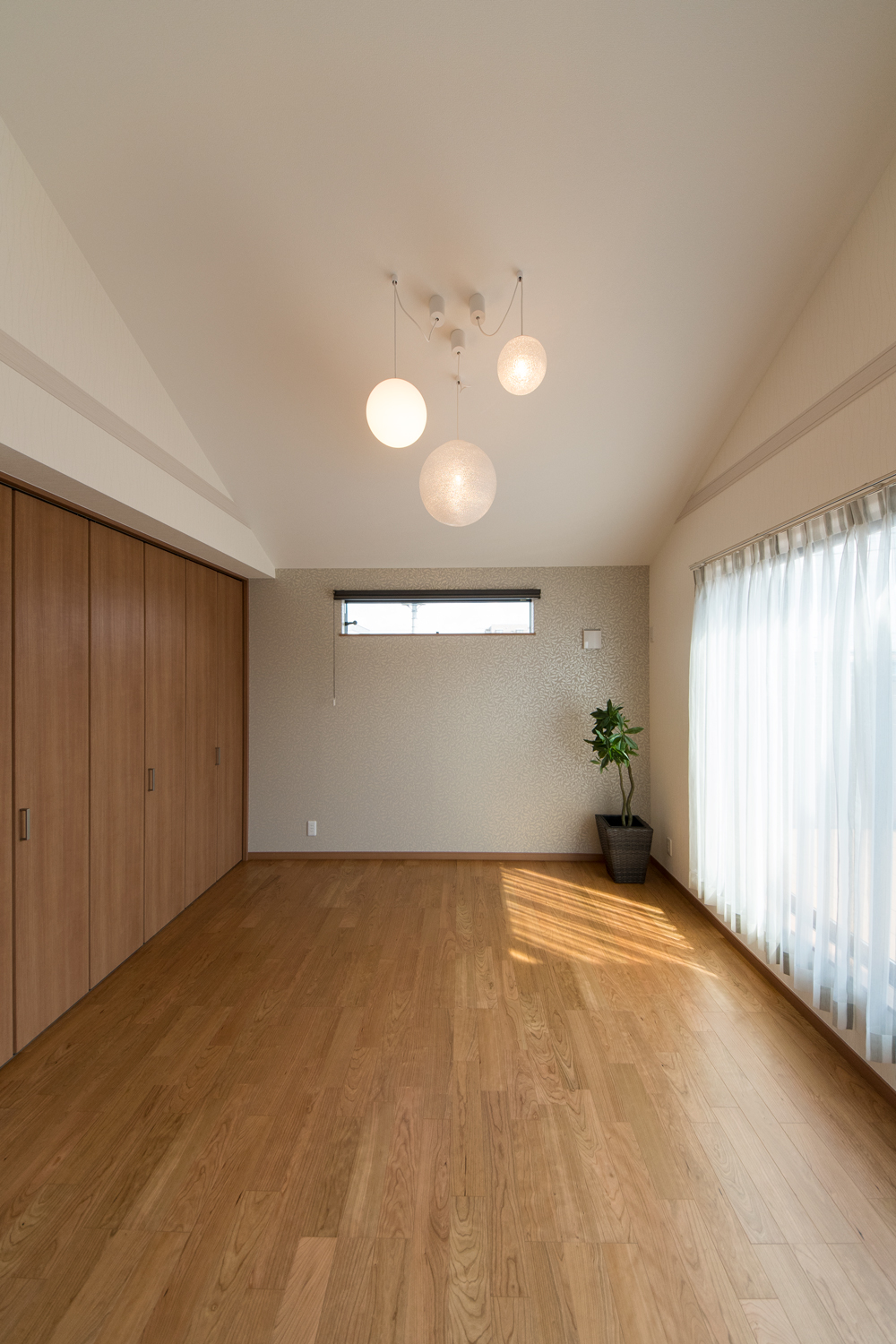 屋根の傾斜を利用した勾配天井と、火打ち梁を施しました。木の温もり感じる開放的な空間です。