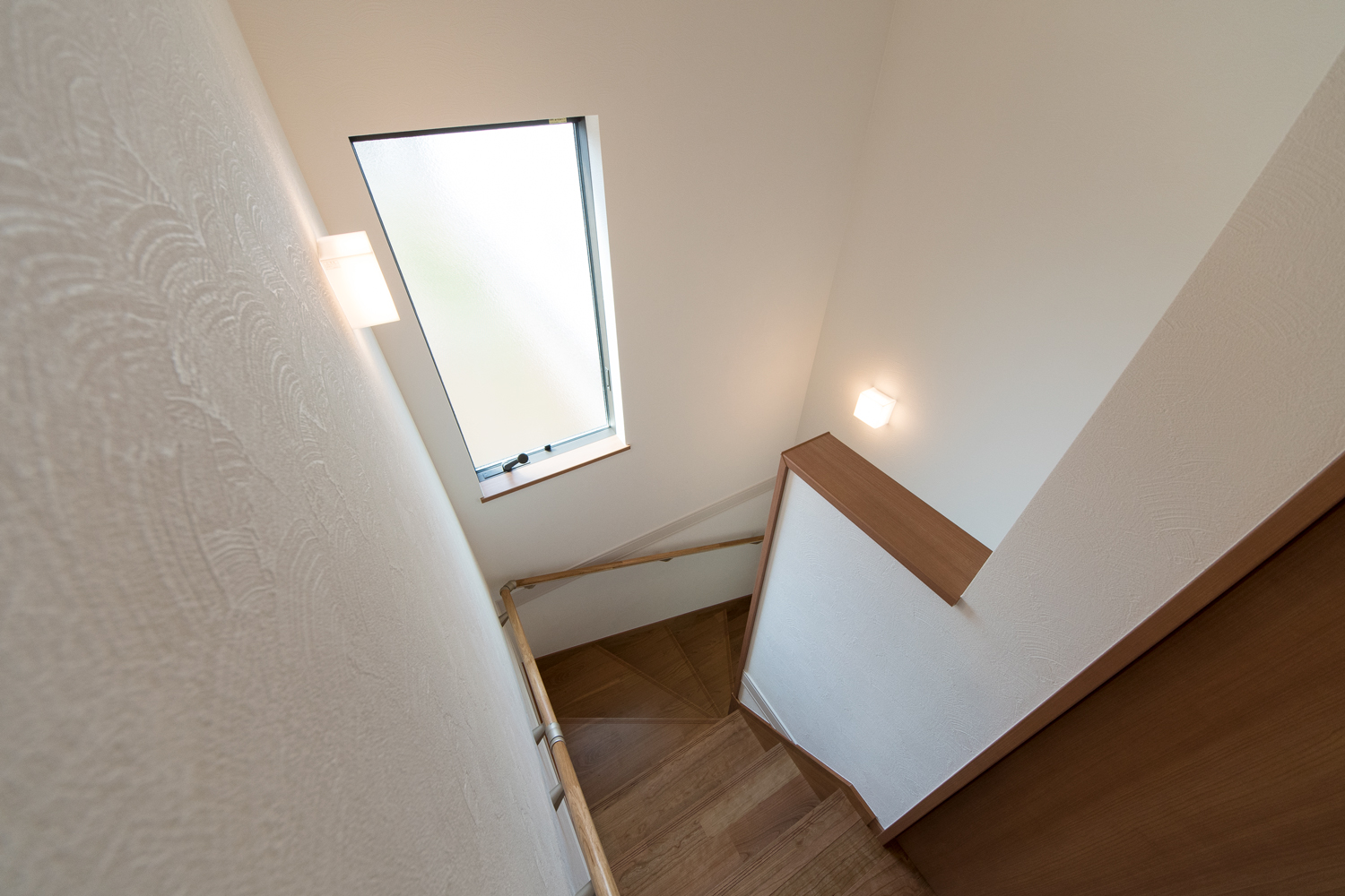 大きな窓を設置し、通風も採光も良く開放感ある階段に。