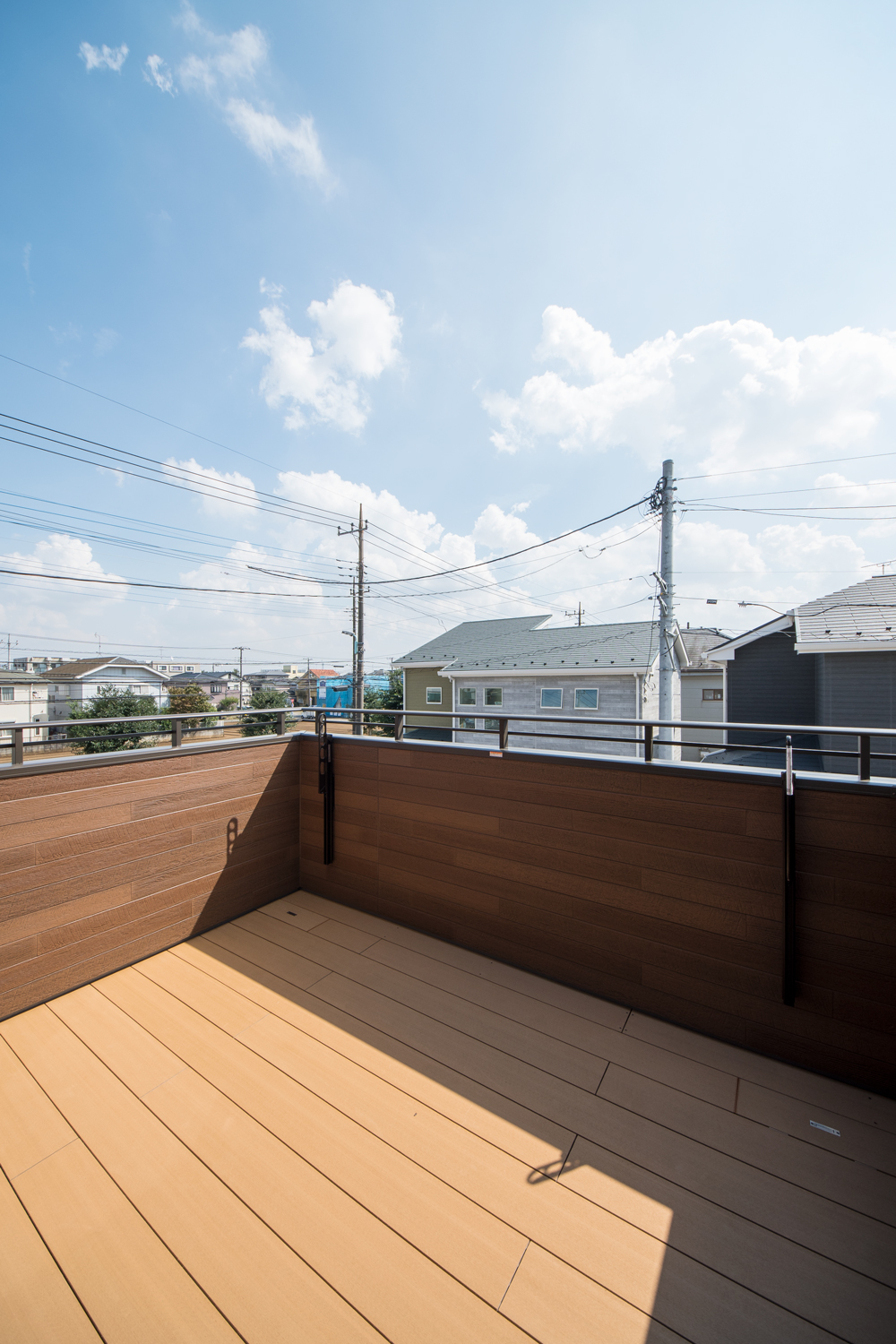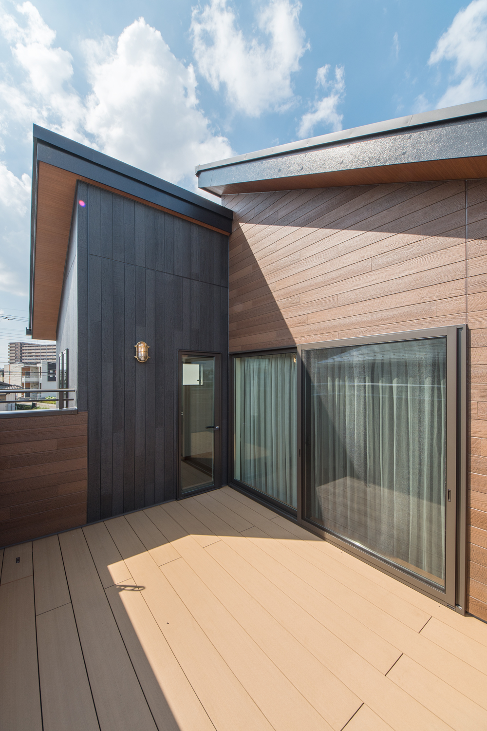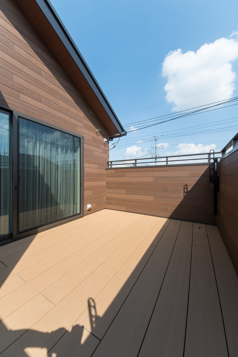 ウッディな質感と色合いで統一されたデッキと外壁の雰囲気がピッタリ。