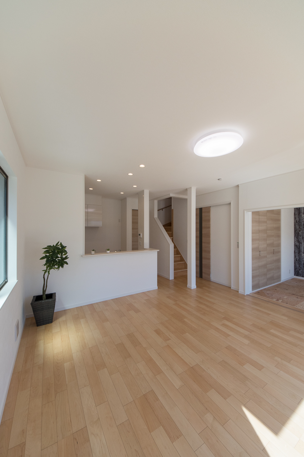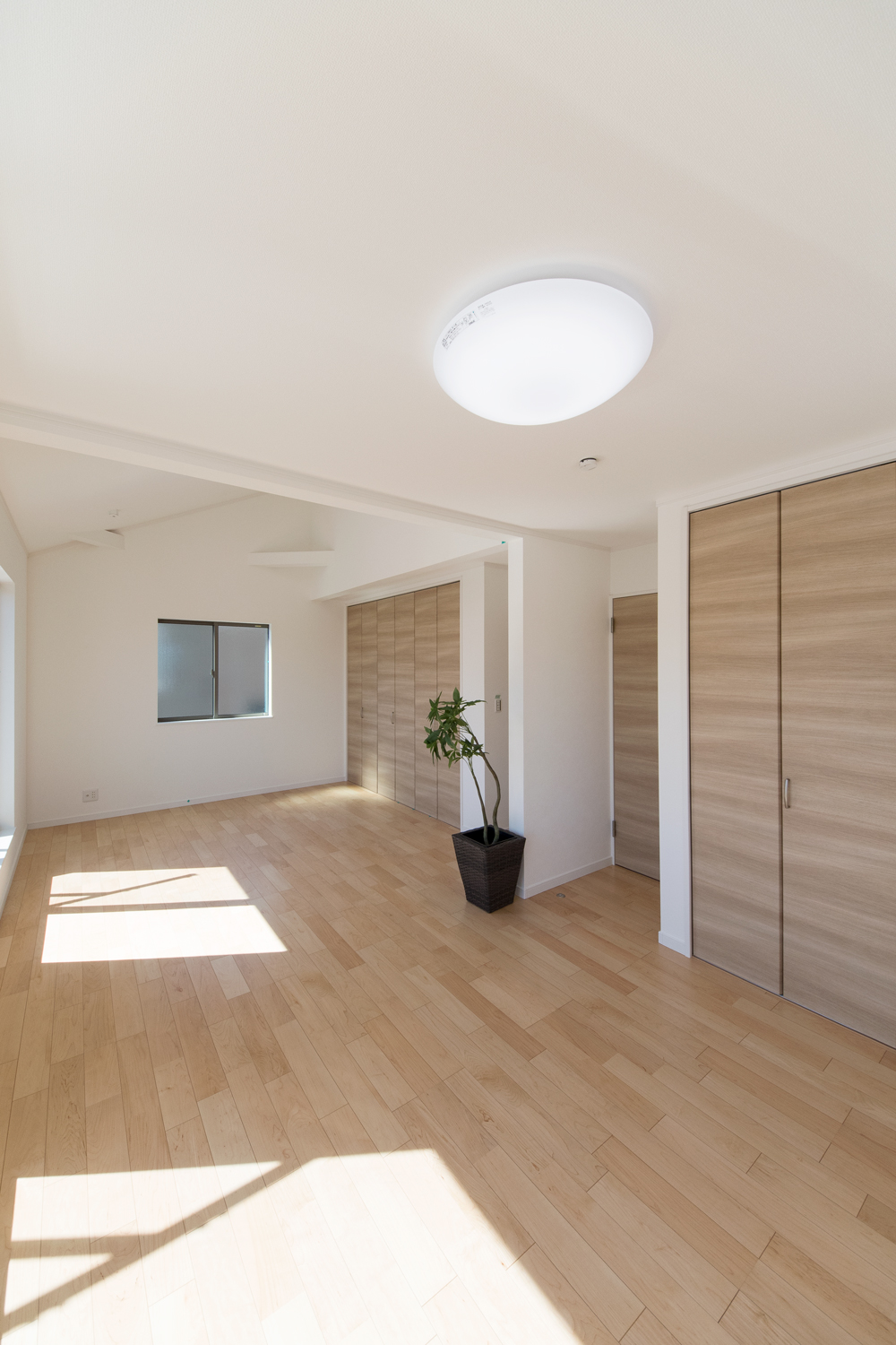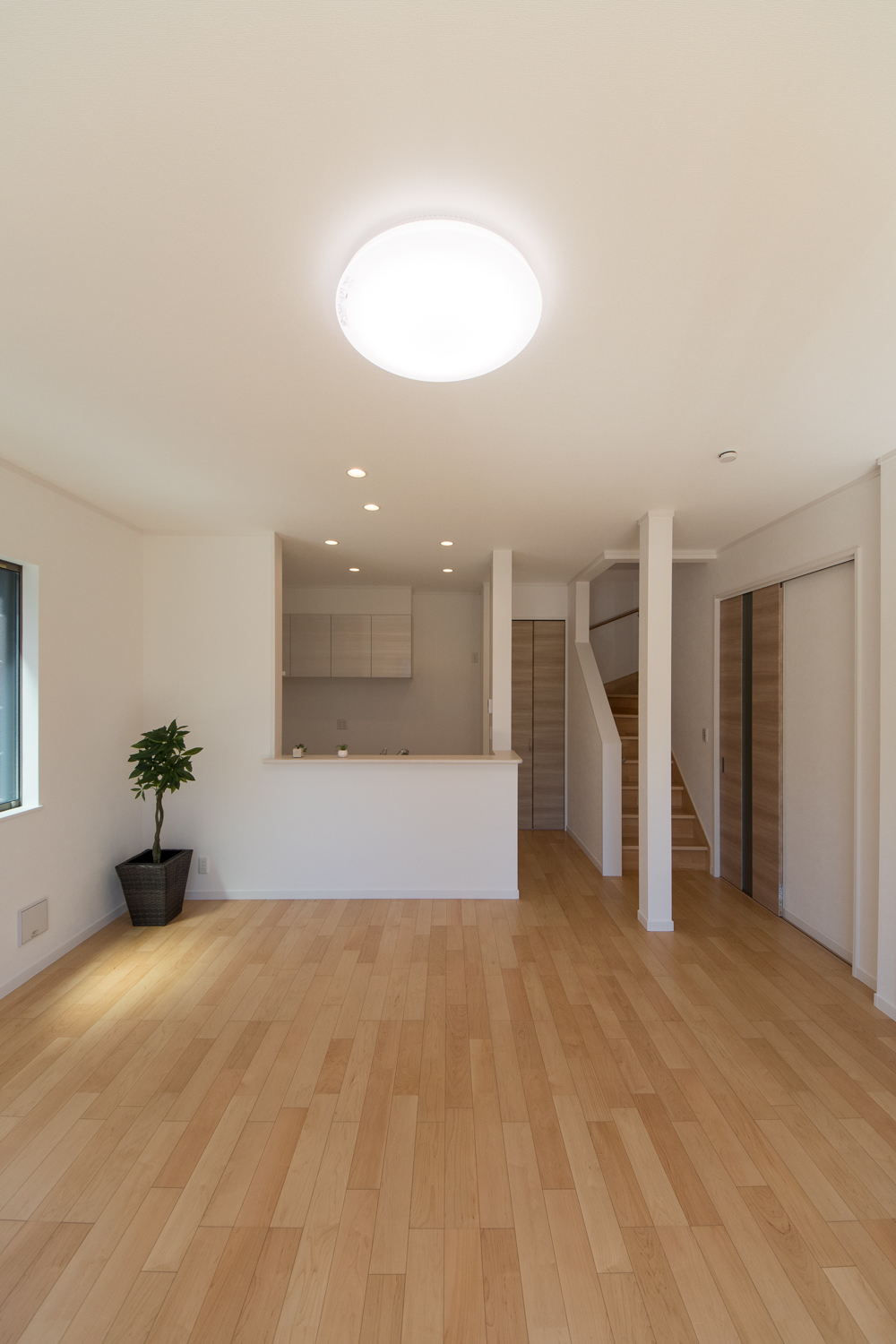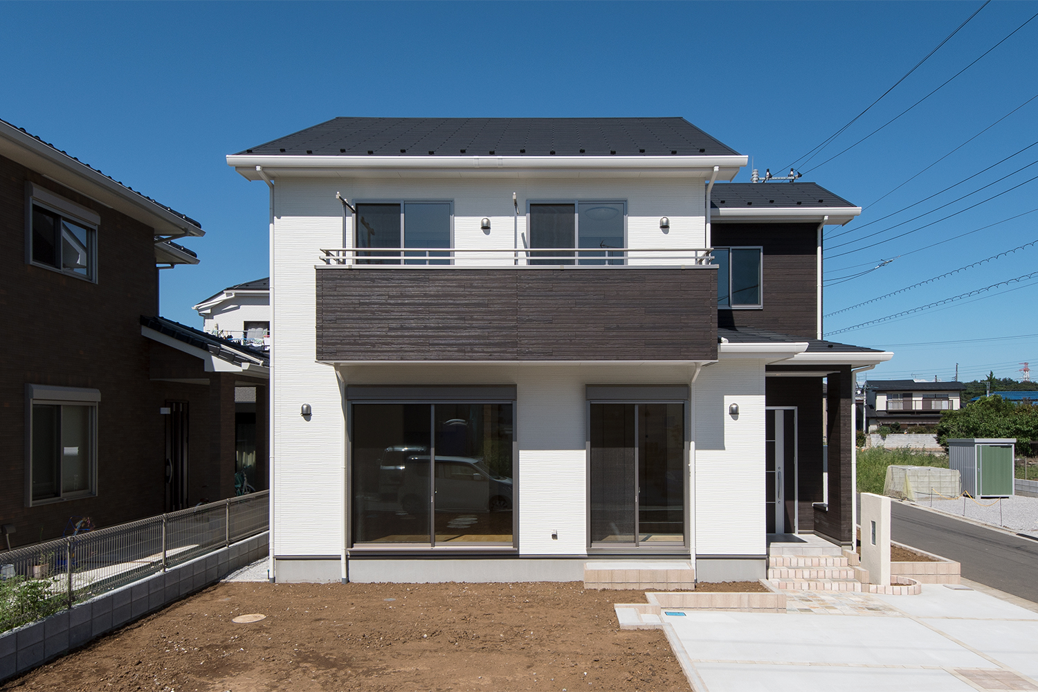 白をベースに、自然な風合いと質感溢れる木調デザインのブラウンをアクセントにした、ナチュラル&モダンな外観に仕上がりました。室内は天井にこだわり、LDKをハイスタッド仕様に、2階洋室は勾配天井を設えました。