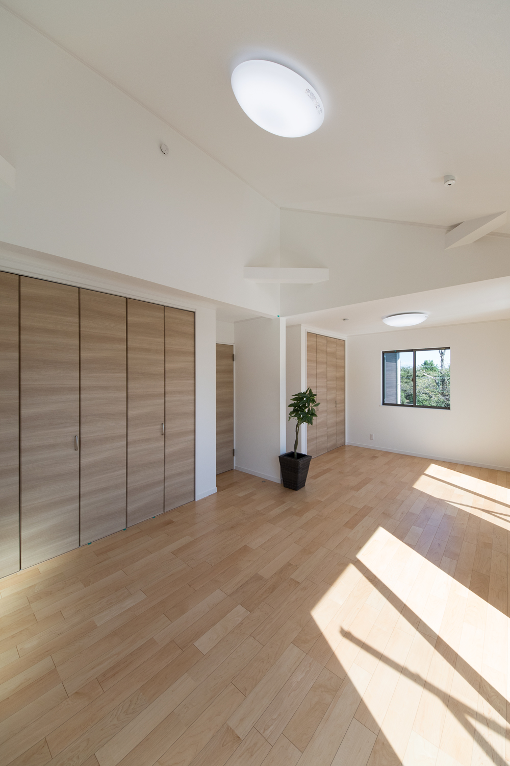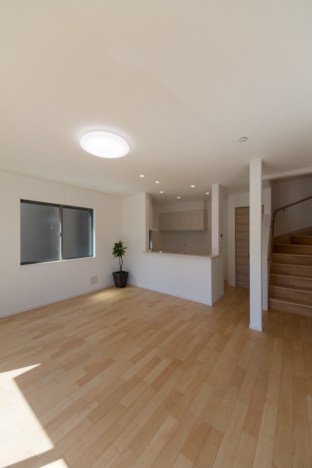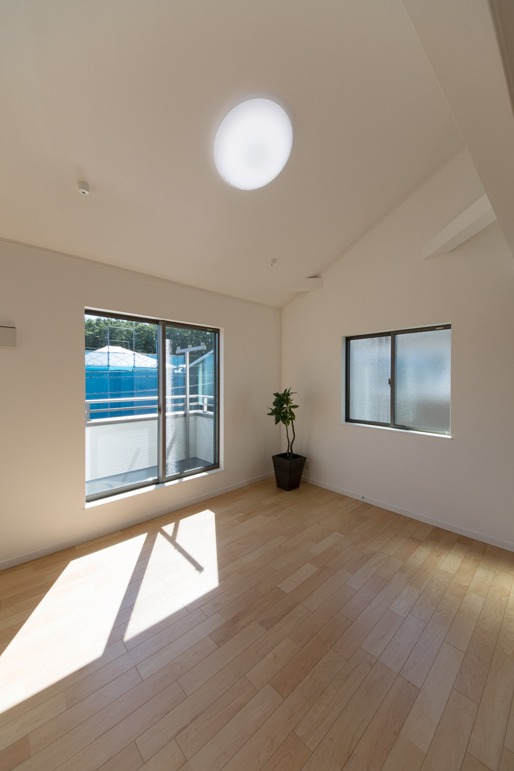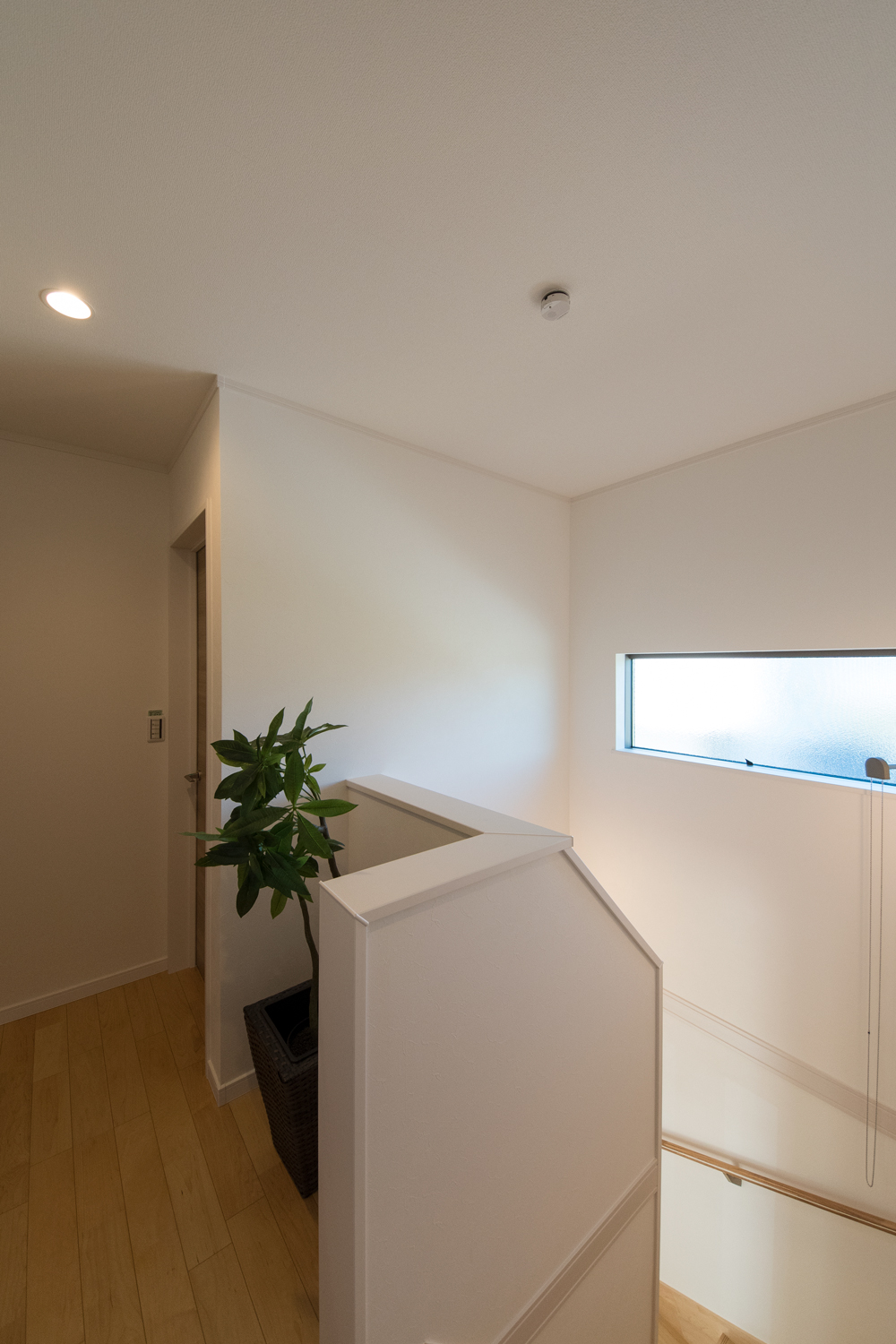 白をベースに、自然な風合いと質感溢れる木調デザインのブラウンをアクセントにした、ナチュラル&モダンな外観に仕上がりました。室内は天井にこだわり、LDKをハイスタッド仕様に、2階洋室は勾配天井を設えました。