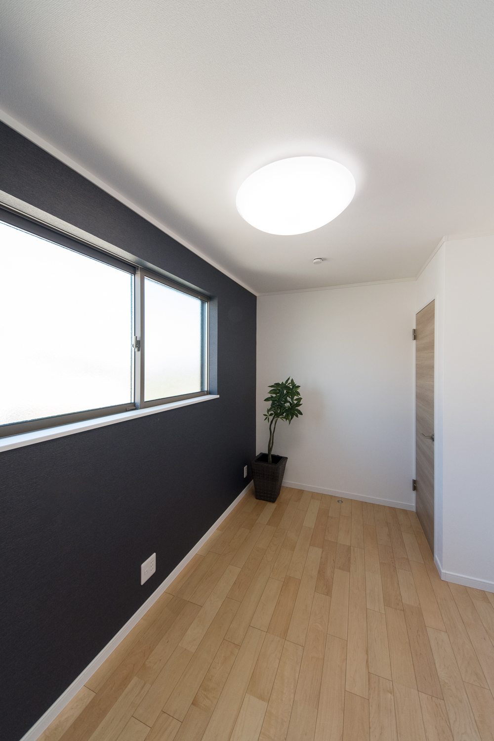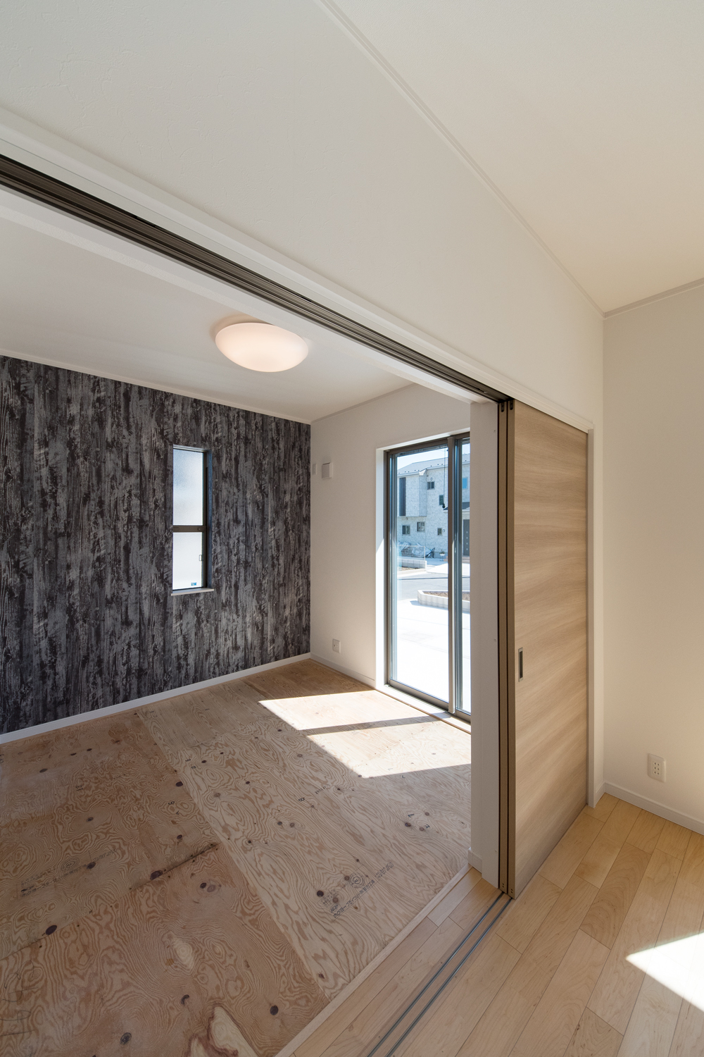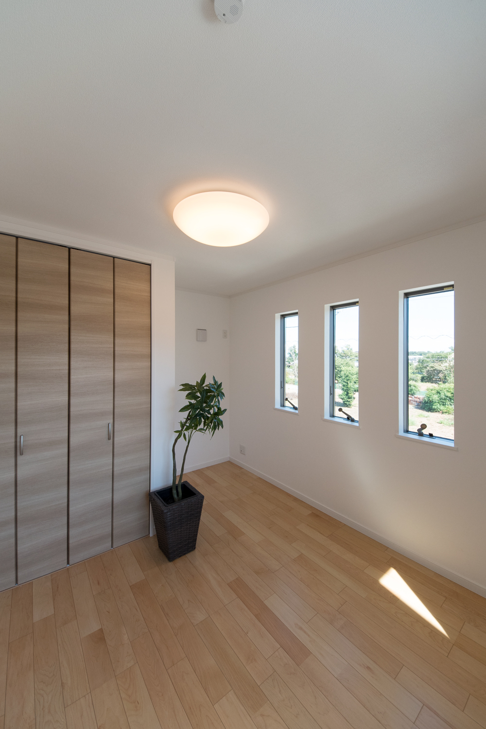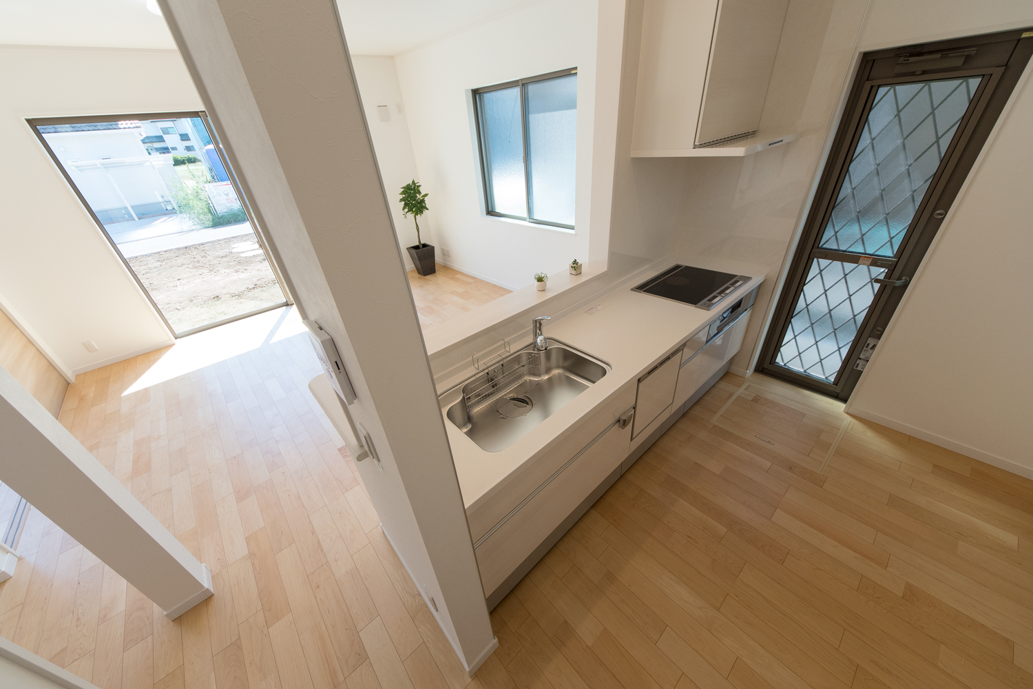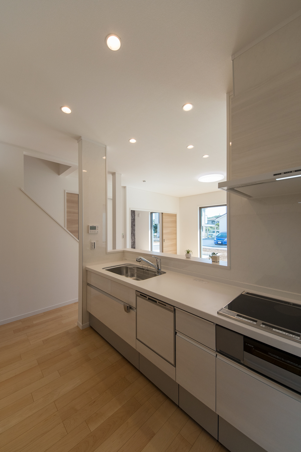 白をベースに、自然な風合いと質感溢れる木調デザインのブラウンをアクセントにした、ナチュラル&モダンな外観に仕上がりました。室内は天井にこだわり、LDKをハイスタッド仕様に、2階洋室は勾配天井を設えました。