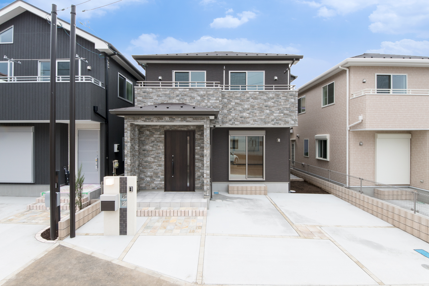 ブラウンを基調に表情豊かな石目調のサイディングをアクセントにした、上質感漂う外観。