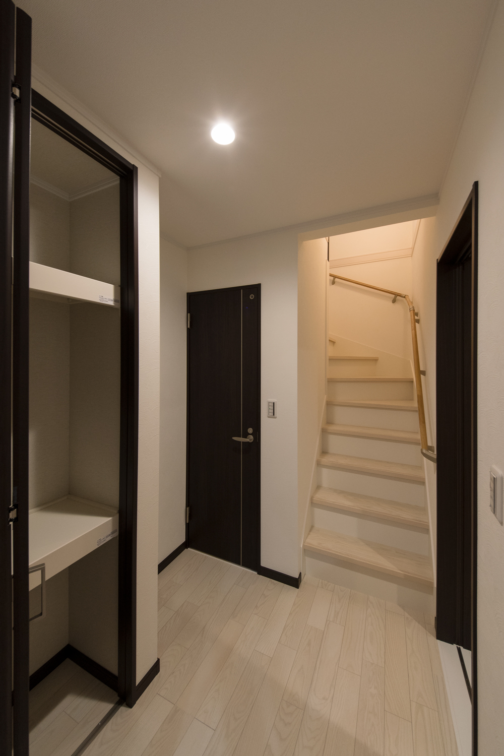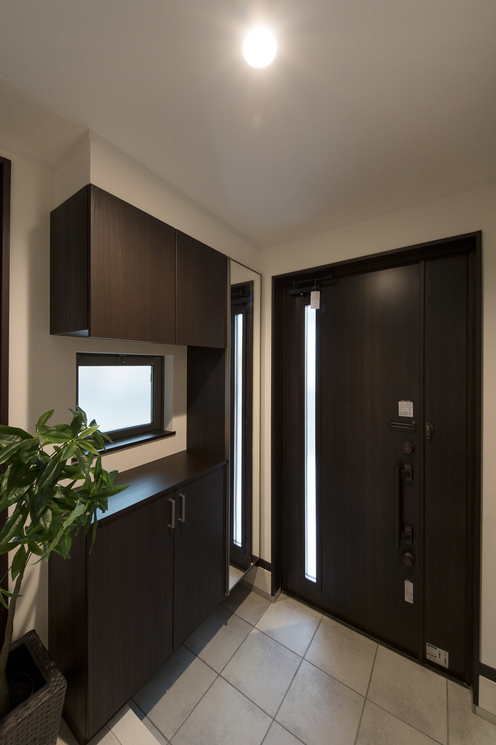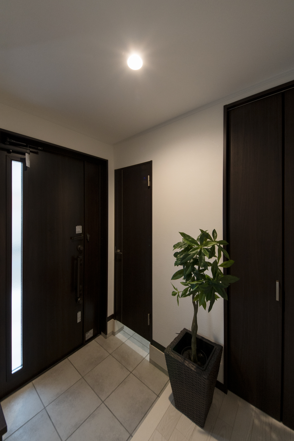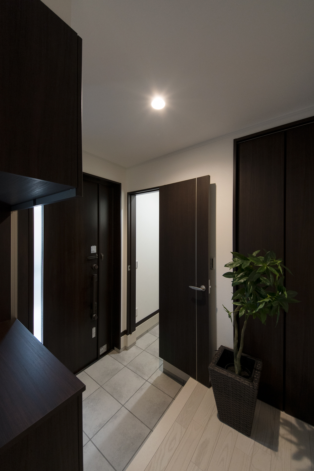 玄関ドア・玄関収納をモノトーンカラーで差し色にしたシックで大人な雰囲気の玄関。