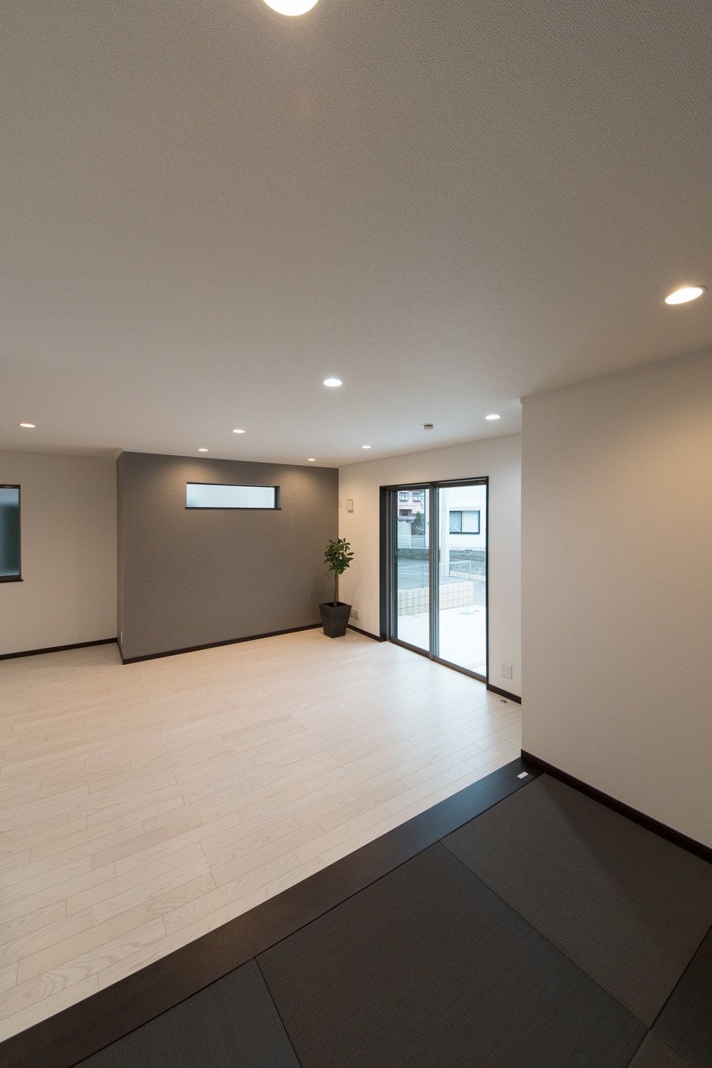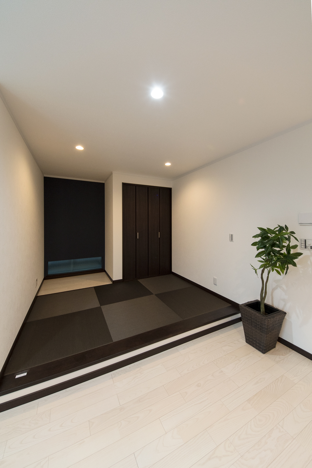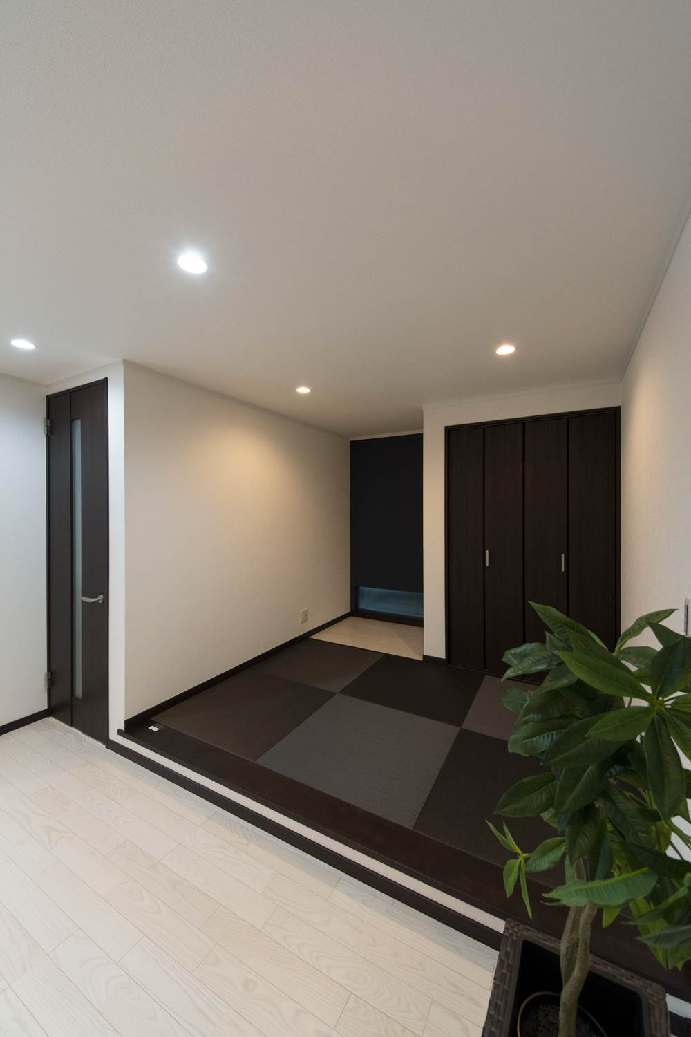 小上がりになった畳敷きスペース/チャコール色の畳を市松敷きにした、イマドキのモダンなデザイン。