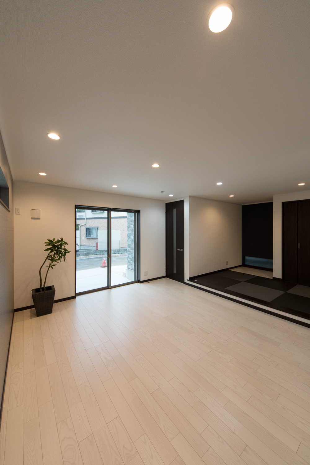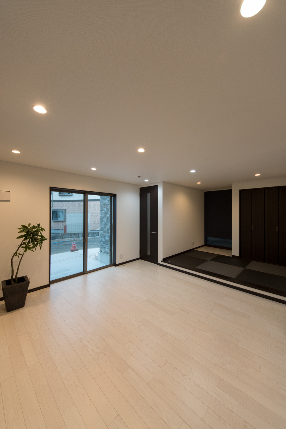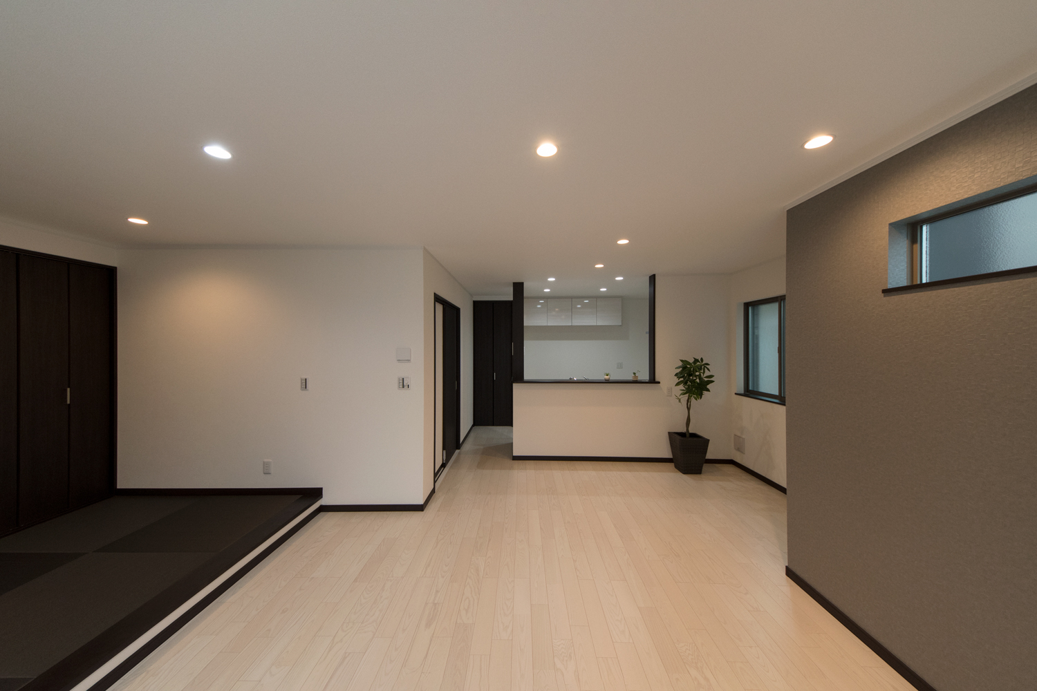 小上がりになった畳敷きスペース/チャコール色の畳を市松敷きにした、イマドキのモダンなデザイン。