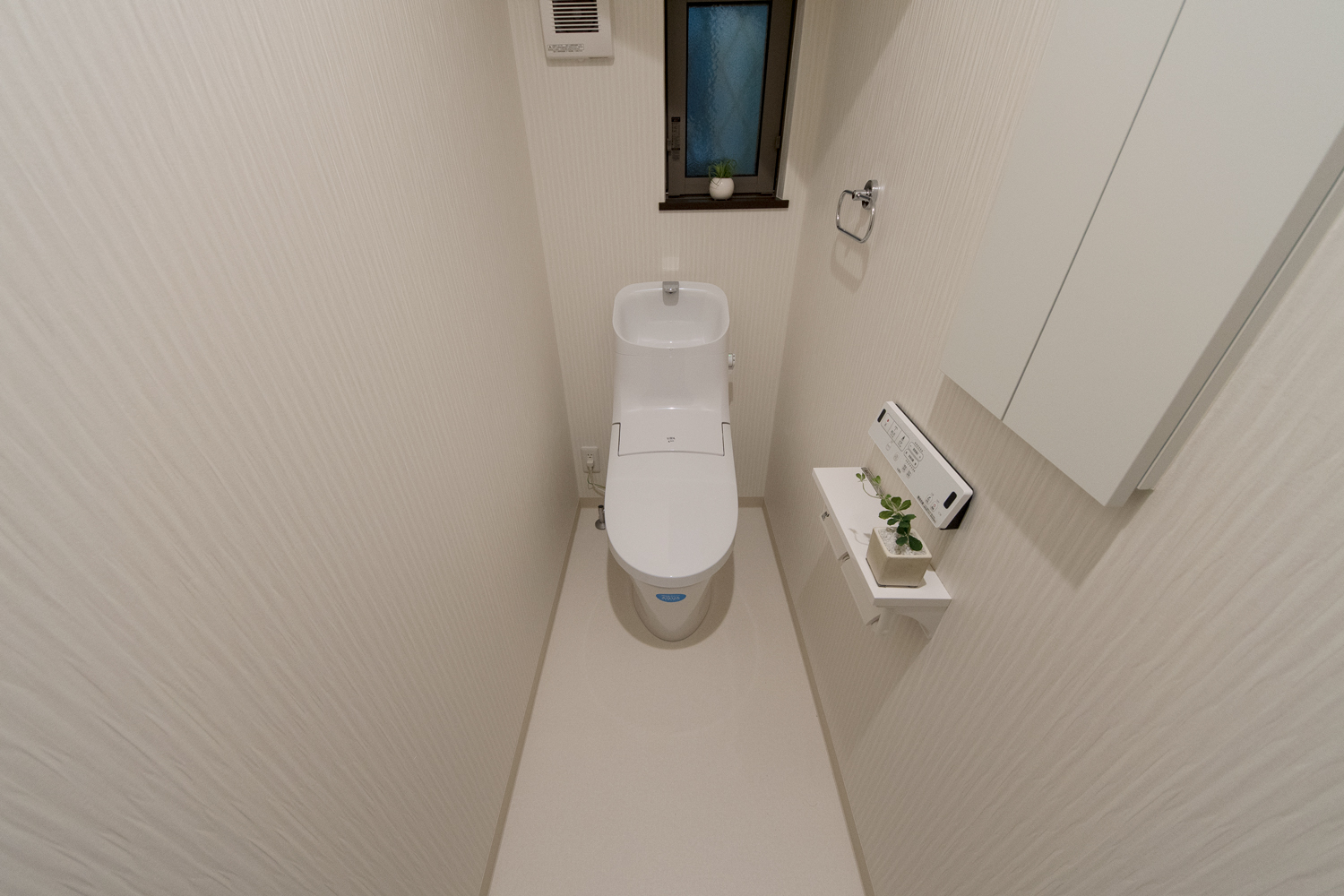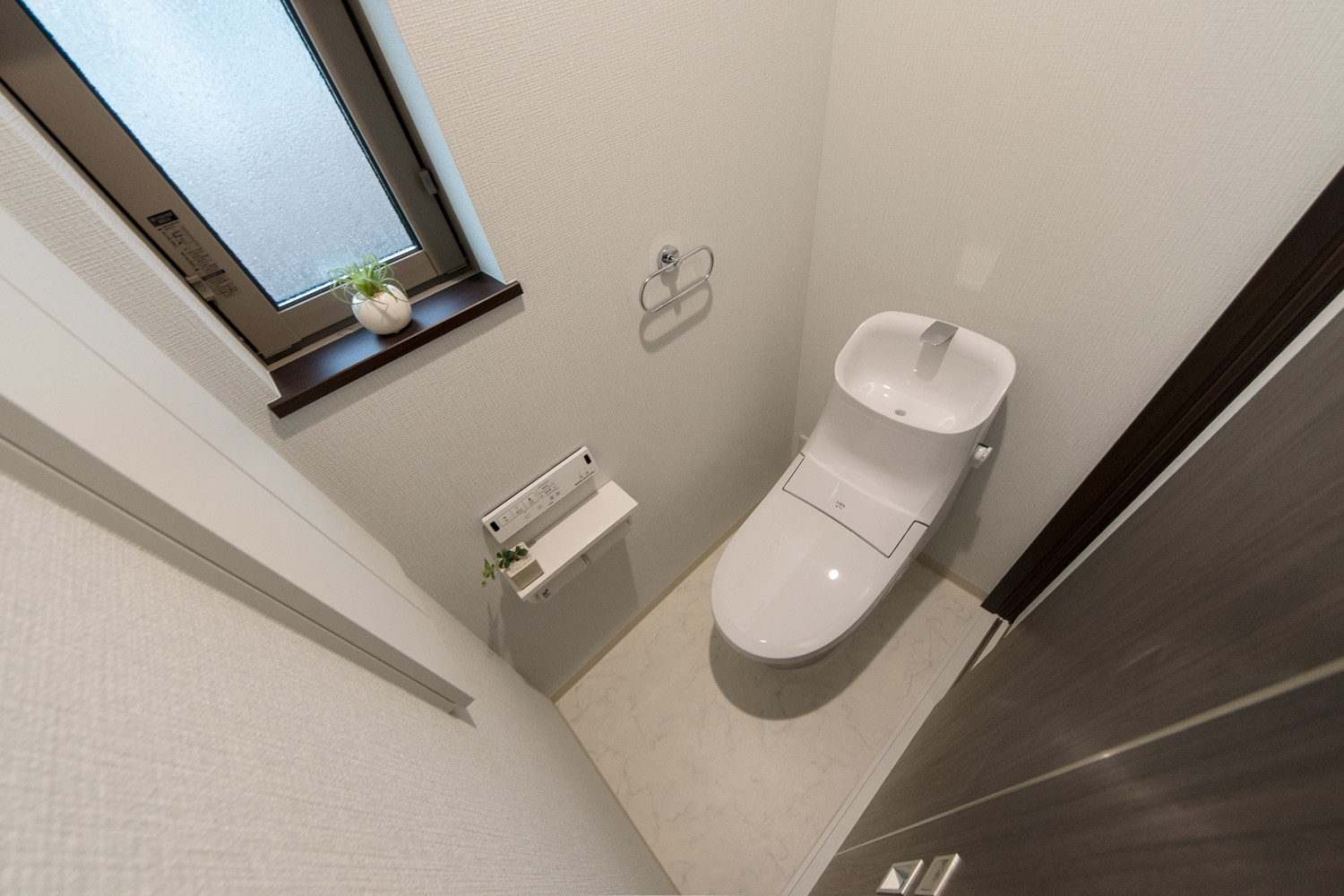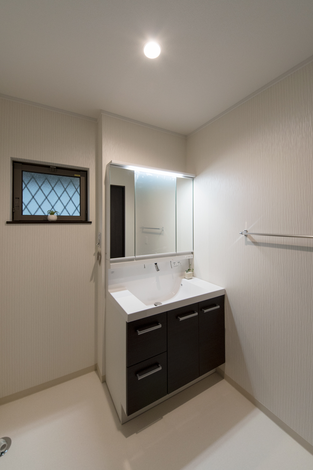 白を基調とした清潔感のあるサニタリールーム。洗面化粧台扉をダークブラウンでアクセントに。