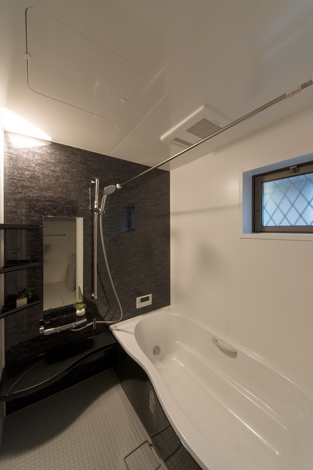 シックなグレーのタイル調アクセントクロスが空間の引き締め、スタイリッシュで洗練された空間を演出。