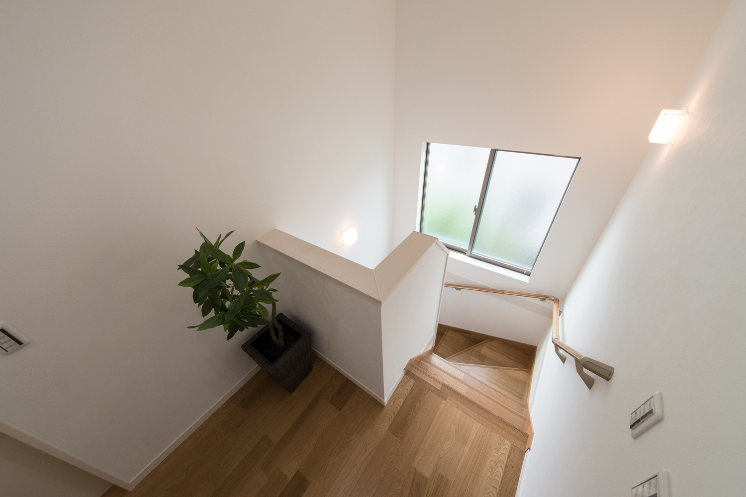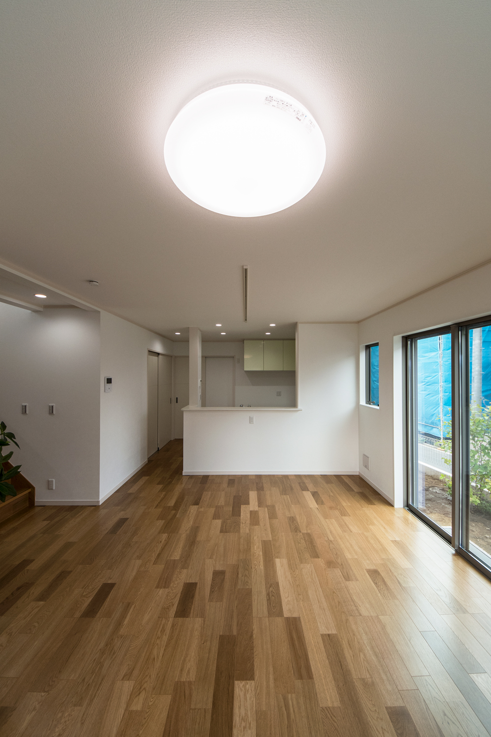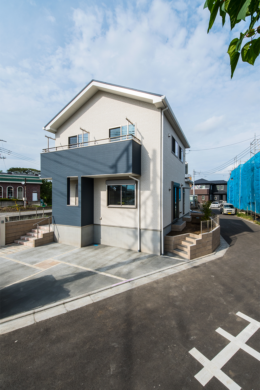 白を基調にアクアブルーのサイディングをアクセントにした、シンプルモダンな外観に仕上がりました。室内は、玄関と階段をリビングに直結させた、皆が自然と顔を合わせる家族思いの間取りとなっています。