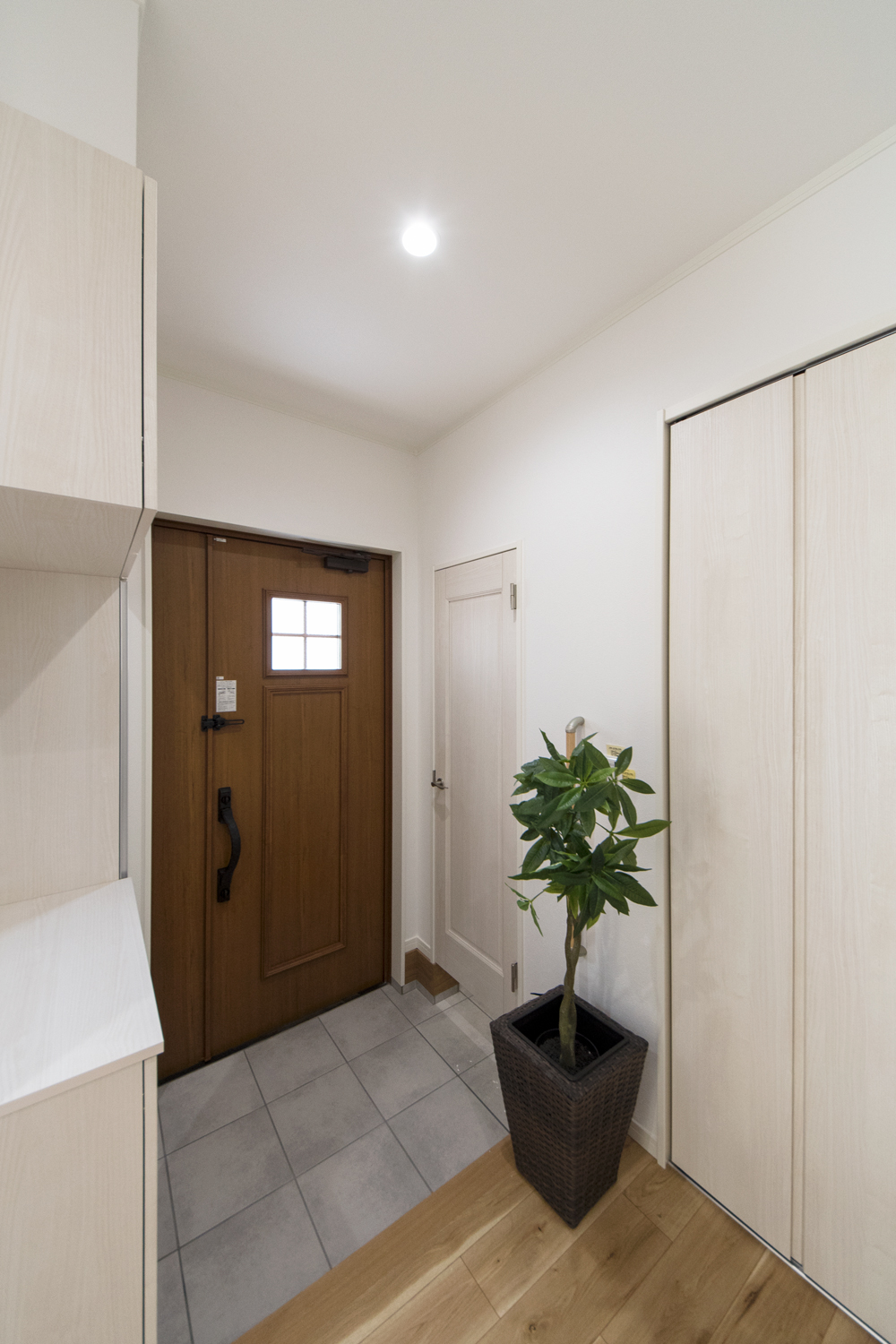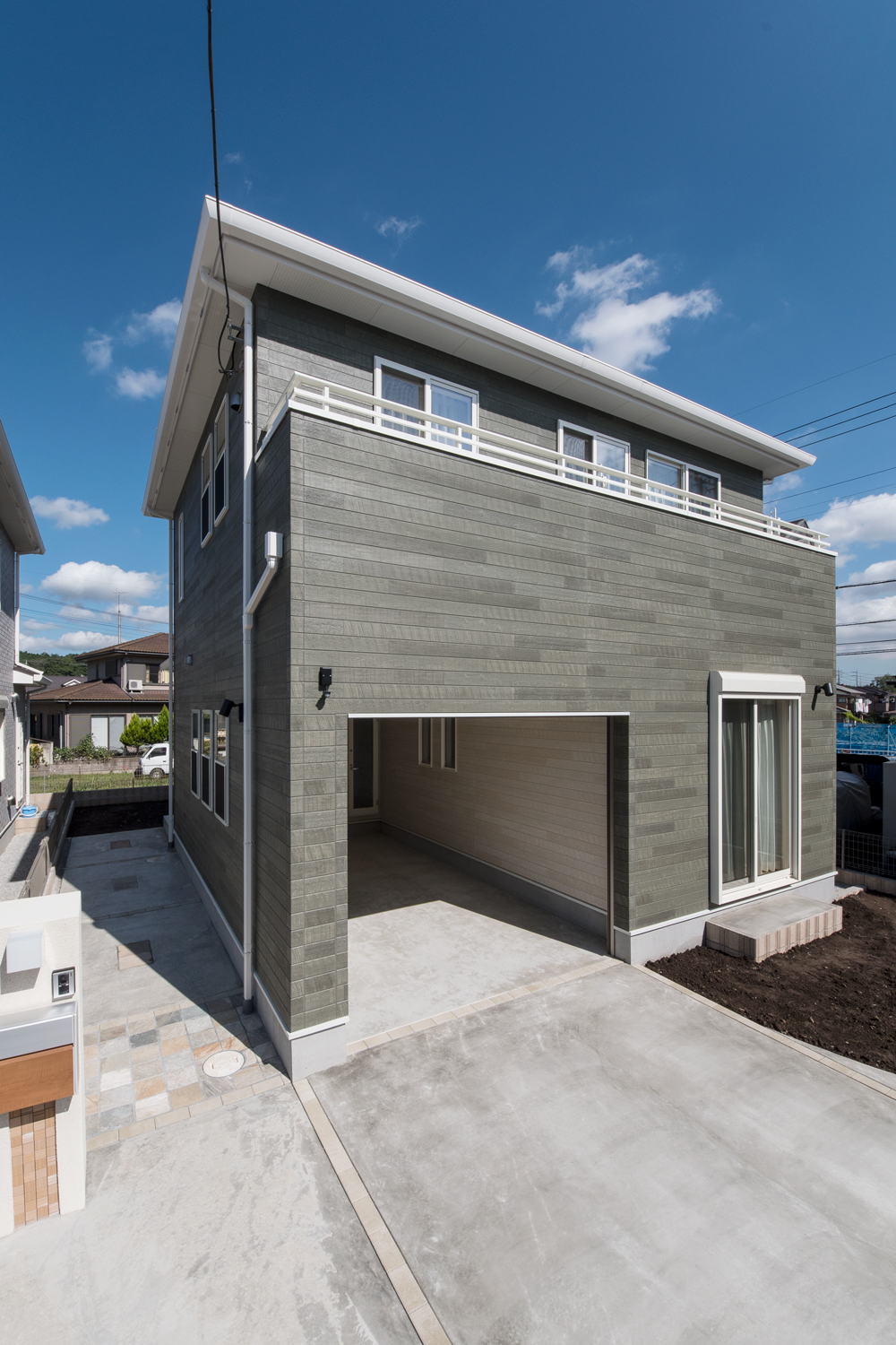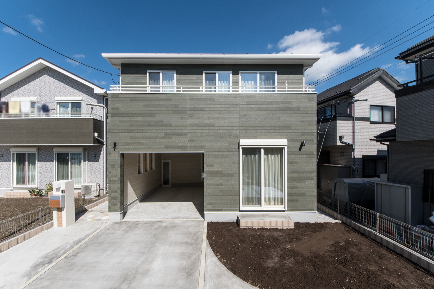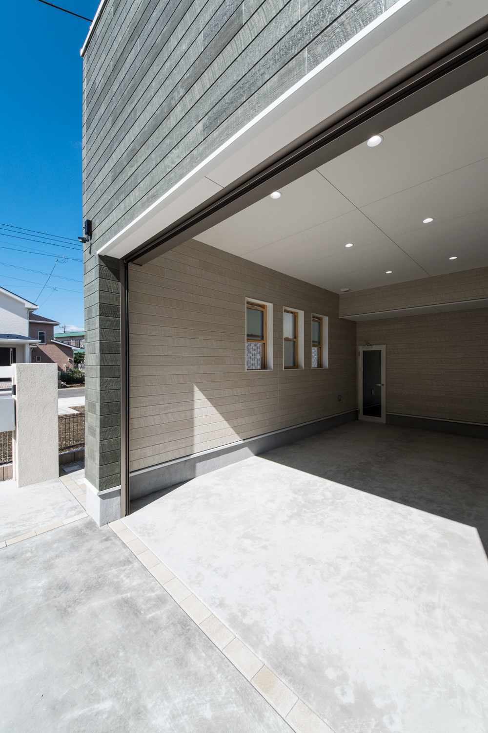 グリーンの木目調サイディングに白いサッシでアクセントをつけた北欧テイストの外観。止めるだけでなく愛車を鑑賞したり、いじったりして車を楽しむ事ができる、大人の秘密基地のような場所「ビルトインガレージ」のある住まいが完成しました。