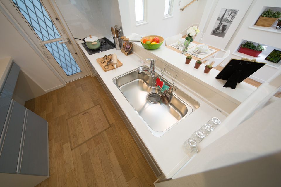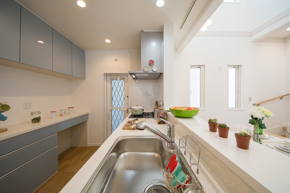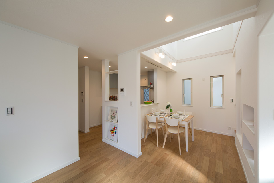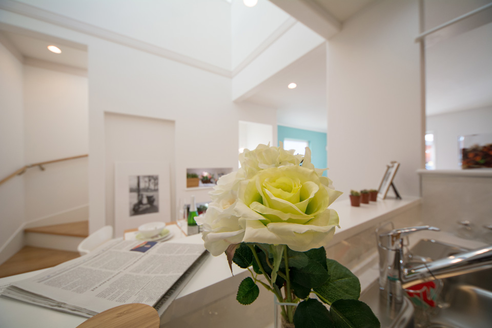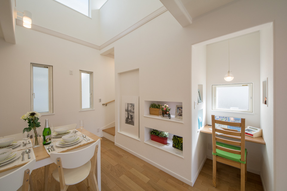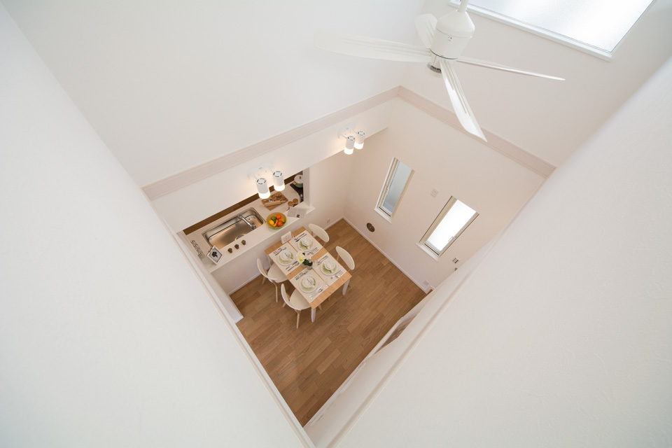 明るく開放感ある吹き抜け、スタディコーナーやミセスカウンターとして利用できる便利なカウンター、階段下も無駄なく収納。 デザインだけではなく機能性にもこだわった心地よい空間。 光あふれるリビングダイニングで家族の絆を育みます。