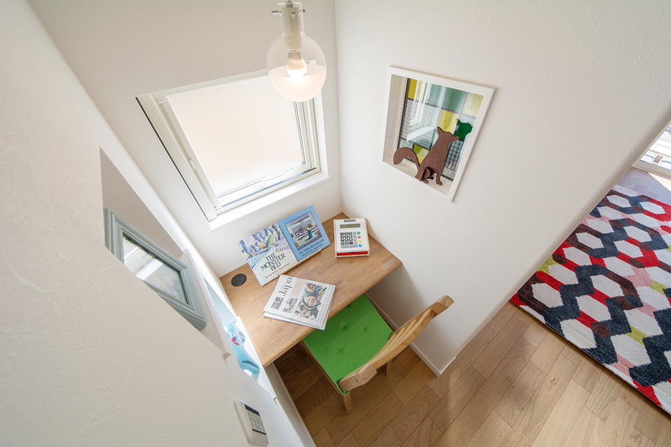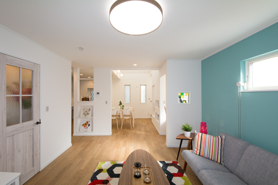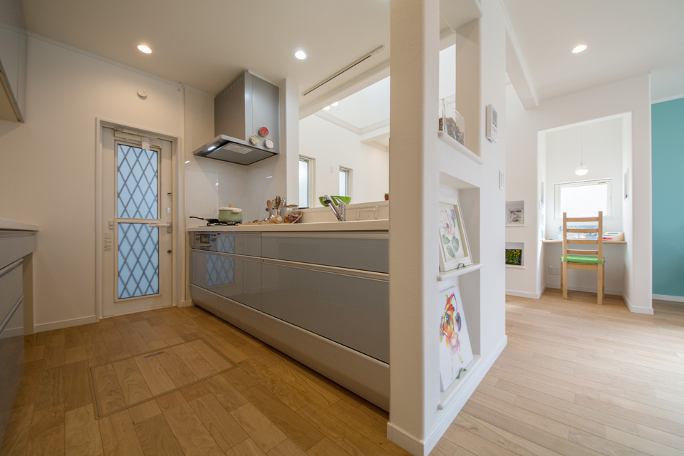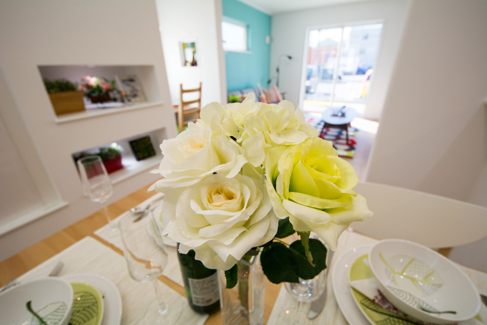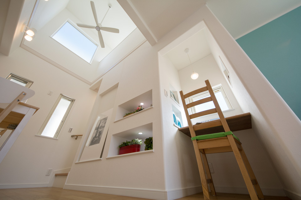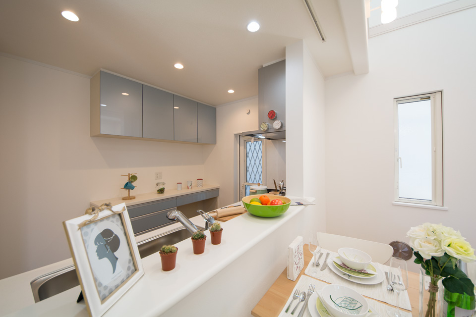 明るく開放感ある吹き抜け、スタディコーナーやミセスカウンターとして利用できる便利なカウンター、階段下も無駄なく収納。 デザインだけではなく機能性にもこだわった心地よい空間。 光あふれるリビングダイニングで家族の絆を育みます。