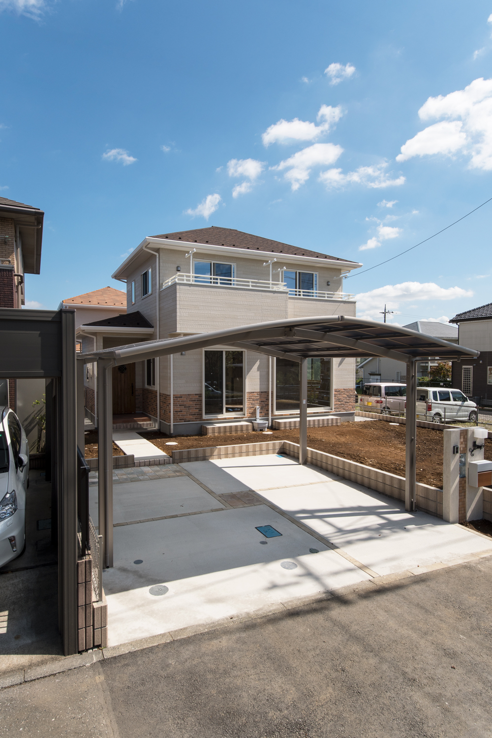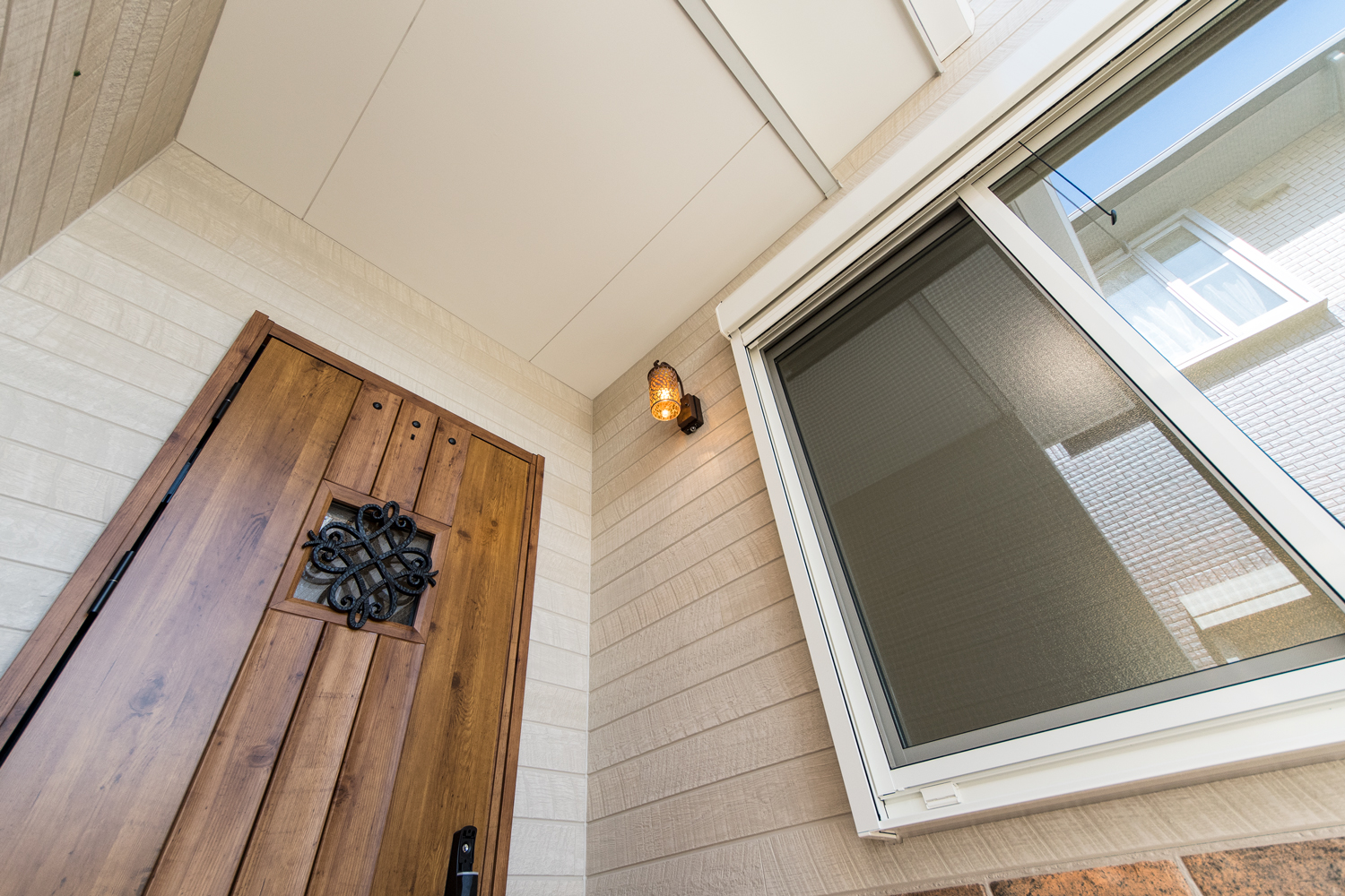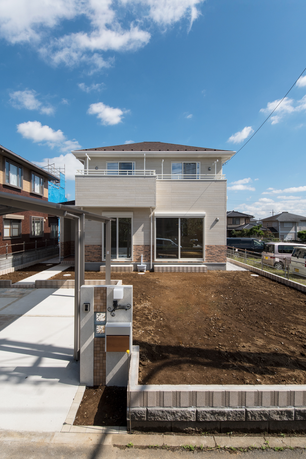 白い木目調に明るいブリック調のサイディングでアクセントを付けた、温かみのあるナチュラルテイストな外観。