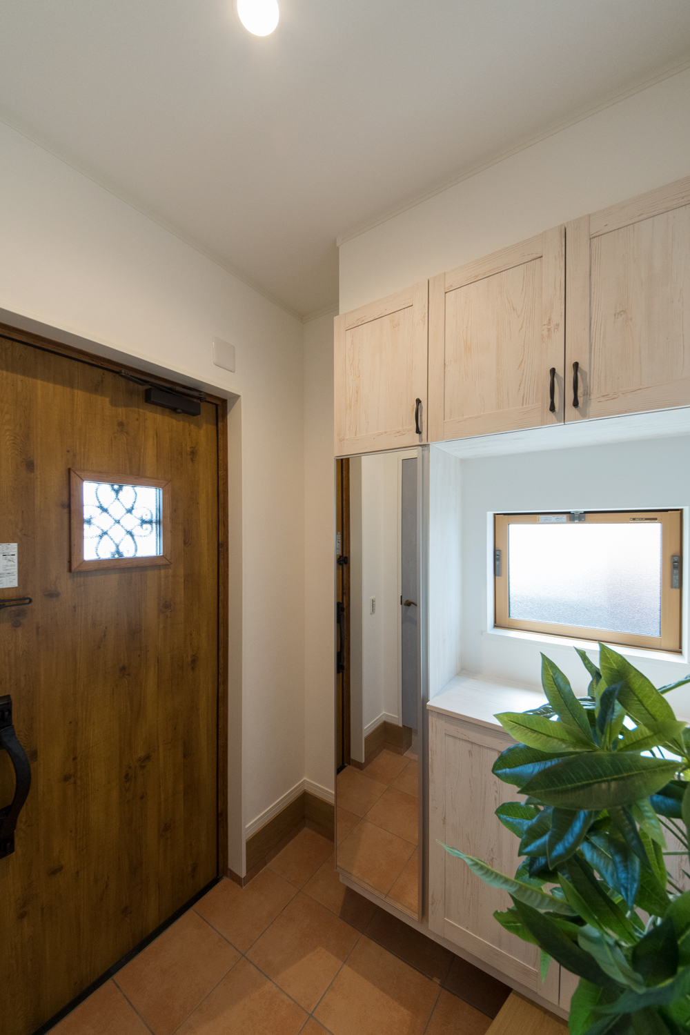 アンティーク調の玄関ドアとシャビーシックな白い玄関収納。