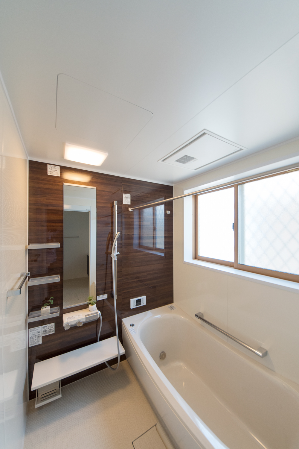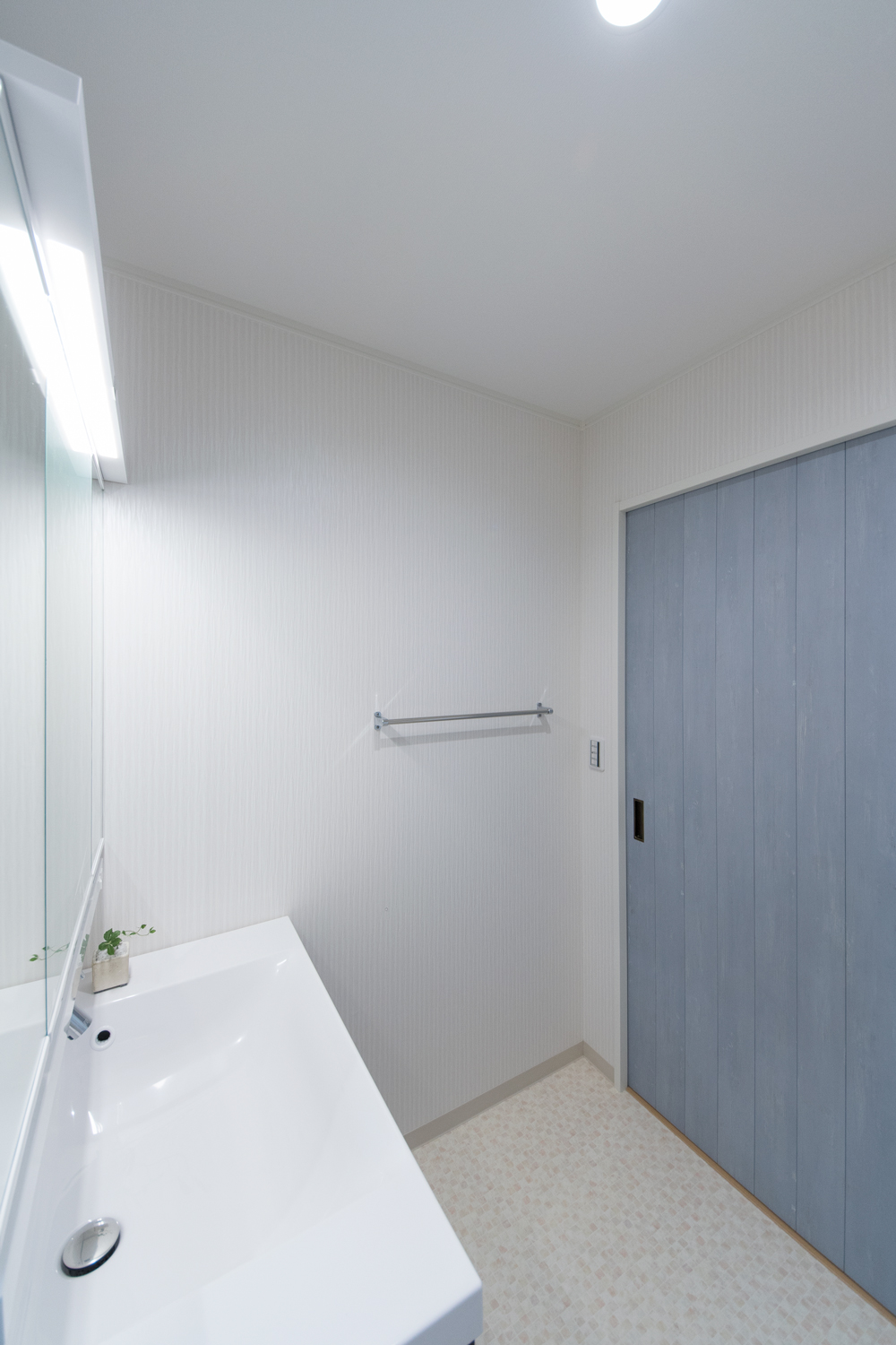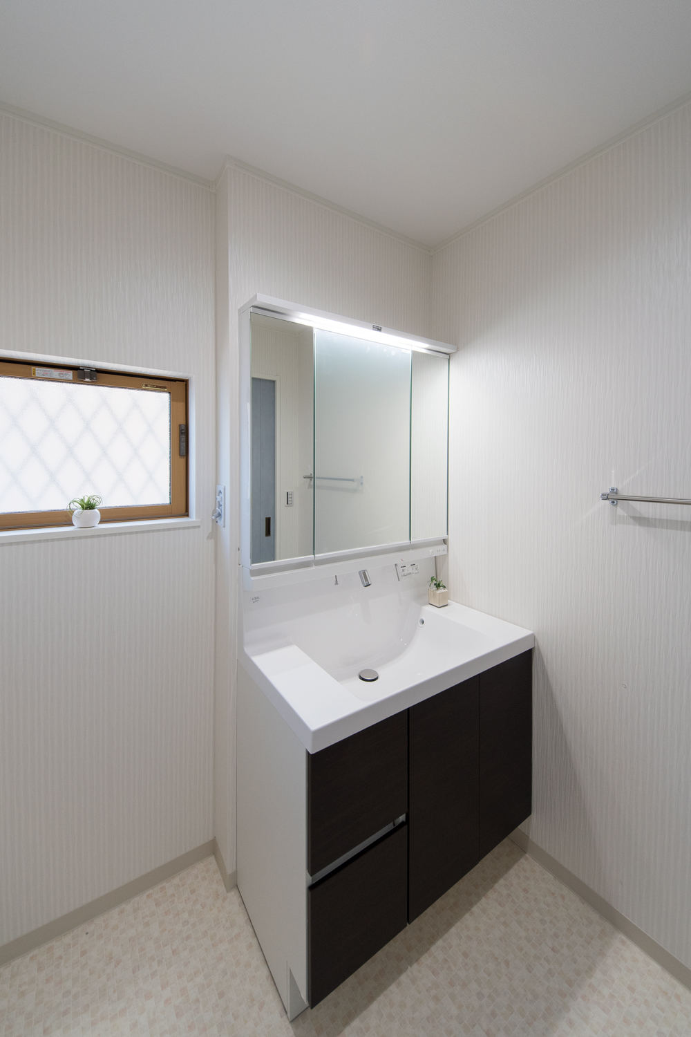 白を基調とした清潔感のあるサニタリールーム。洗面化粧台扉をダークブラウンでアクセントに。
