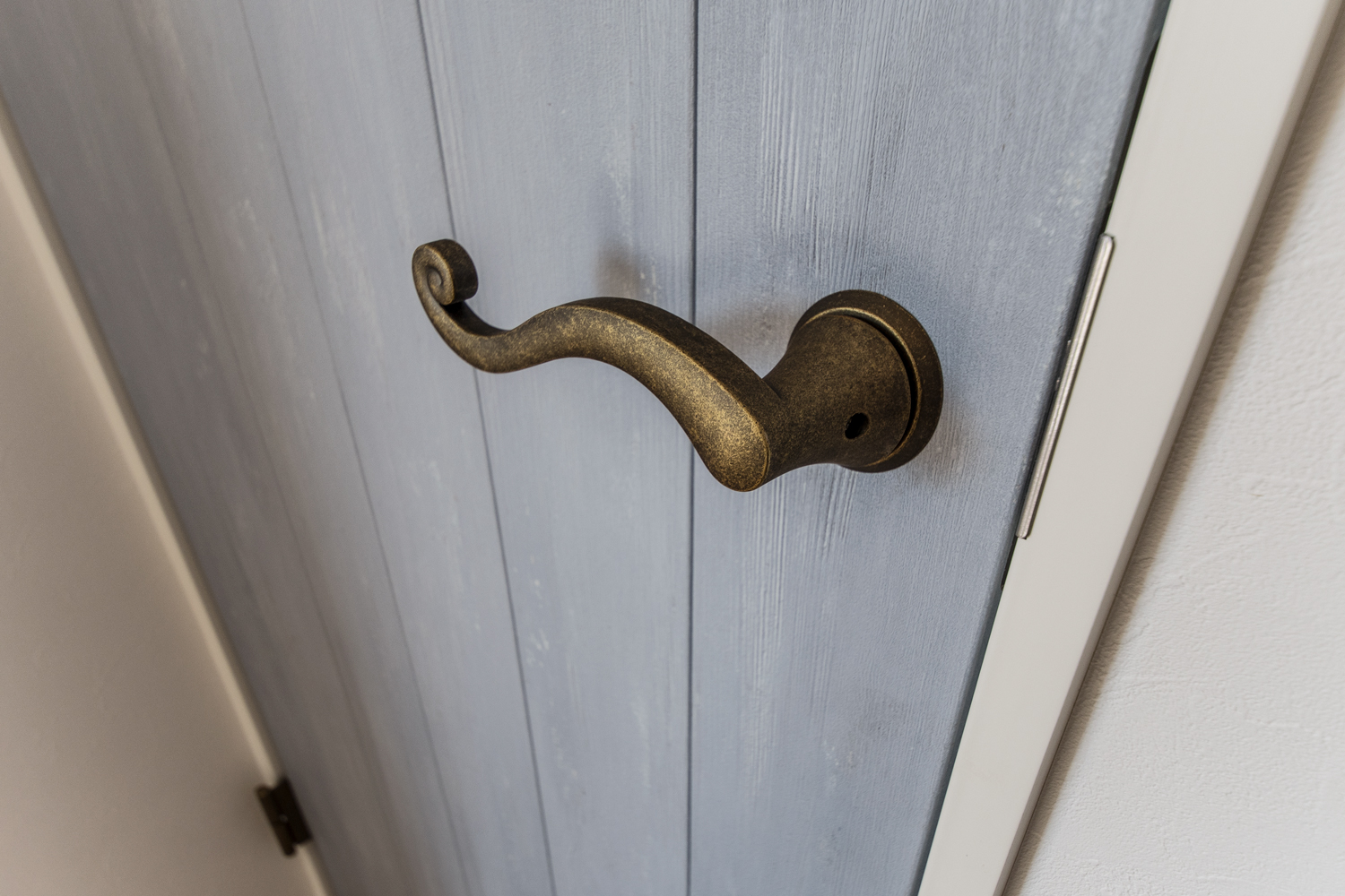 エイジング加工された、ブルーペイントのドア。ハンドルは、アンティーク調のゴールドを合わせ上質な印象に。