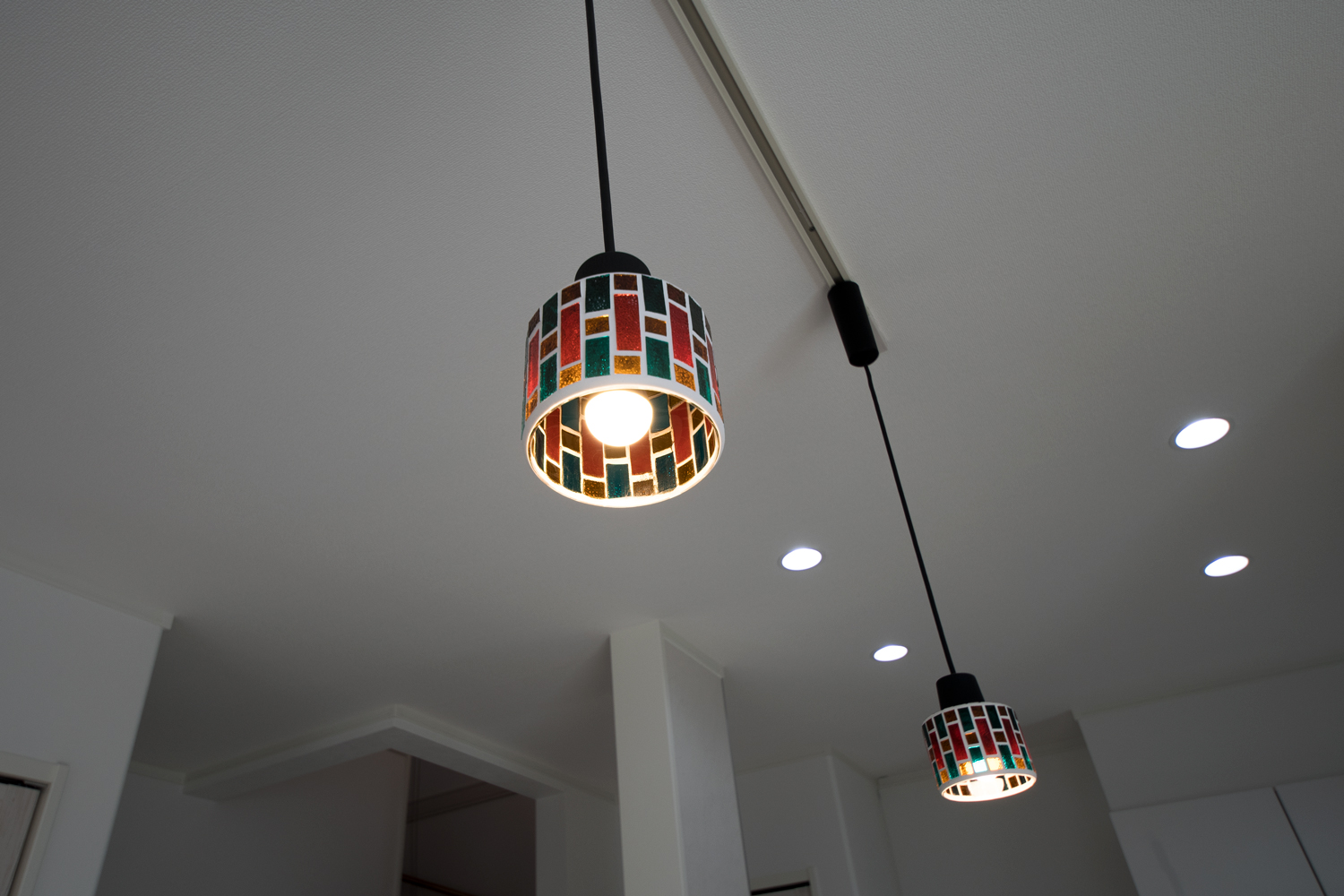 ガラスモザイクのペンダントライト。色とりどりの光が空間を表情豊かに彩ります。
