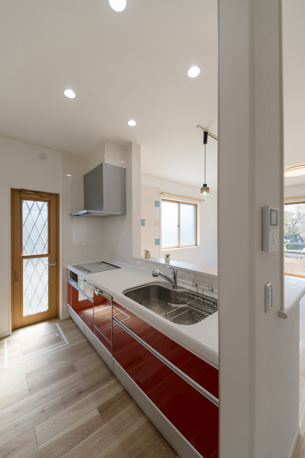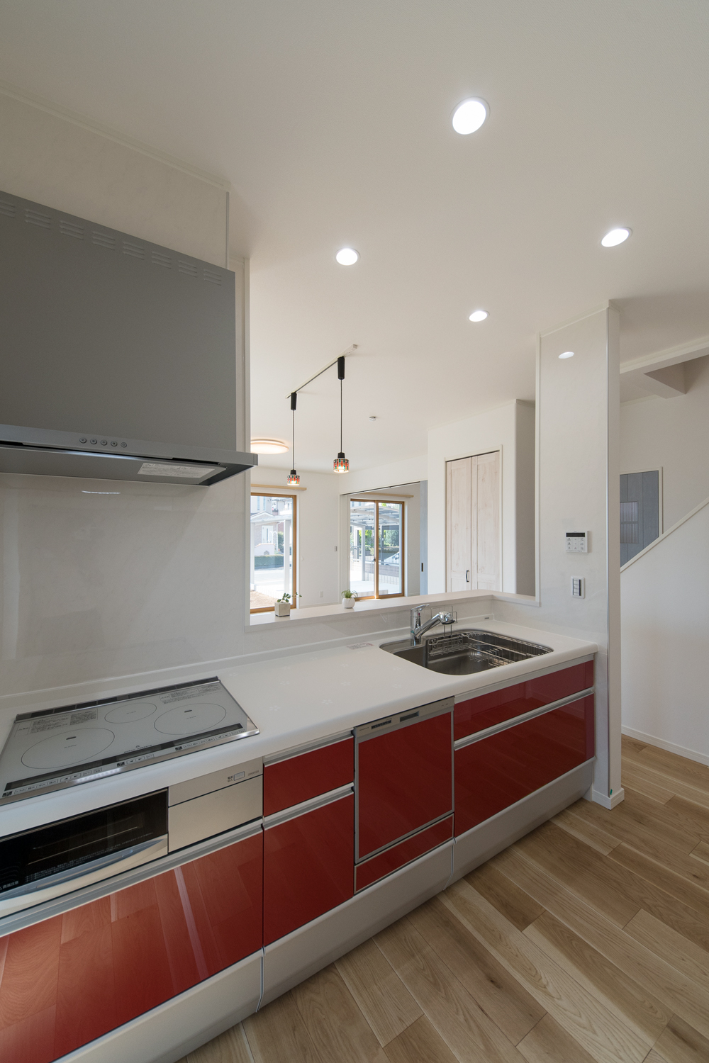 光沢のある赤をアクセントカラーに。元気をくれてあたたかい気持ちになるキッチン。