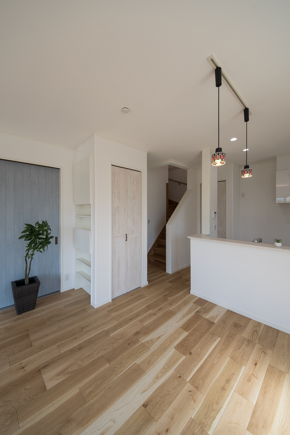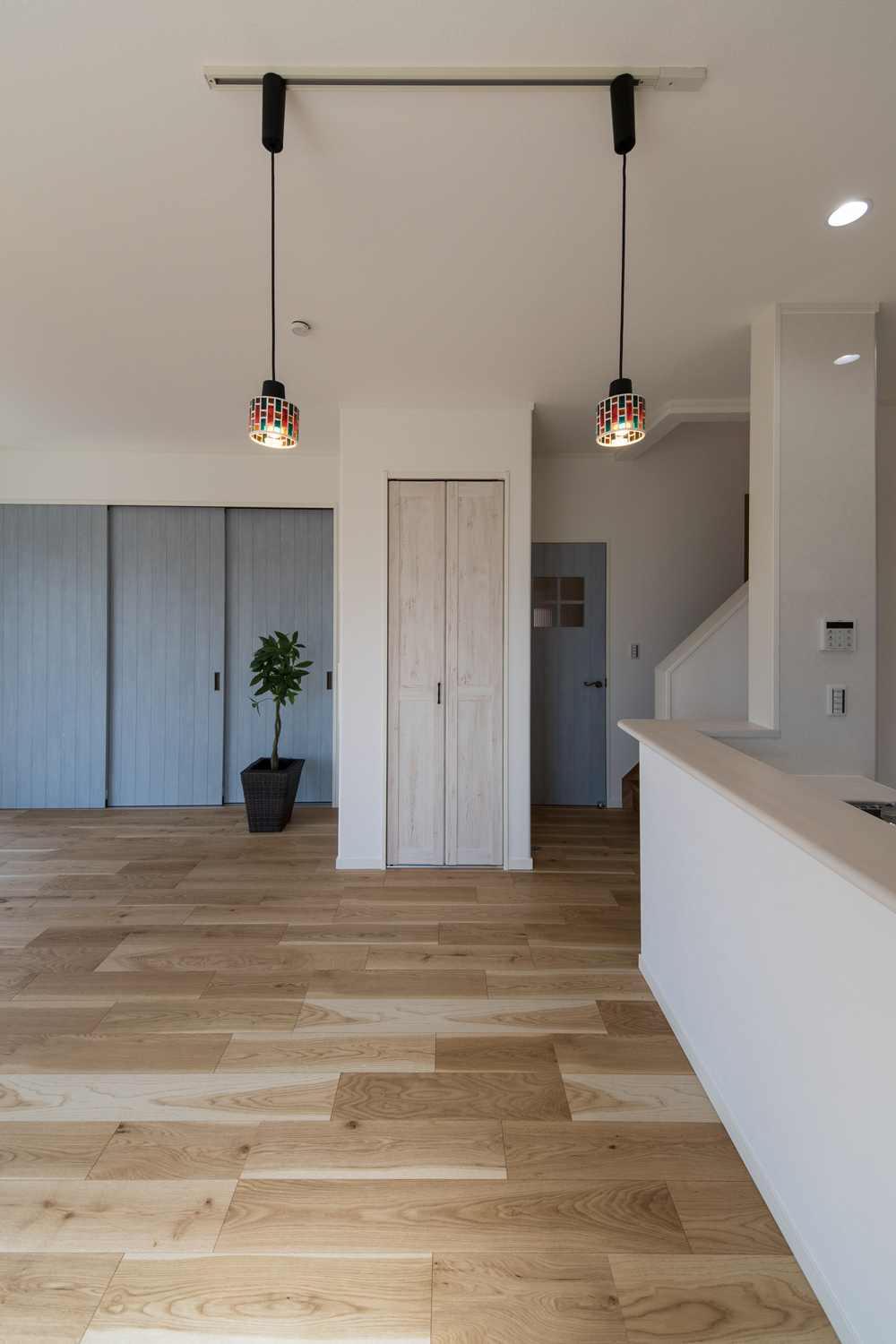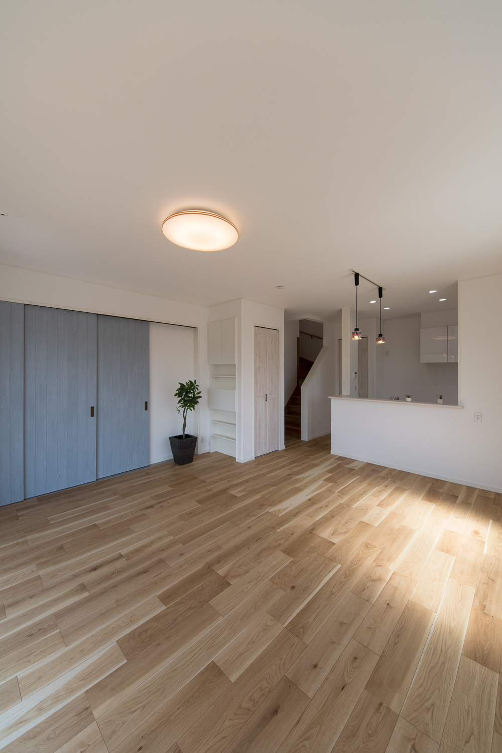 ナラ樫のフローリング。くっきりとした木目と淡い色合いは北欧テイストにマッチ。