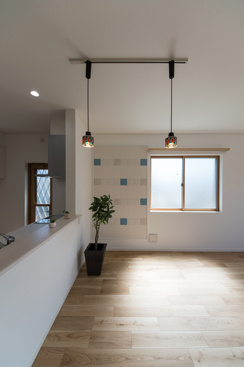 ポップなデザインの、インテリア壁材「エコカラット」を施しました。空気を美しく整える効果があります。