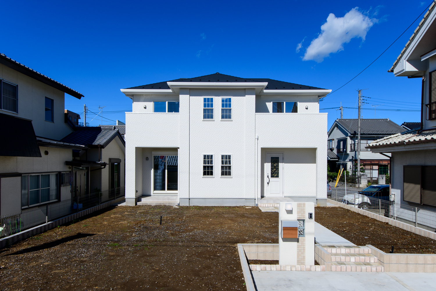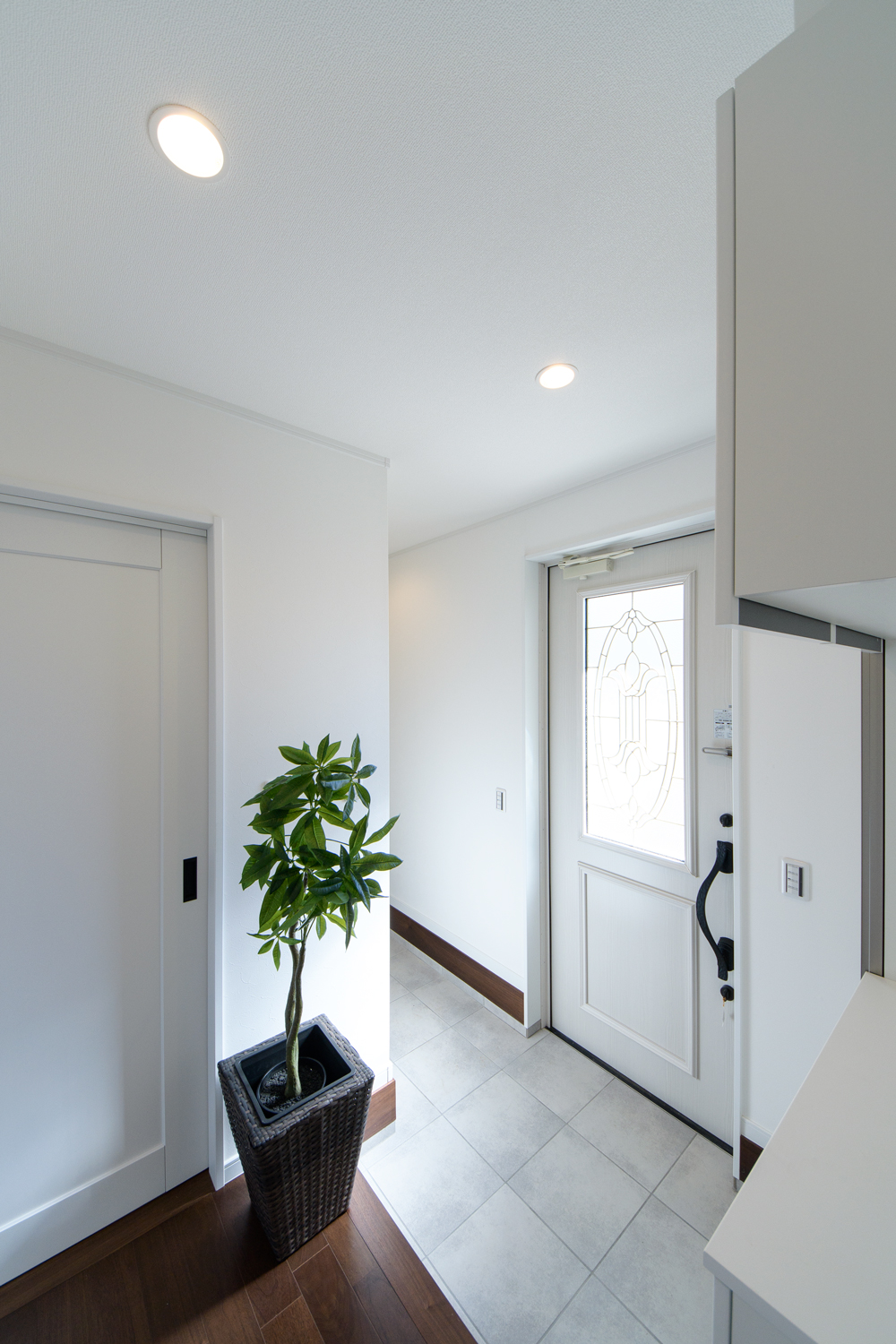 白い外壁に、上部に大きなガラスを配したフレンチテイストの白い玄関ドアがお迎えします。