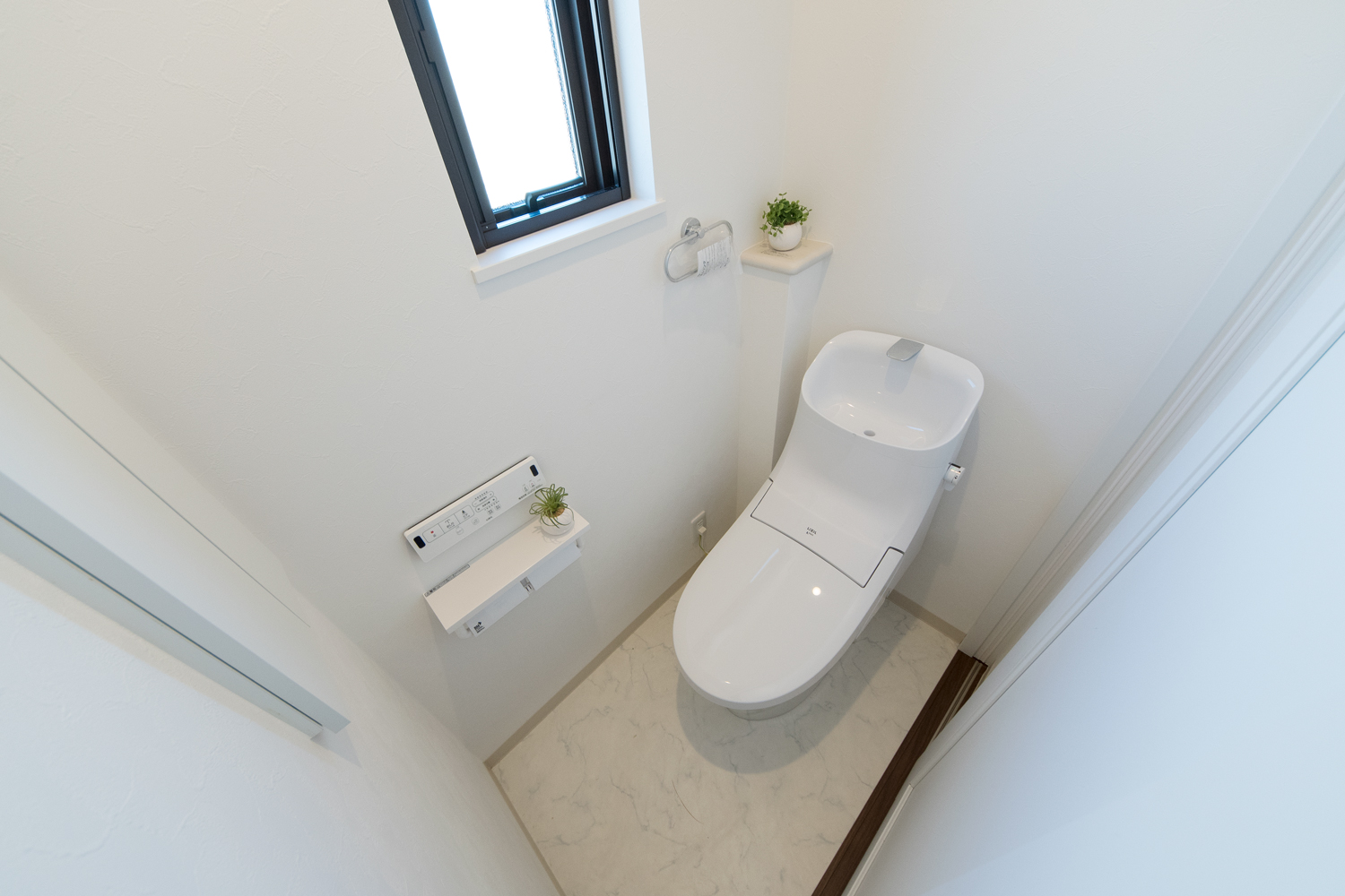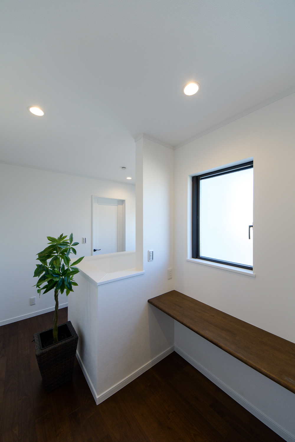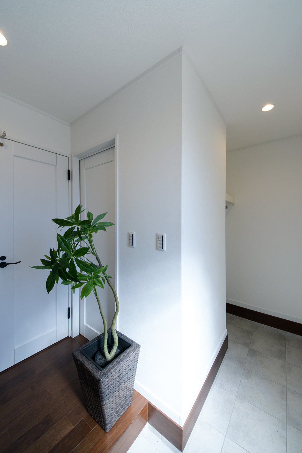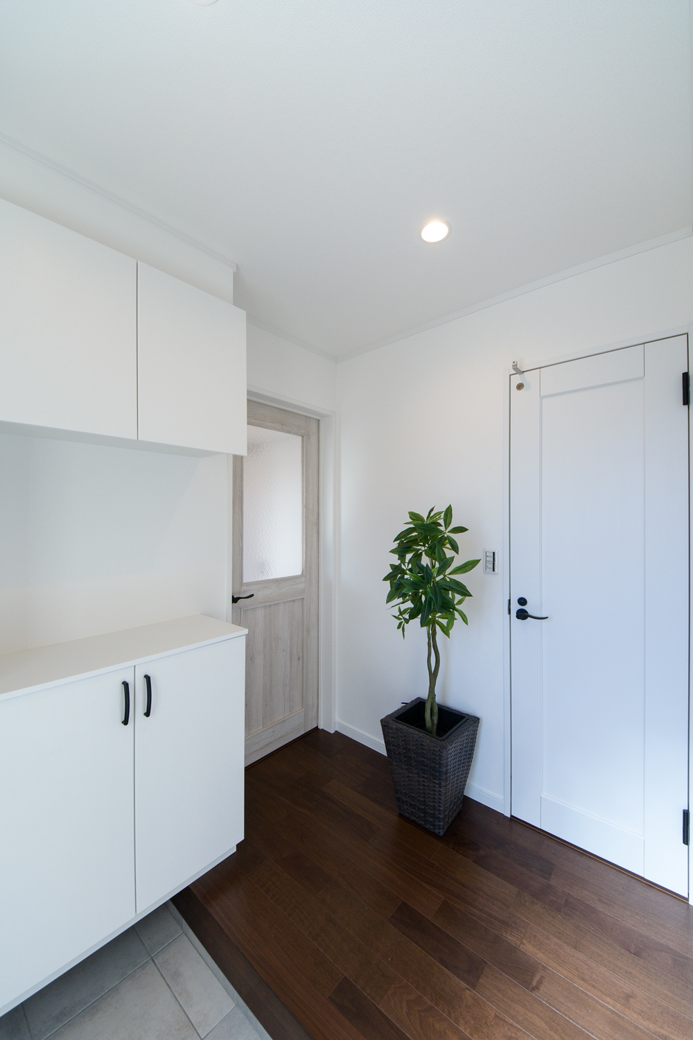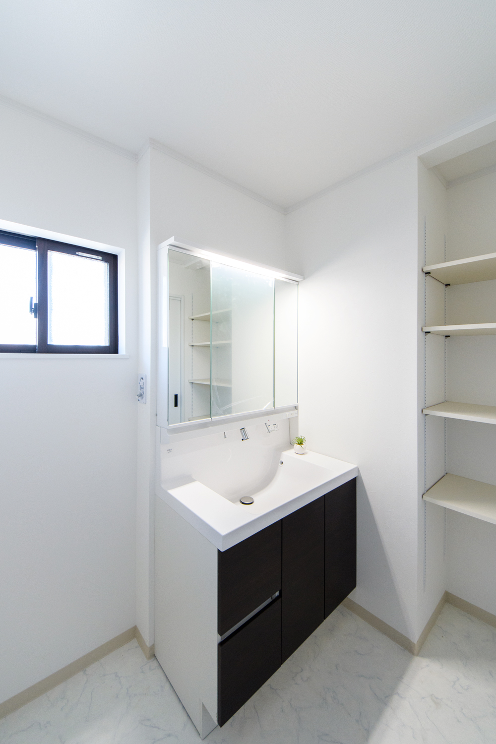 白を基調とした清潔感のあるサニタリールーム。洗面化粧台扉をダークブラウンでアクセントに。