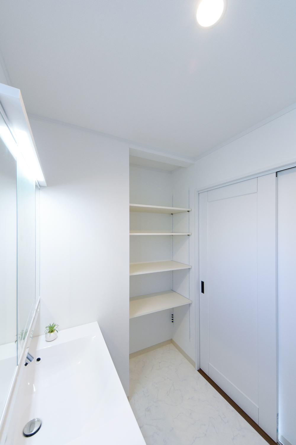 タオルや洗剤等をたっぷり収納できるリネン棚を設置したサニタリールーム。