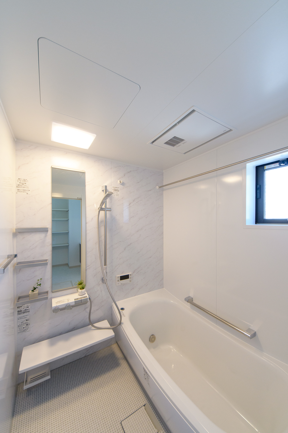 大理石をモチーフにしたホワイトのアクセントパネルが、シンプルながら高級感のある空間を演出します
