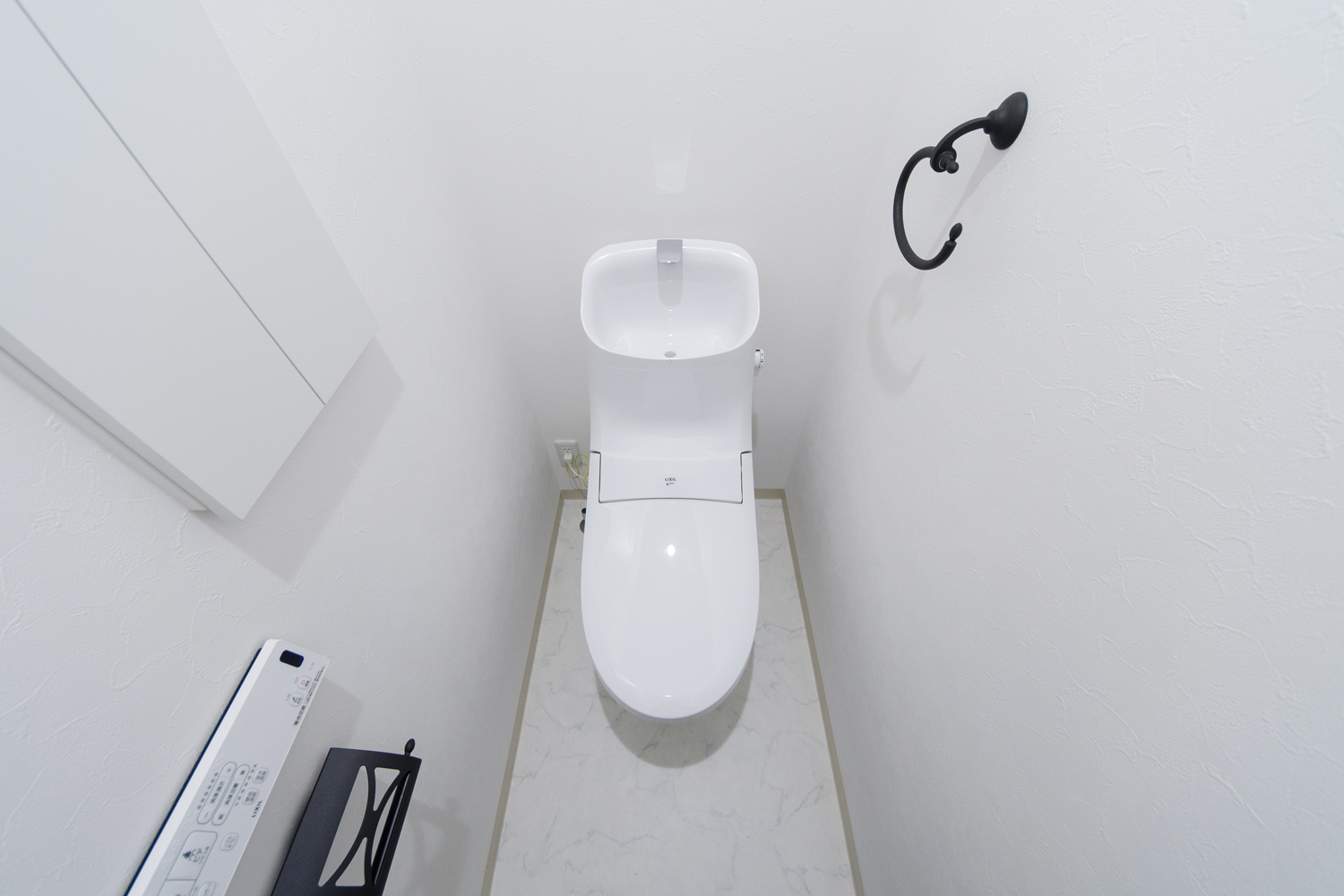 1階トイレ/ペーパーホルダーとタオル掛けをアイアン調のデザインにしました。
