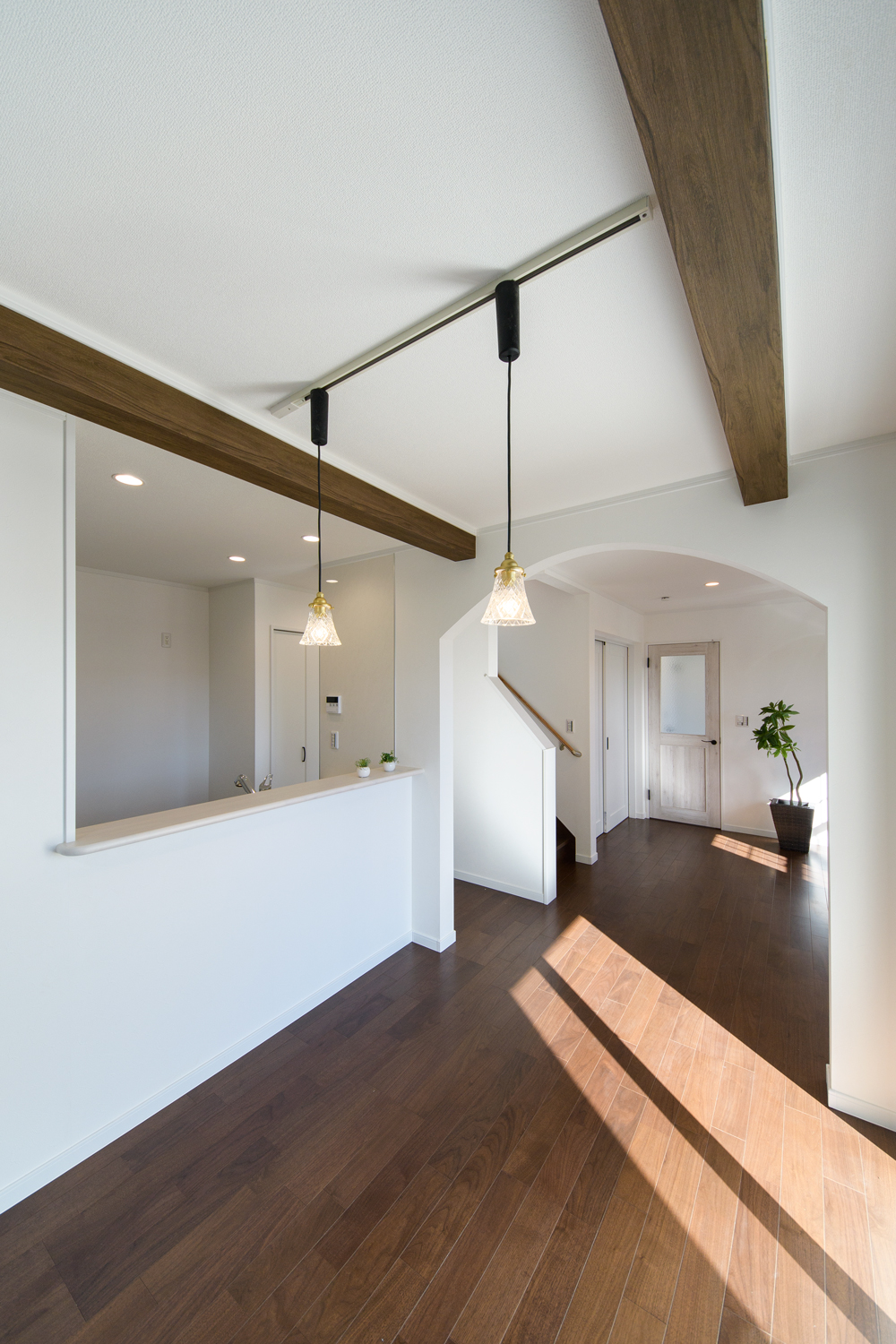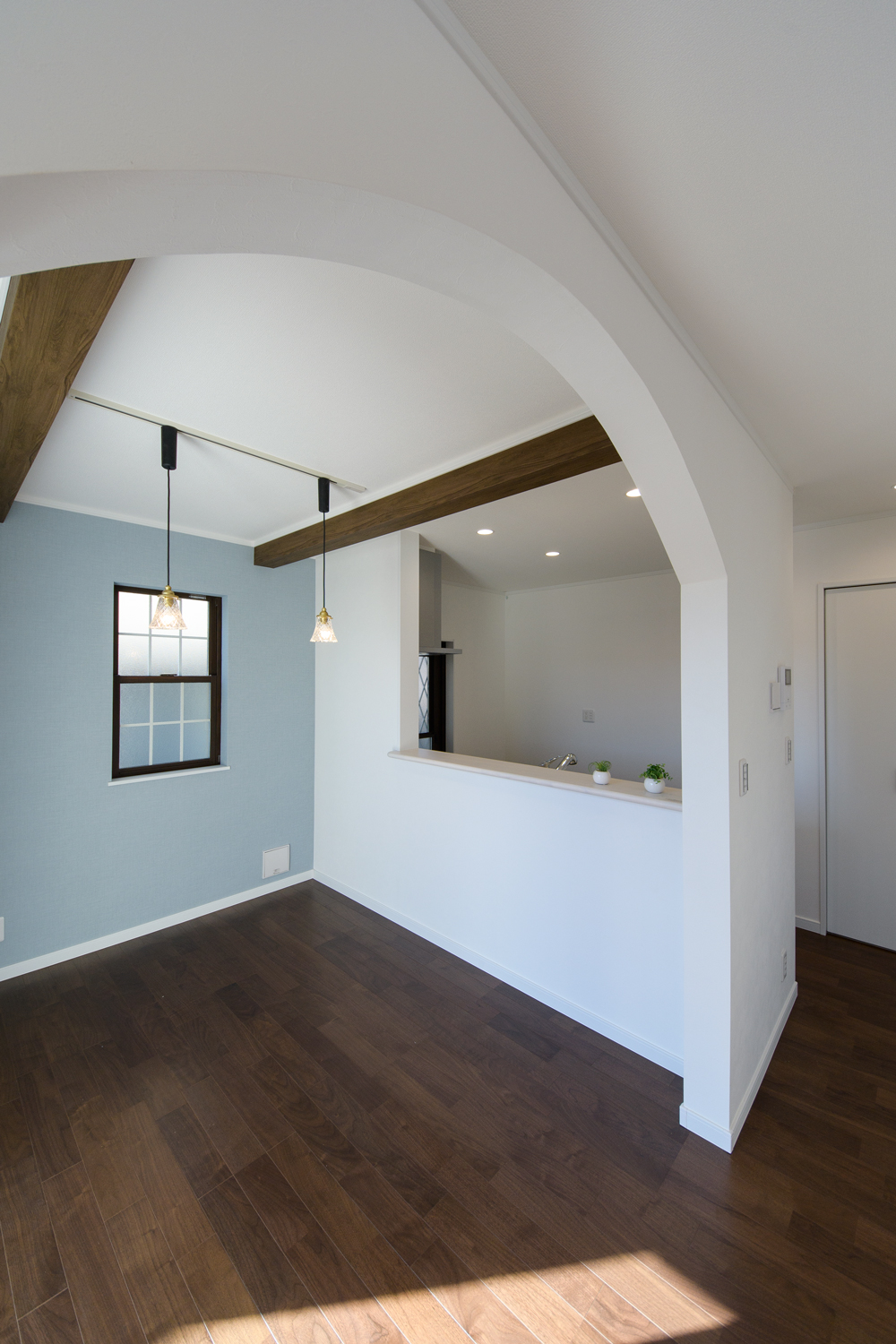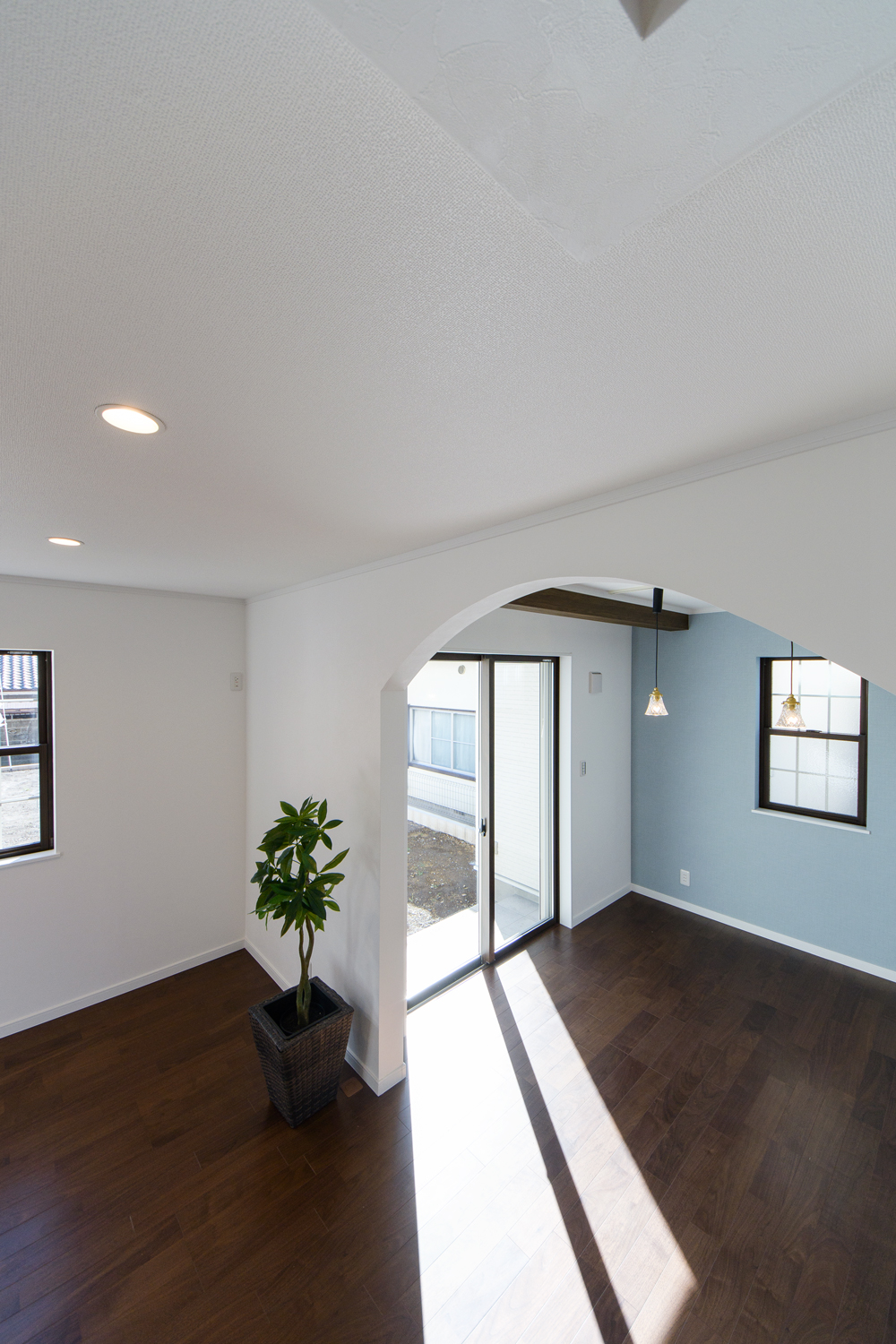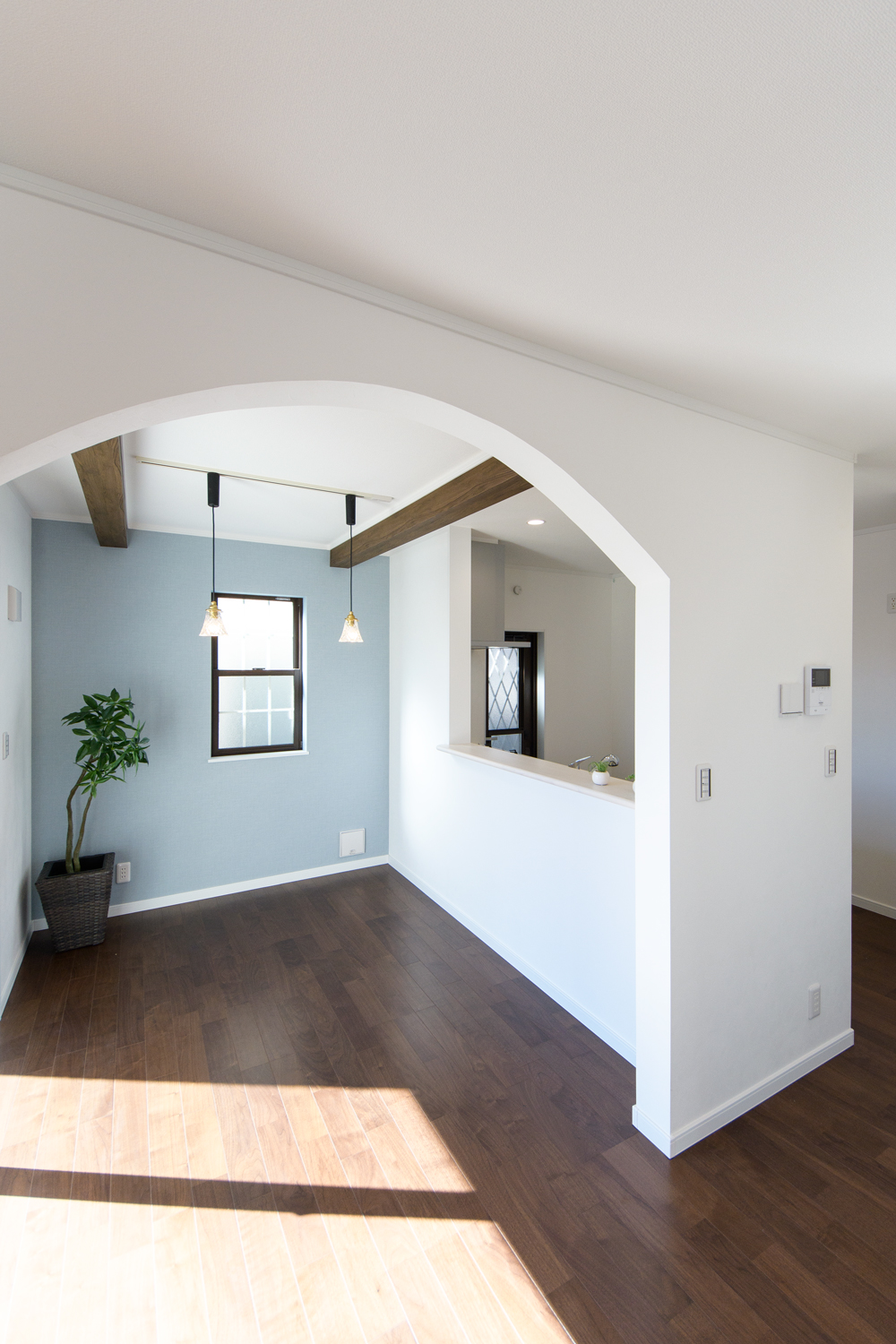 リビングとダイニングの間に施した、可愛らしいアーチ型の下り壁が空間のアクセントになっています。