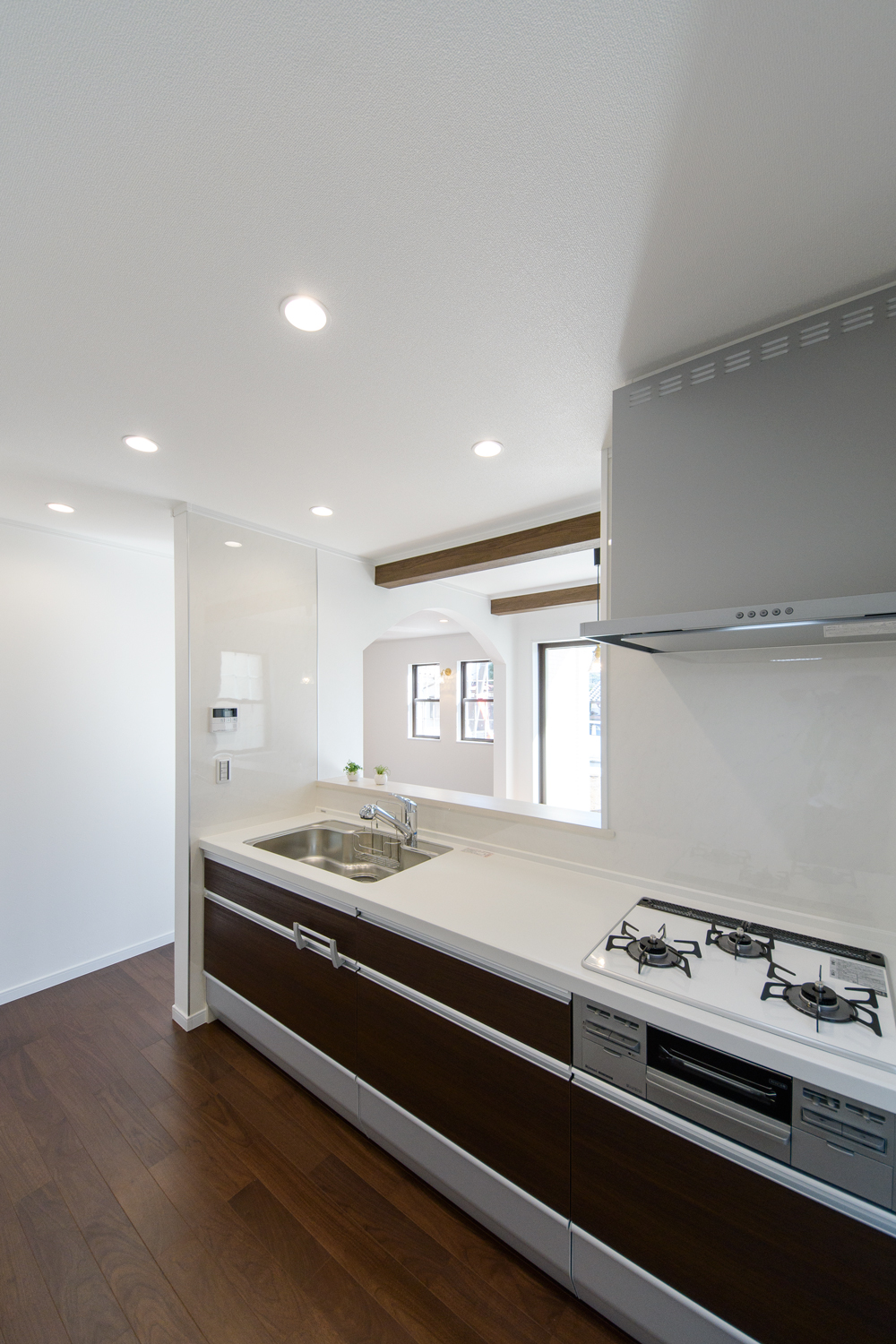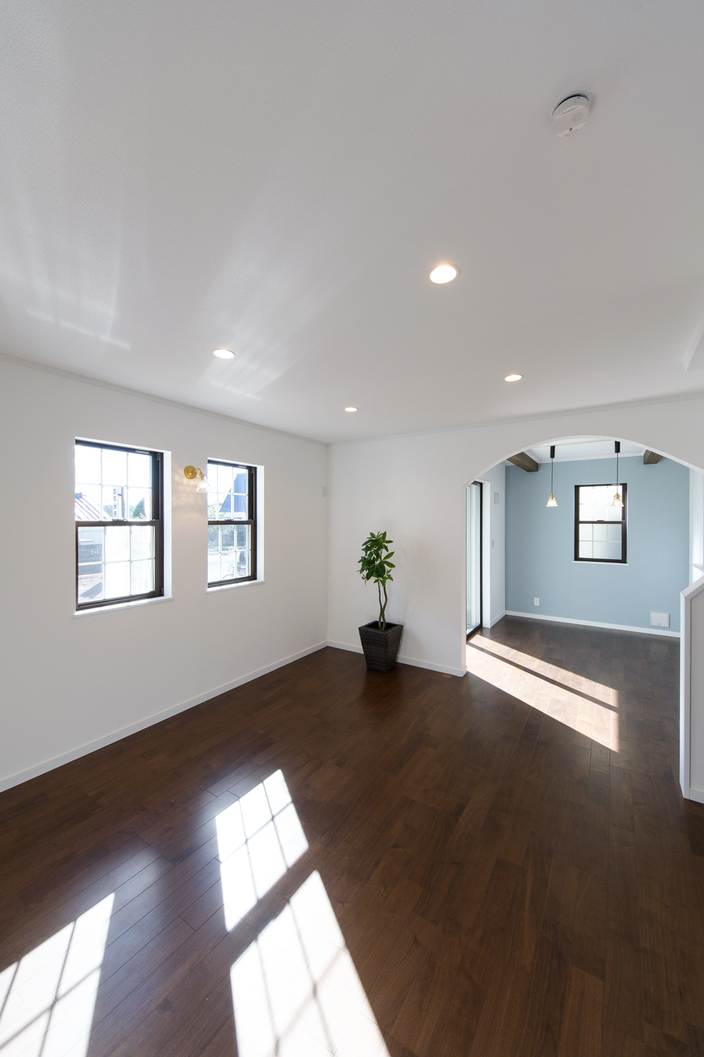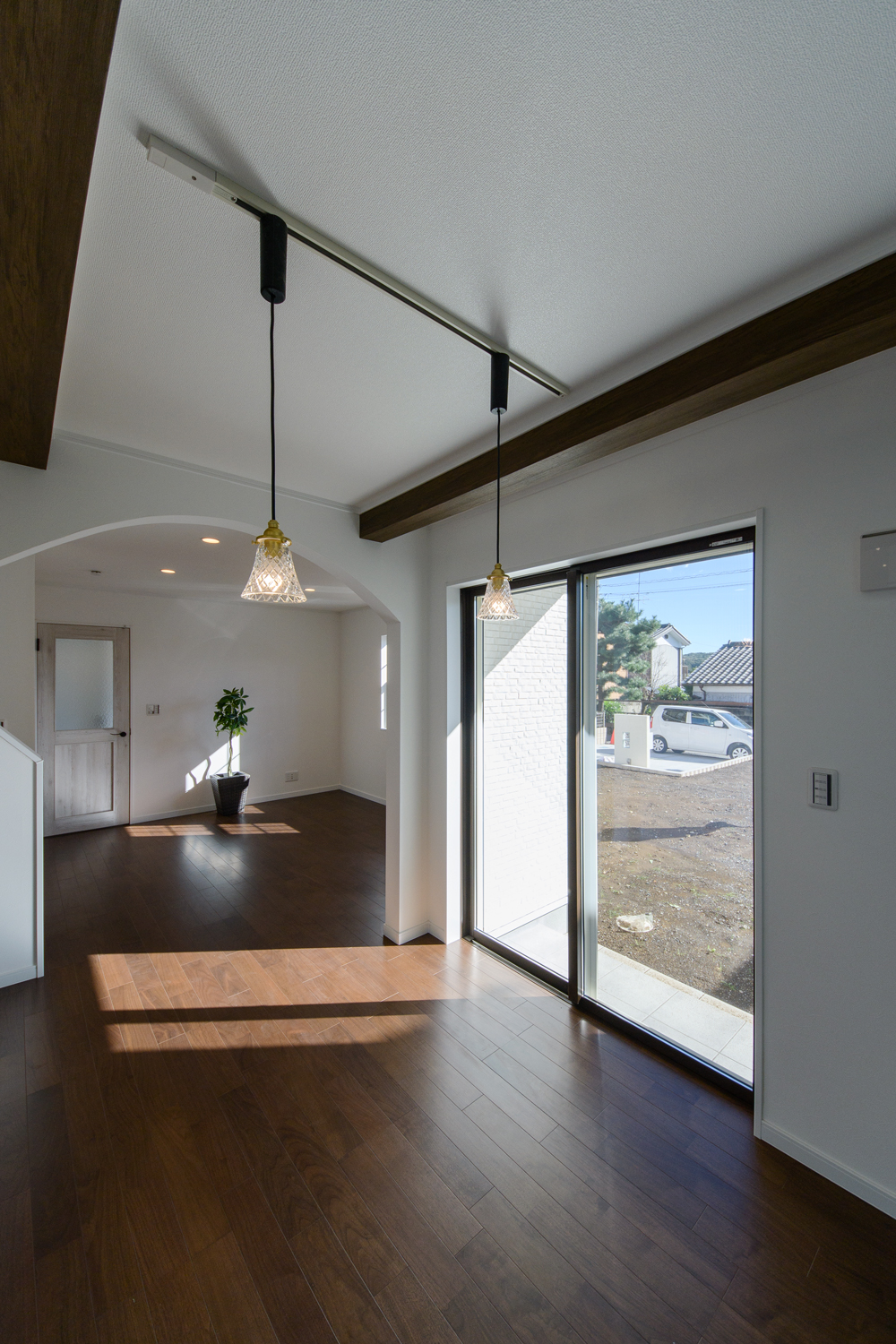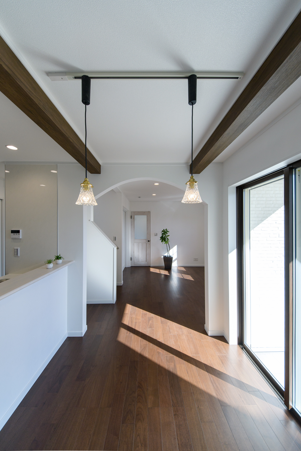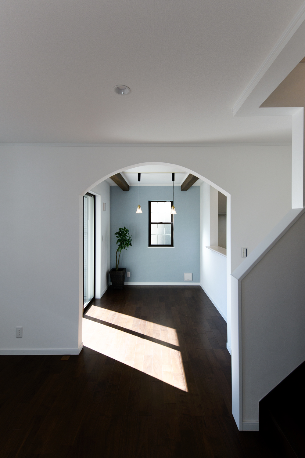 リビングとダイニングの間に施した、可愛らしいアーチ型の下り壁が空間のアクセントになっています。
