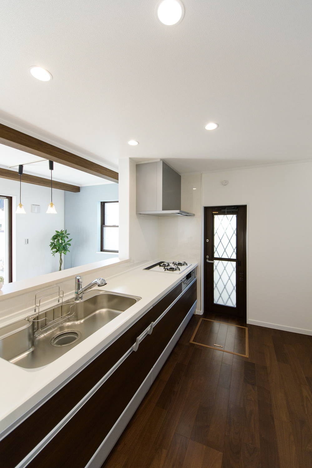 白を基調とした清潔感あるキッチン。キッチン扉をダークカラーにし、空間にアクセントをつけました。