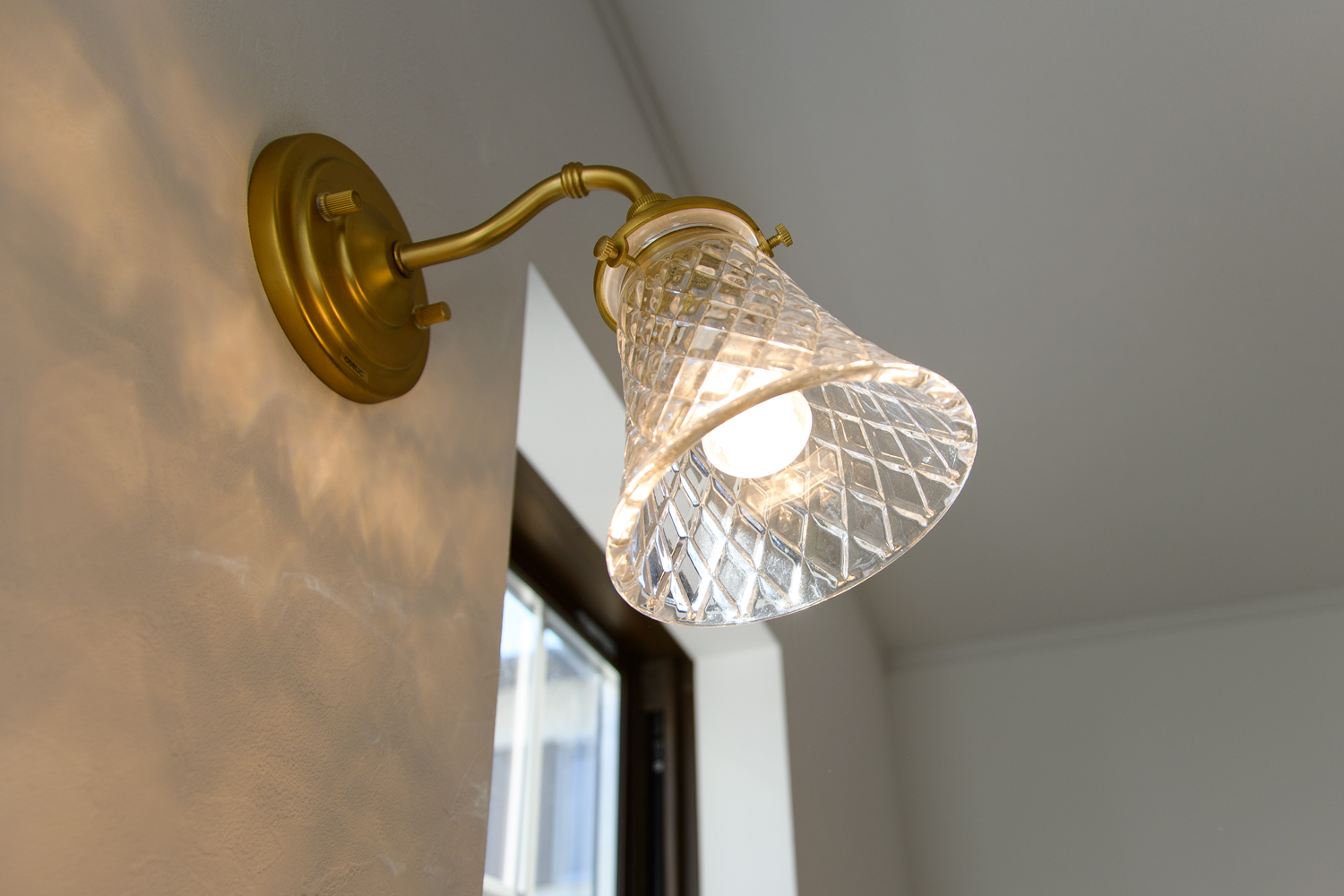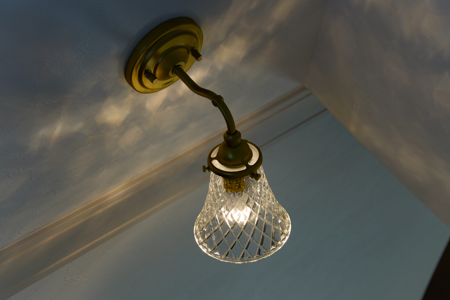 繊細なカッティングが美しいガラスの照明が空間を彩ります。
