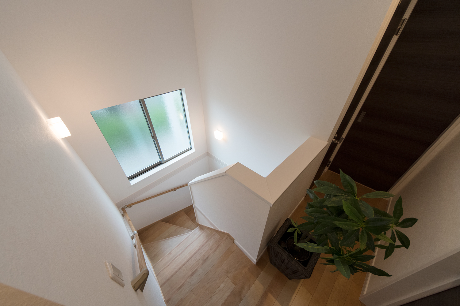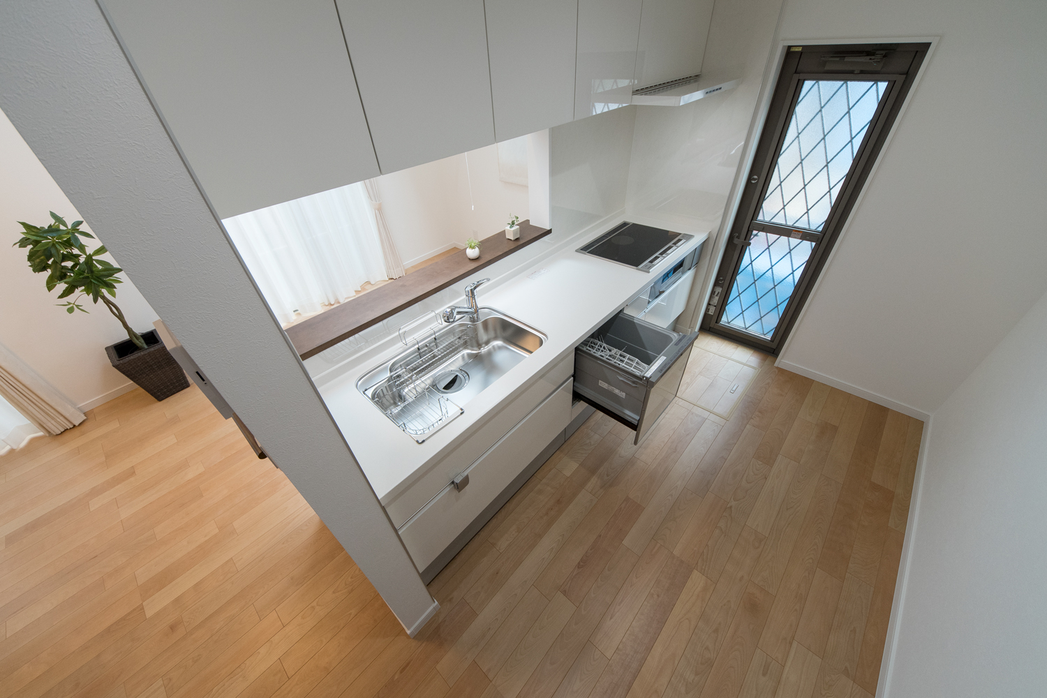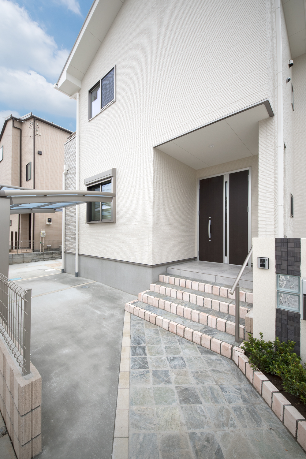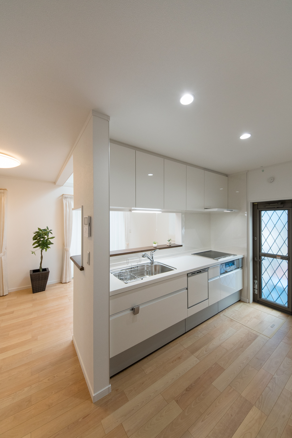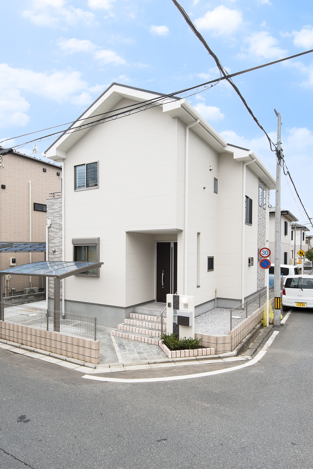 白をベースにグレーの石目調サイディングをアクセントにした、ナチュラル&モダンな外観。勾配天井に天窓を設えたダイニングは、光のあふれる空間となり、目覚めの良い朝を迎える明るいダイニングが完成しました。