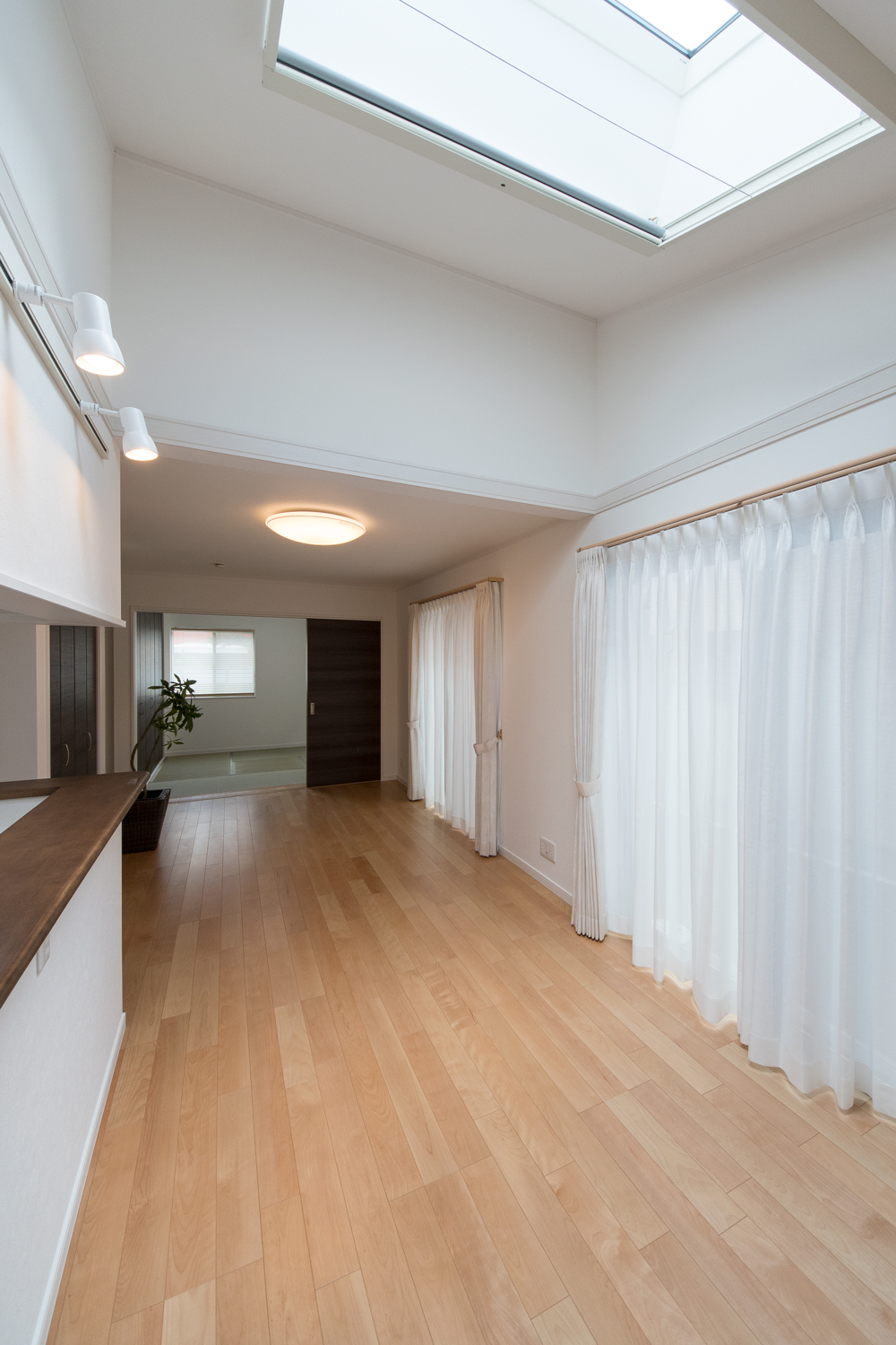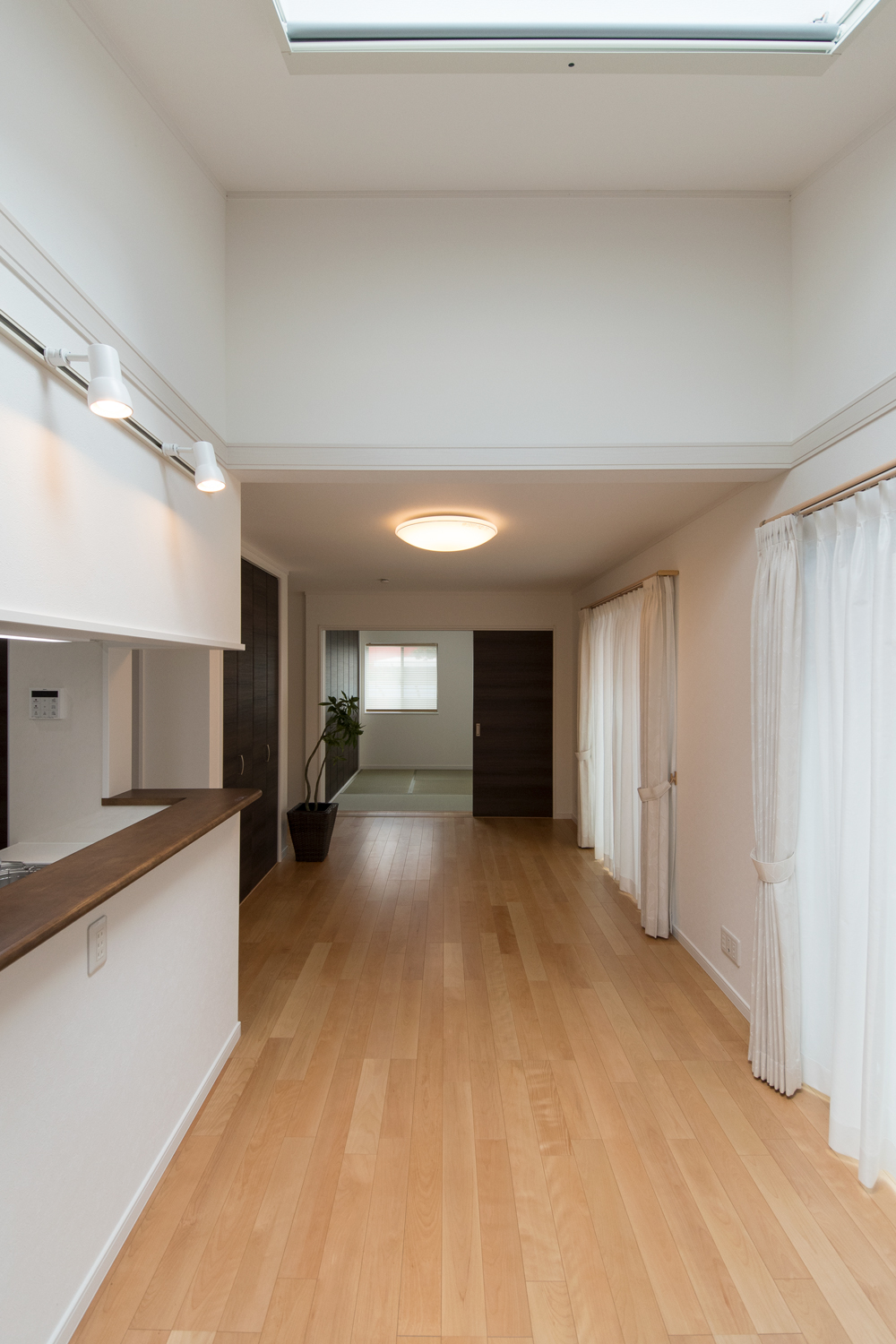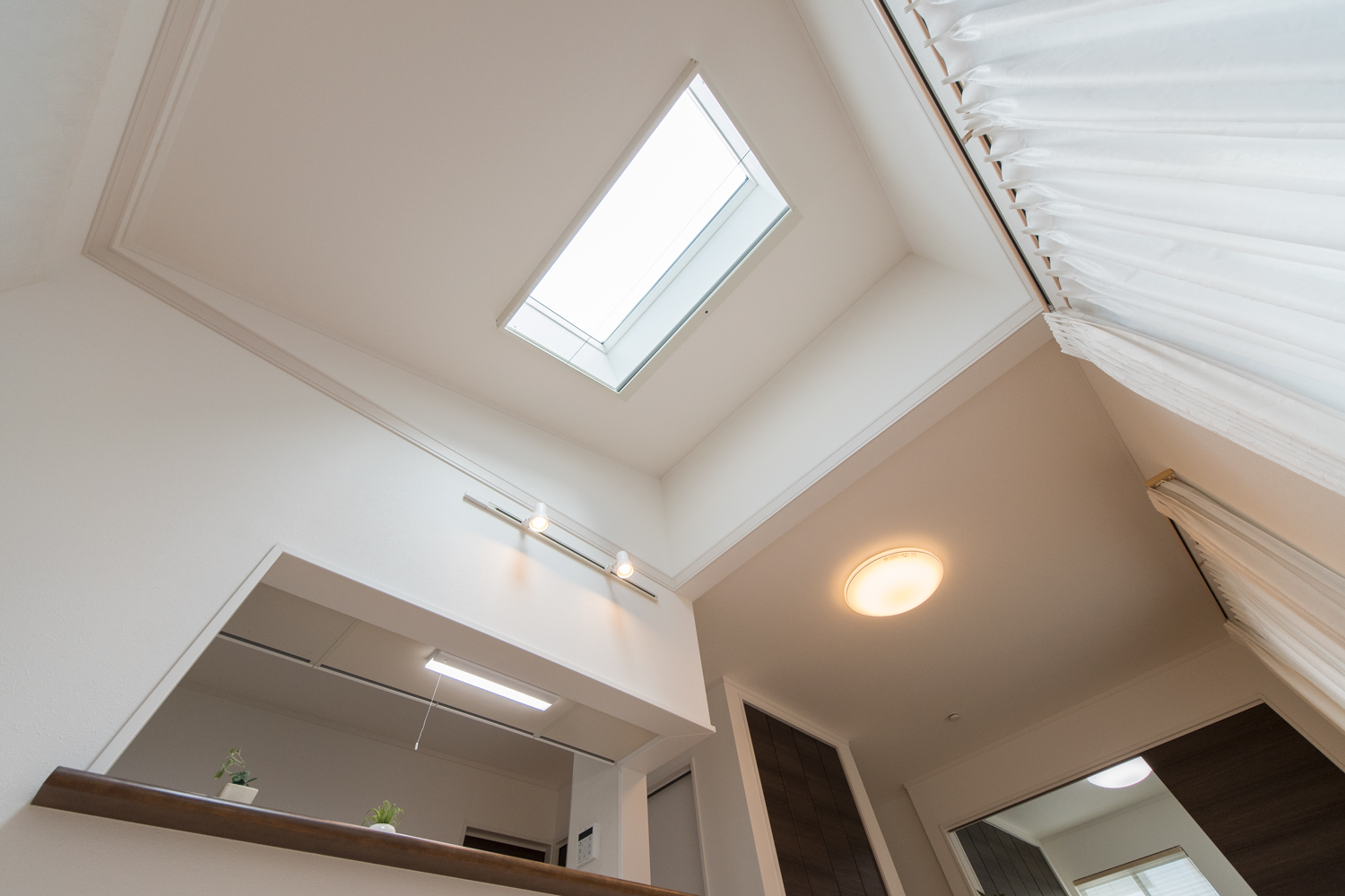 勾配天井に天窓を設えた、光のあふれる空間 目覚めの良い朝を迎える明るいダイニング